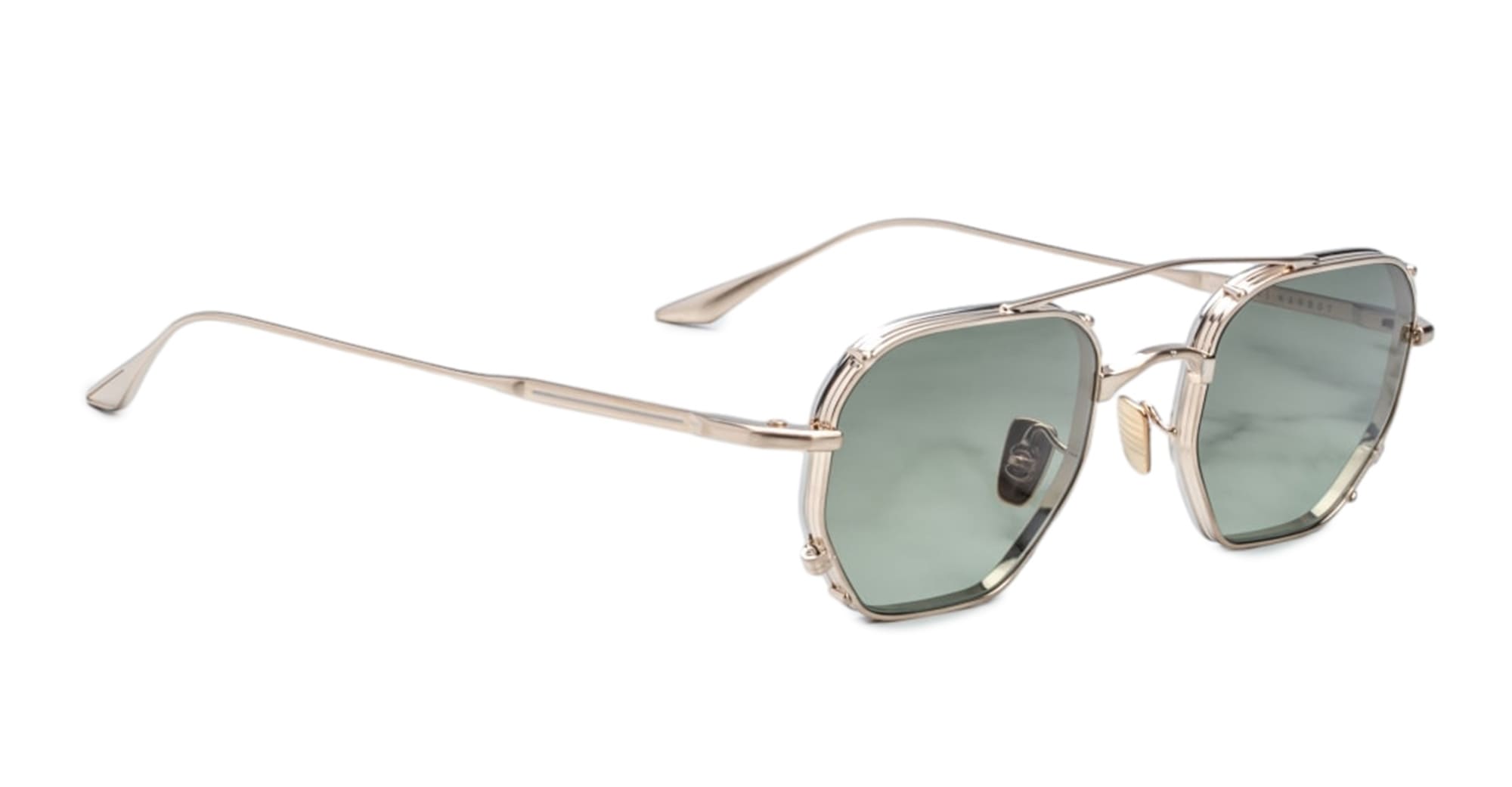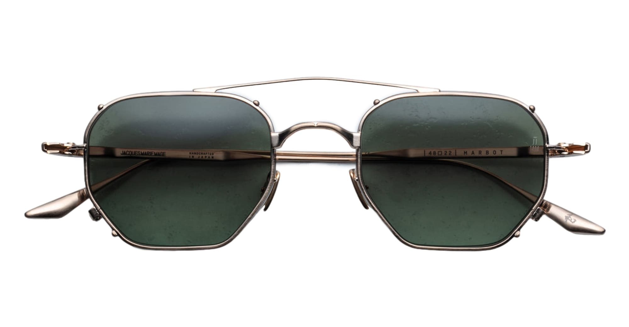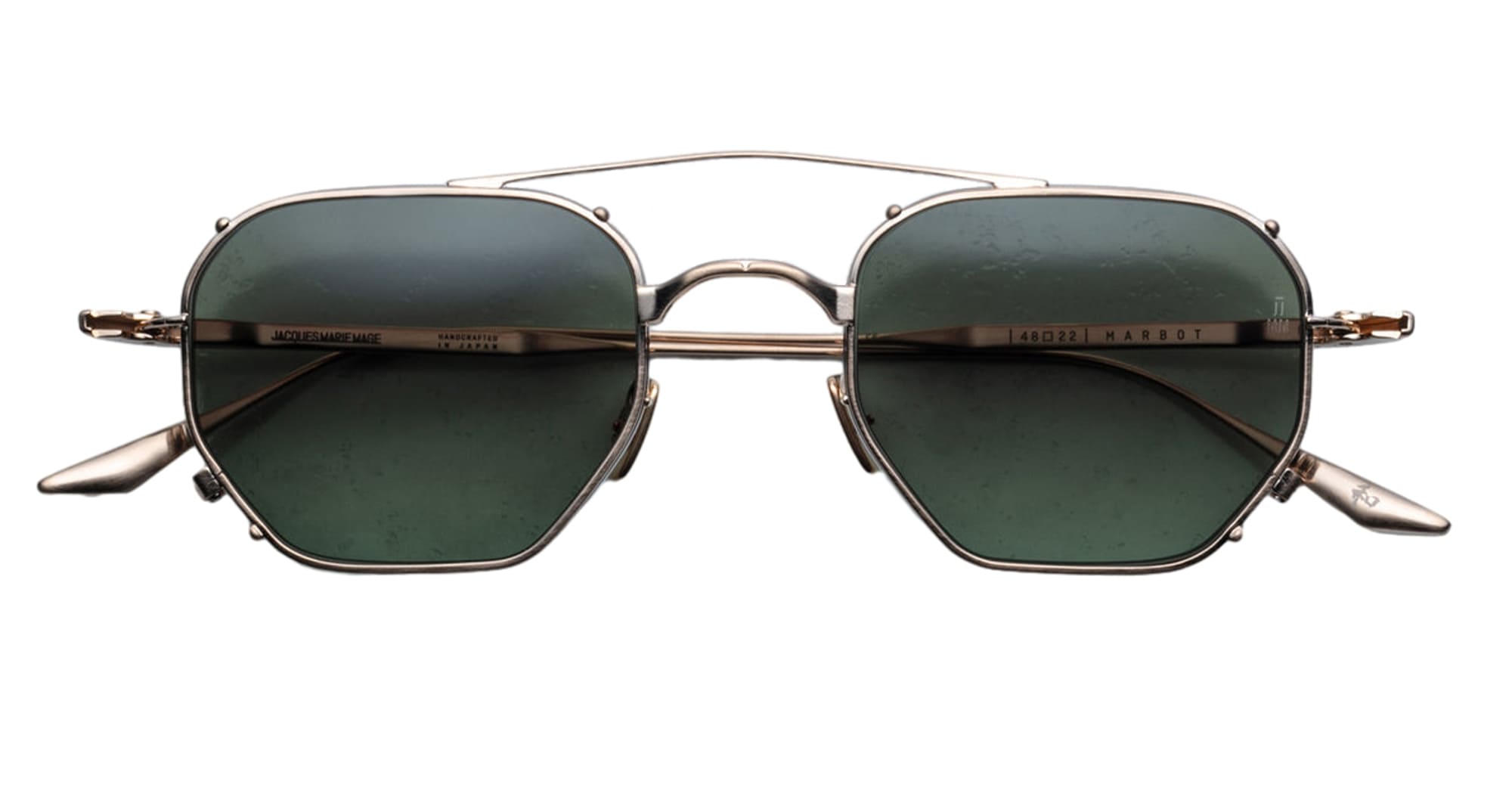 Jacques Marie Mage MARBOT - MUSKET (JMMMA-12M) are octagonal sunglasses made in Japan, part of the Titanium Series. They feature well-balanced, unisex octagonal lens shape and double-wire rim, light gold beta titanium structure, silver back eye-rim, hidden hinge, custom nose pads with logo and engravings, 4 base CR39 lens with backside anti-reflective treatment and 100% UV protection.