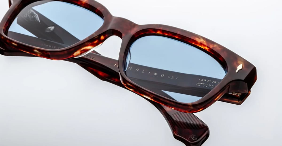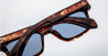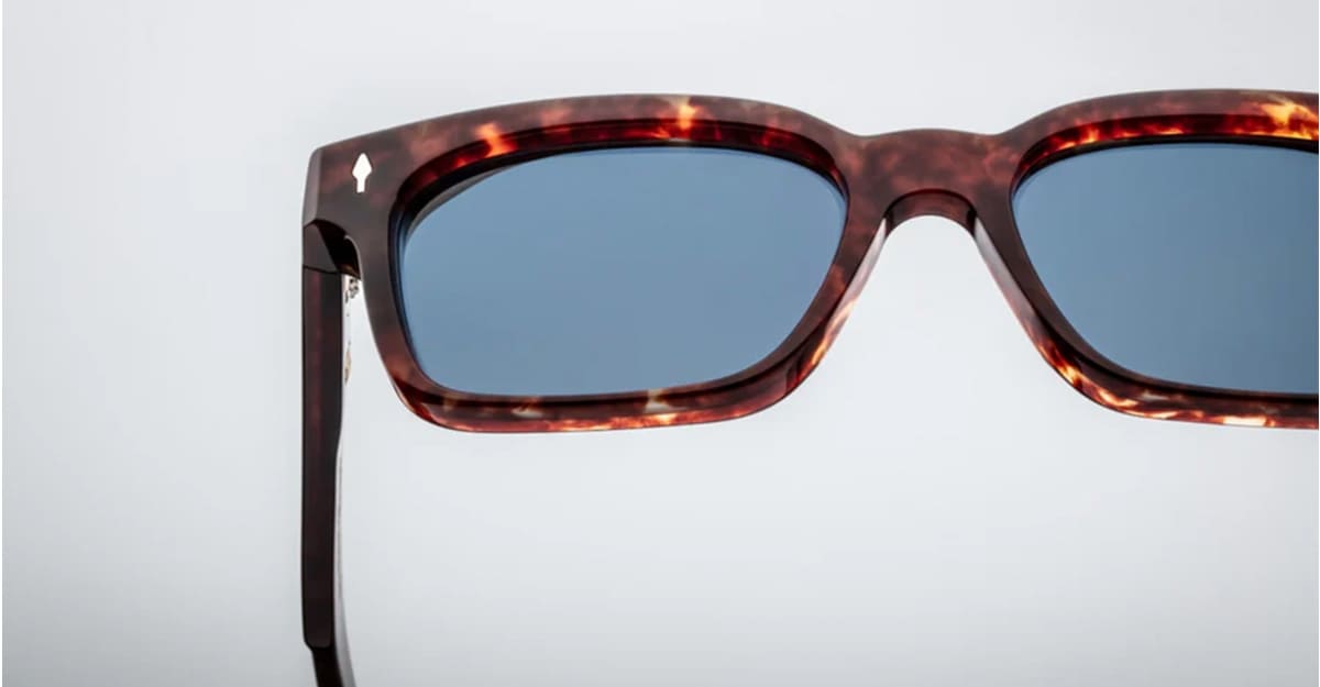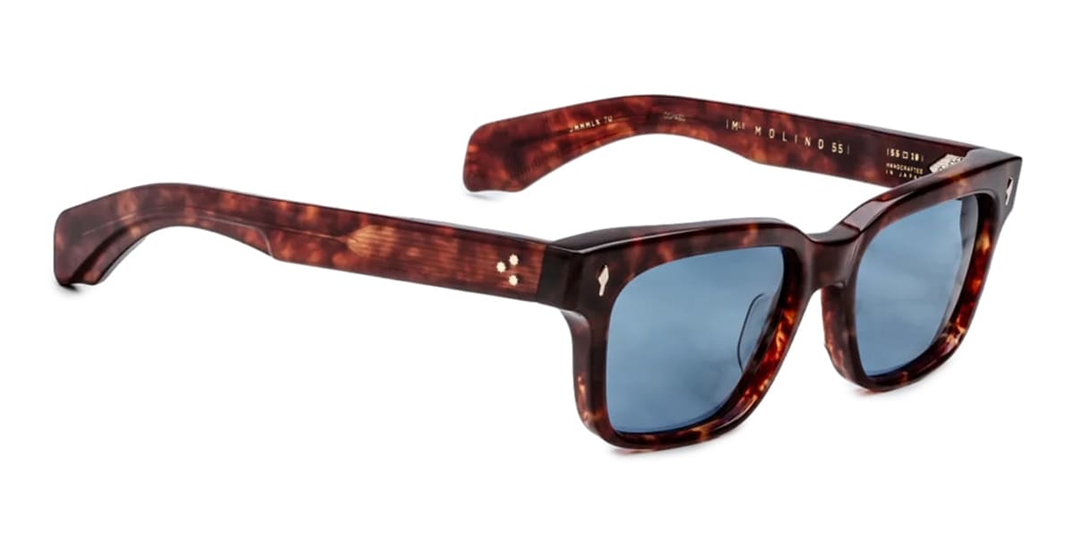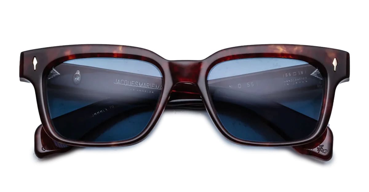 Jacques Marie Mage MOLINO 55 - BRECCIA (JMMMLX-7U) are one of the JMM icons, '60s-inspired rectangular sunglasses named after Italian architect Carlo Mollino. They feature brown havana 10mm cured cellulose acetate frame, custom double laminated temples, light gold signature arrowhead front pins, hidden wirecore, tension-secured custom 5 barrel hinge with spur-shaped rivets, domed 3D cameo logo, 6 base prussian blue CR39 lens with backside anti-reflective treatment and 100% UV protection.