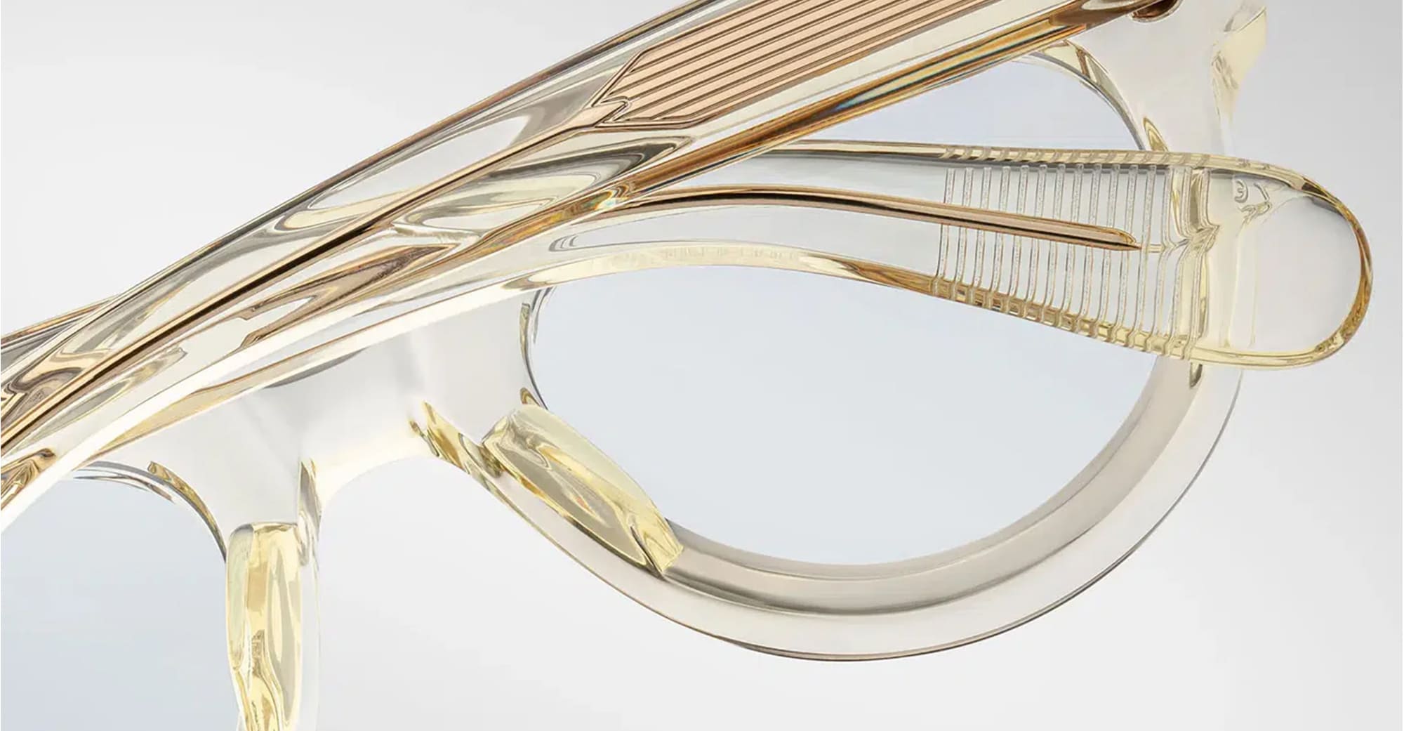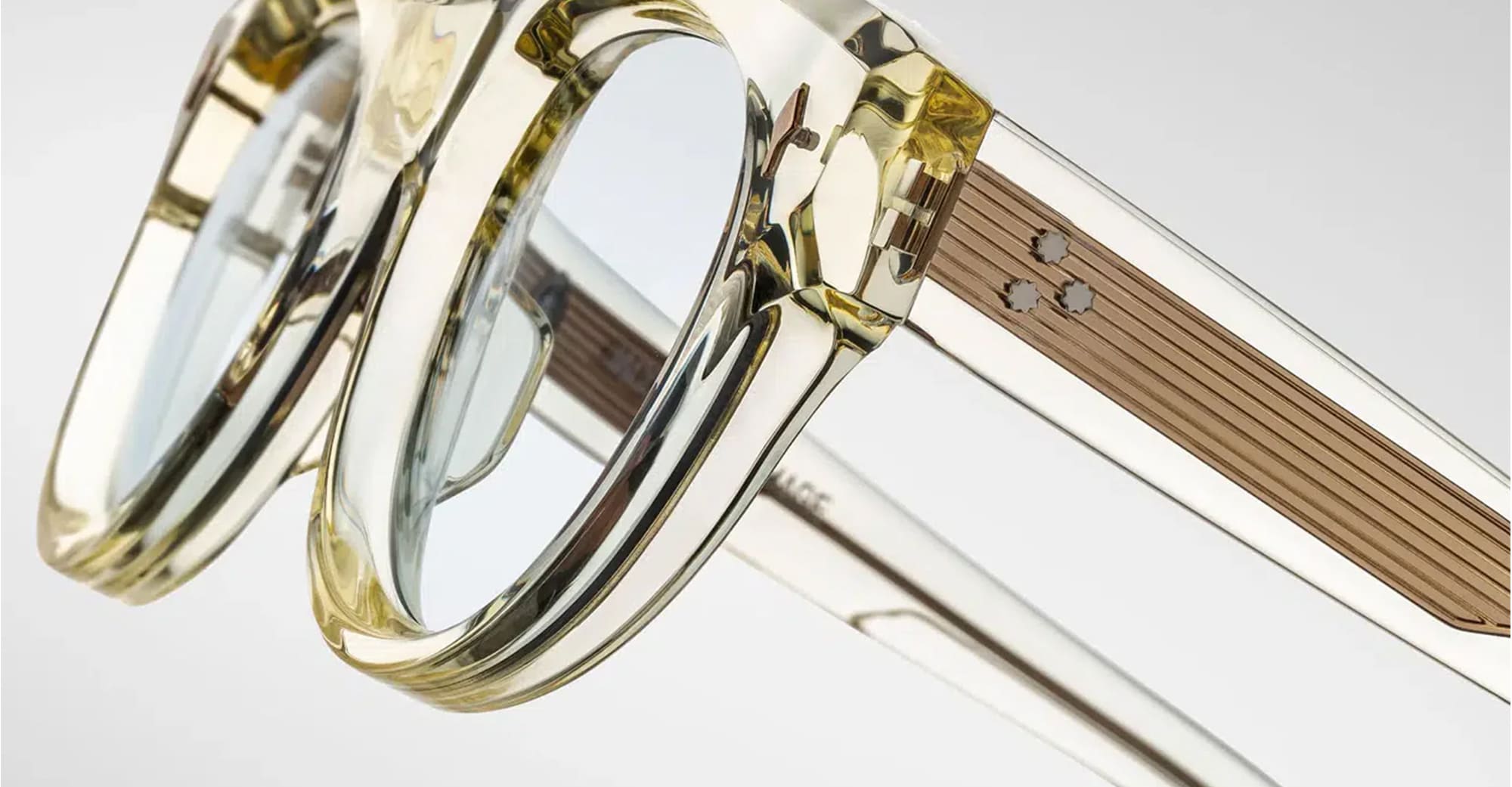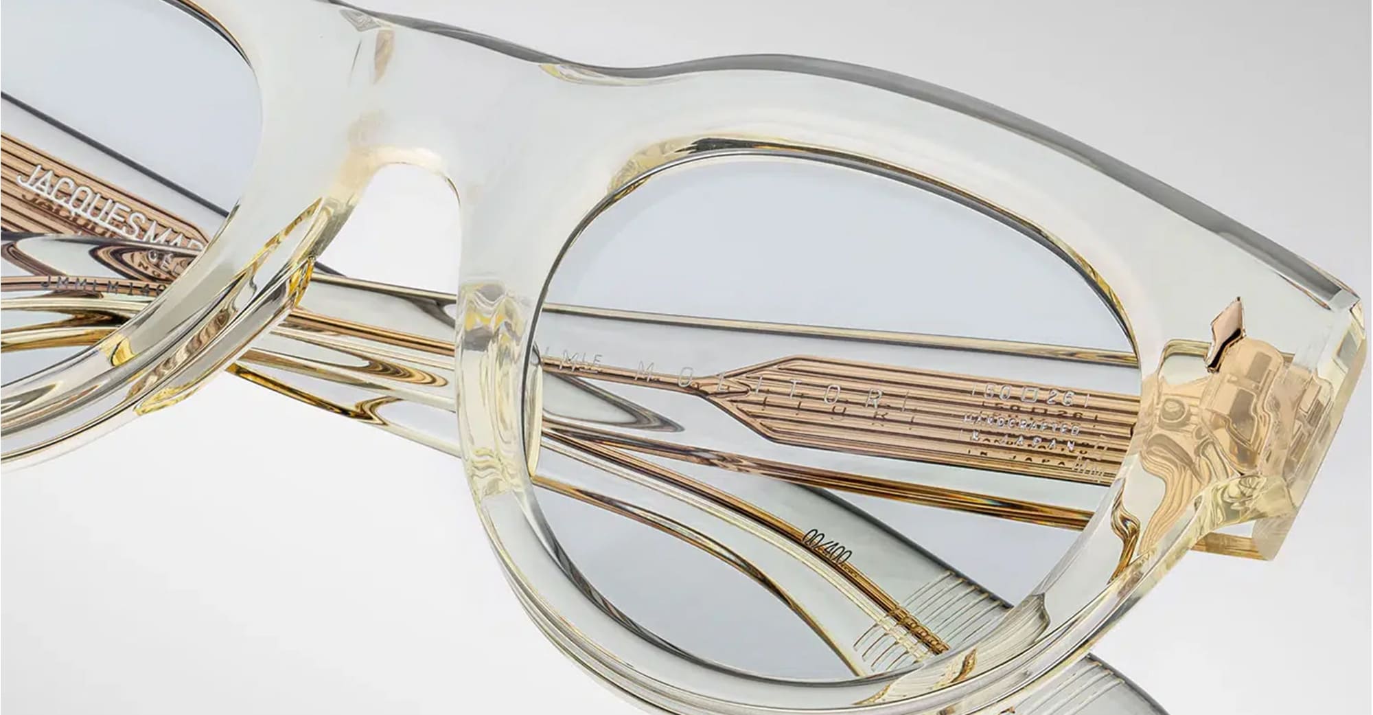 Jacques Marie Mage MOLITOR - BRUT RX (JMMLMRX-14Q) are boldly balanced eyeglasses with a medium fit. They feature 10mm transparent cured cellulose acetate frame, custom double laminated acetate, inner wirecore, light gold arrowhead front pins, tension-secured custom 7 barrel hinge with spur-shaped rivets.