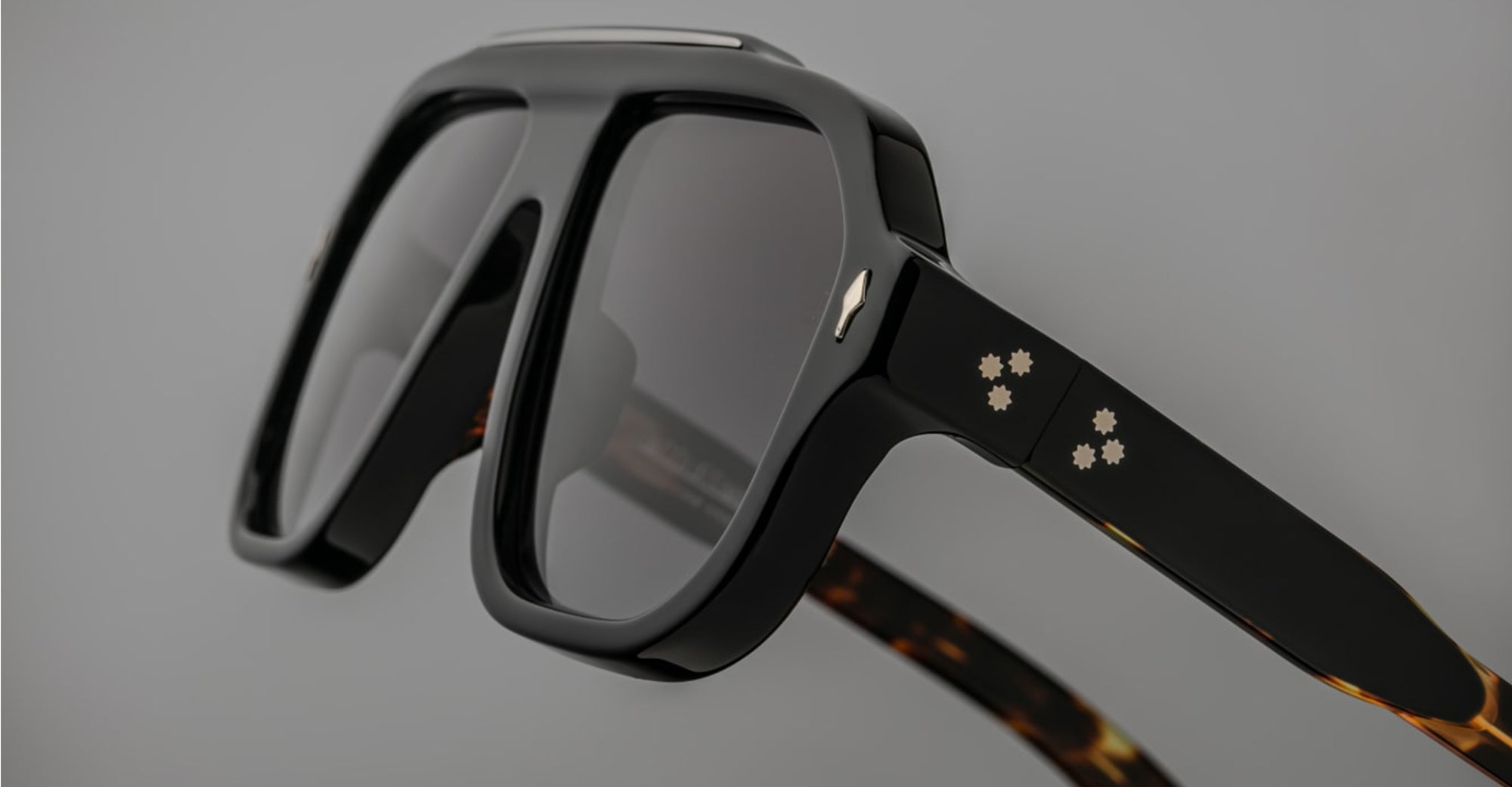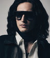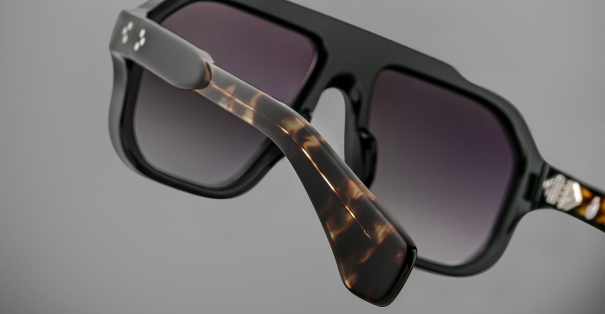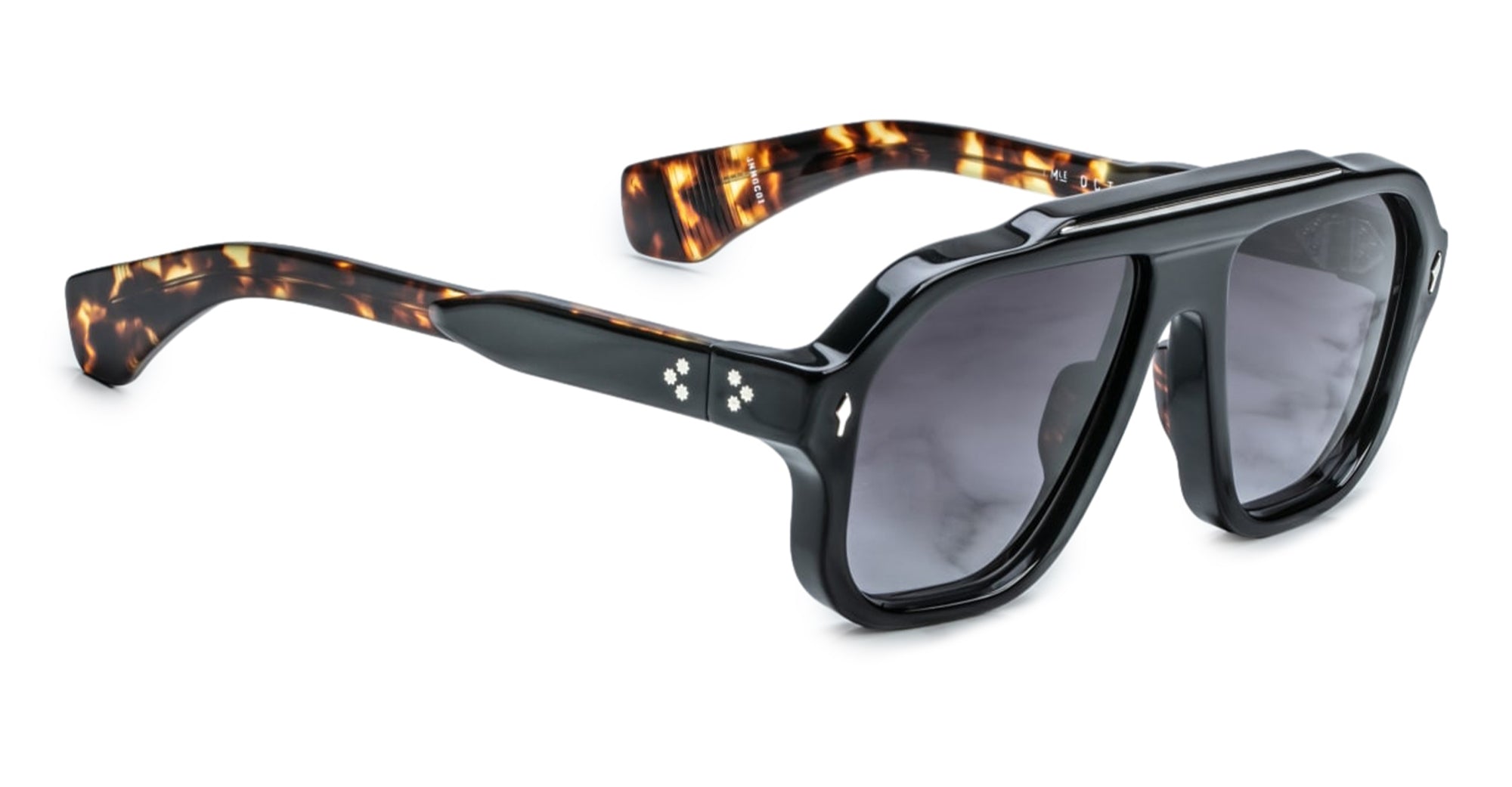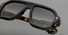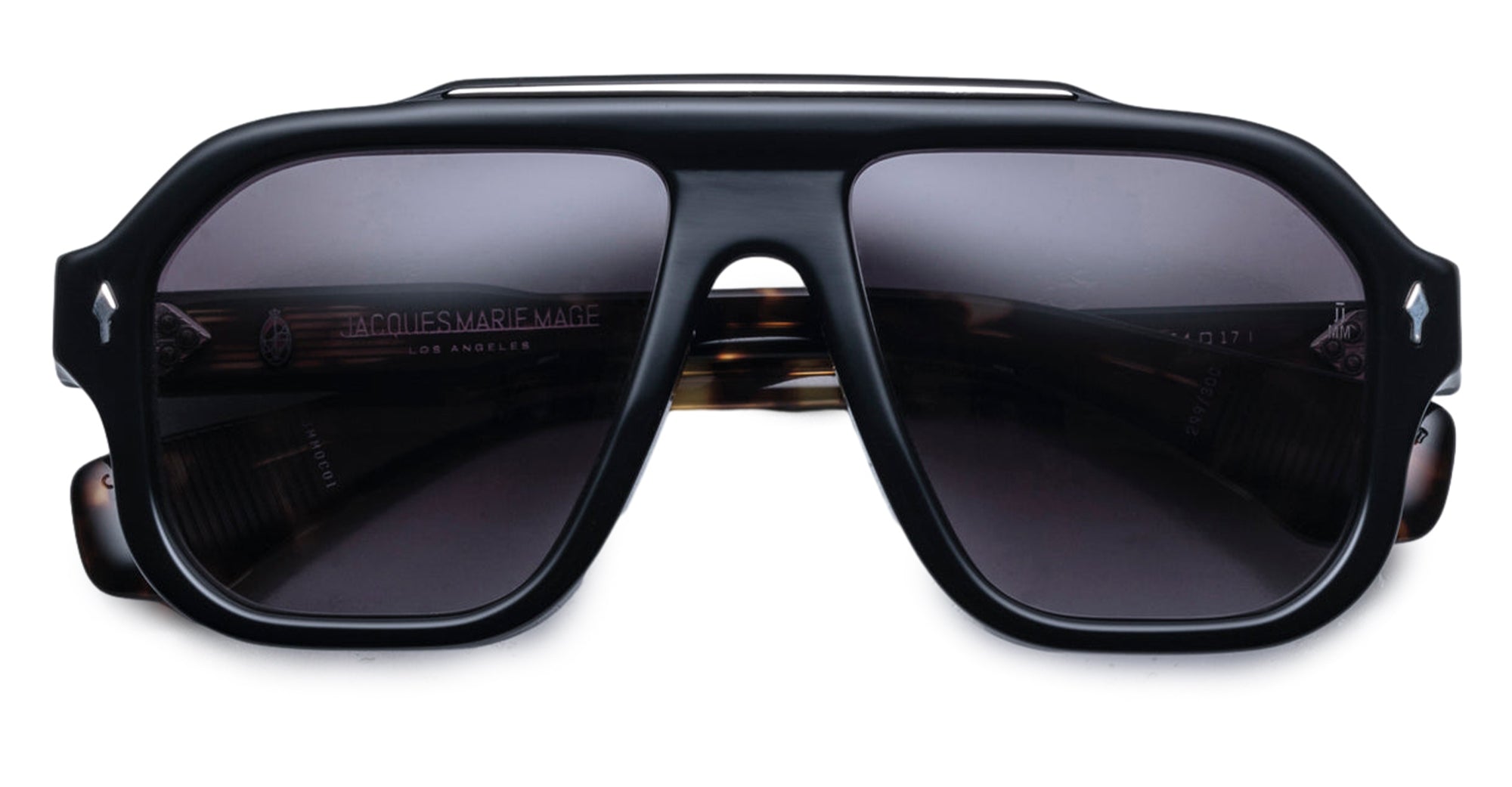 Jacques Marie Mage OCTAVIAN - NOIR (JMMOC-01) are boxy '80s-inspired navigator sunglasses. They feature 10mm black cured cellulose acetate frame, signature silver arrowhead front pins, titanium bar accent on brow bar, tortoise custom double laminated acetate temples, oversized temple tips for balance and comfort, hidden wirecore decoration, tension-secured custom 7 barrel hinge, 4 base CR39 lens with backside anti-reflective treatment and 100% UV protection.