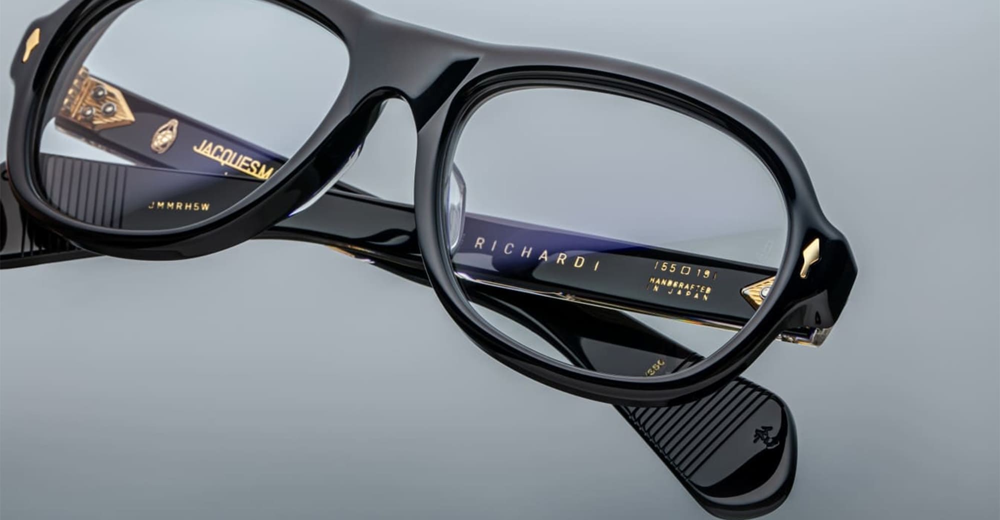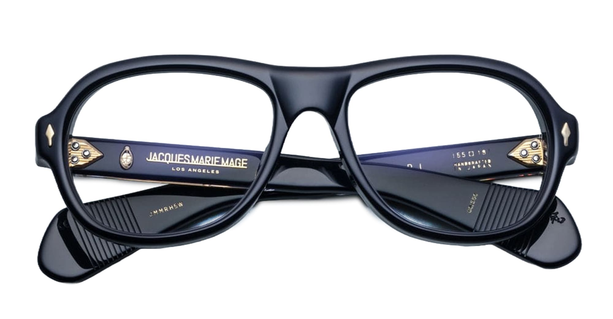 Jacques Marie Mage RICHARD - ROYAL RX (JMMRHRX-5W) are modern mid-size aviator eyeglasses made in Japan. They feature navy blue 10mm cured cellulose acetate frame, custom double laminated acetate temples, dark gold arrowhead front pins, exposed wirecore, and tension-secured custom 7 barrel hinge.