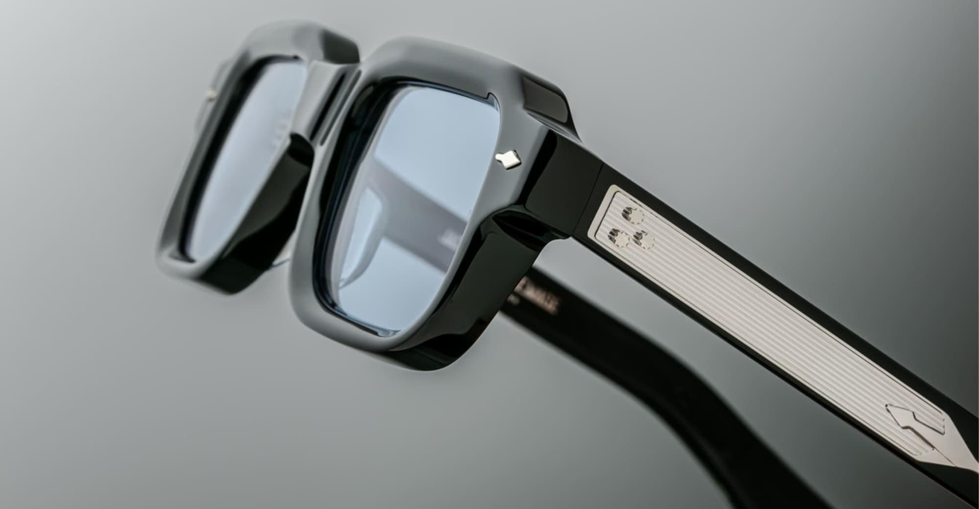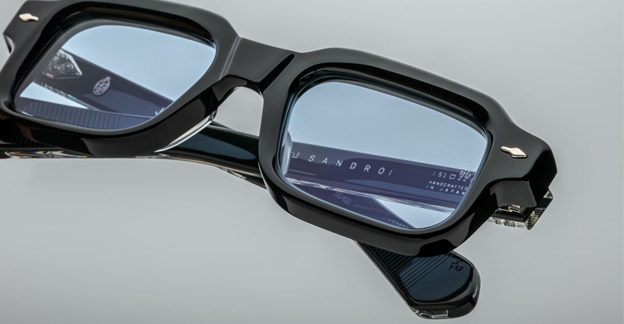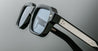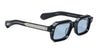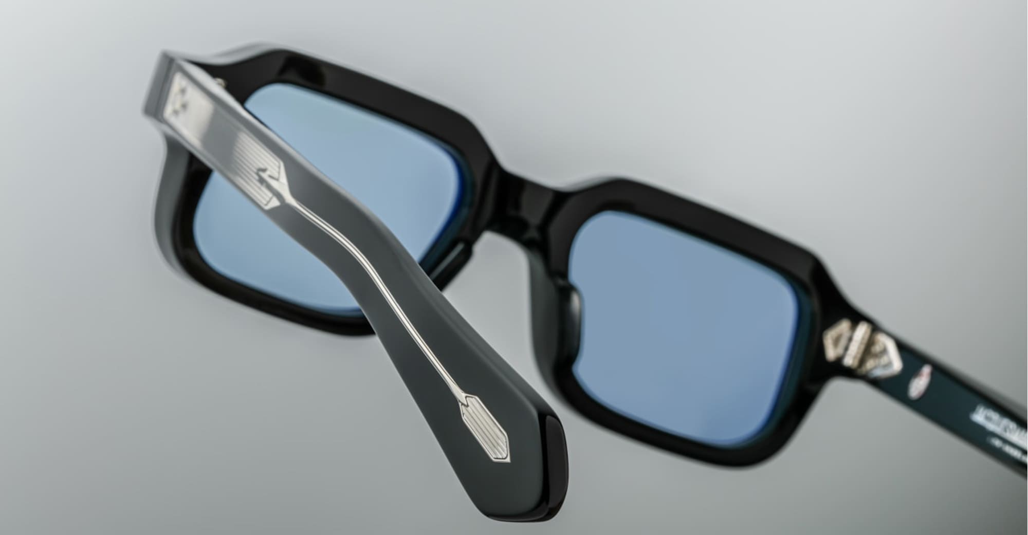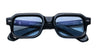 Jacques Marie Mage SANDRO - CHARBON (JMMSN-11N) are '90s-inspired rectangular sunglasses with dynamic volumes. They feature 10mm black cellulose acetate frame, custom double laminated acetate temples, silver signature arrowhead front pins, exposed wirecore design, custom tension-secured 7 barrel hinge, blue bird 4 bae CR39 lens with anti-reflective treatment and 100% UV protection.