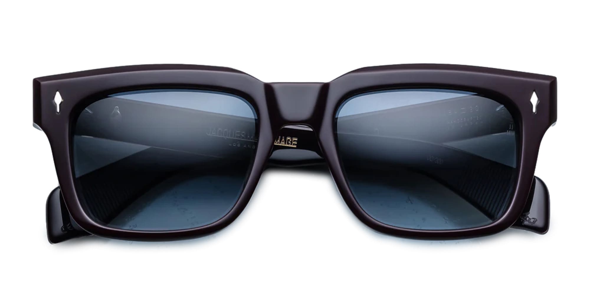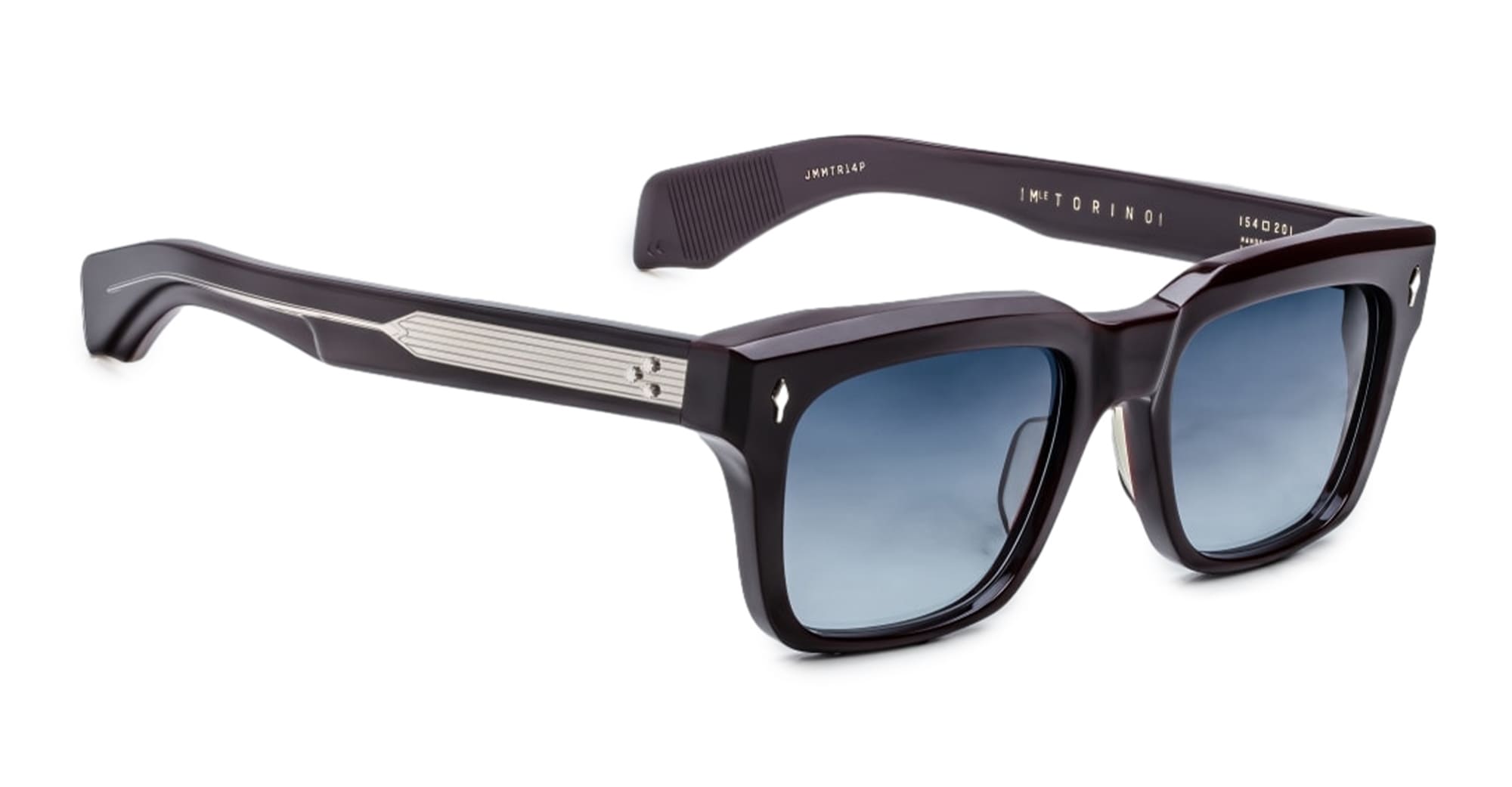 Jacques Marie Mage TORINO - WINE (JMMTR-14P) are 60's inspired sunglasses with angular design and bold rectangular shape - one of the icons of JMM - inspired by the Teatro Regio Torino, a historic Italian theater. They feature 10mm purple cellulose acetate frame, custom double laminated temples, sterling silver signature arrowhead front pin, exposed wirecore, tension-secured custom 7 barrel hinge, denim gradient 6 base CR39 lens with backside anti-reflective treatment and 100% UV protection.