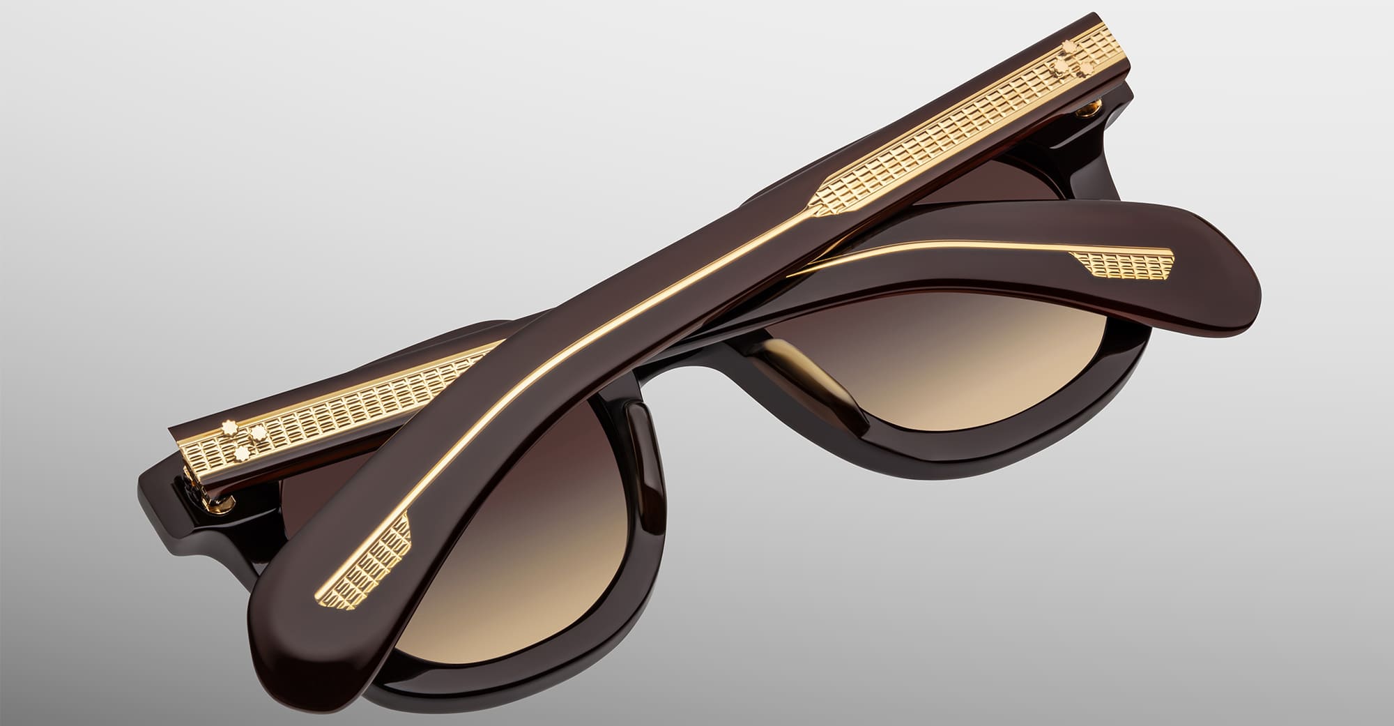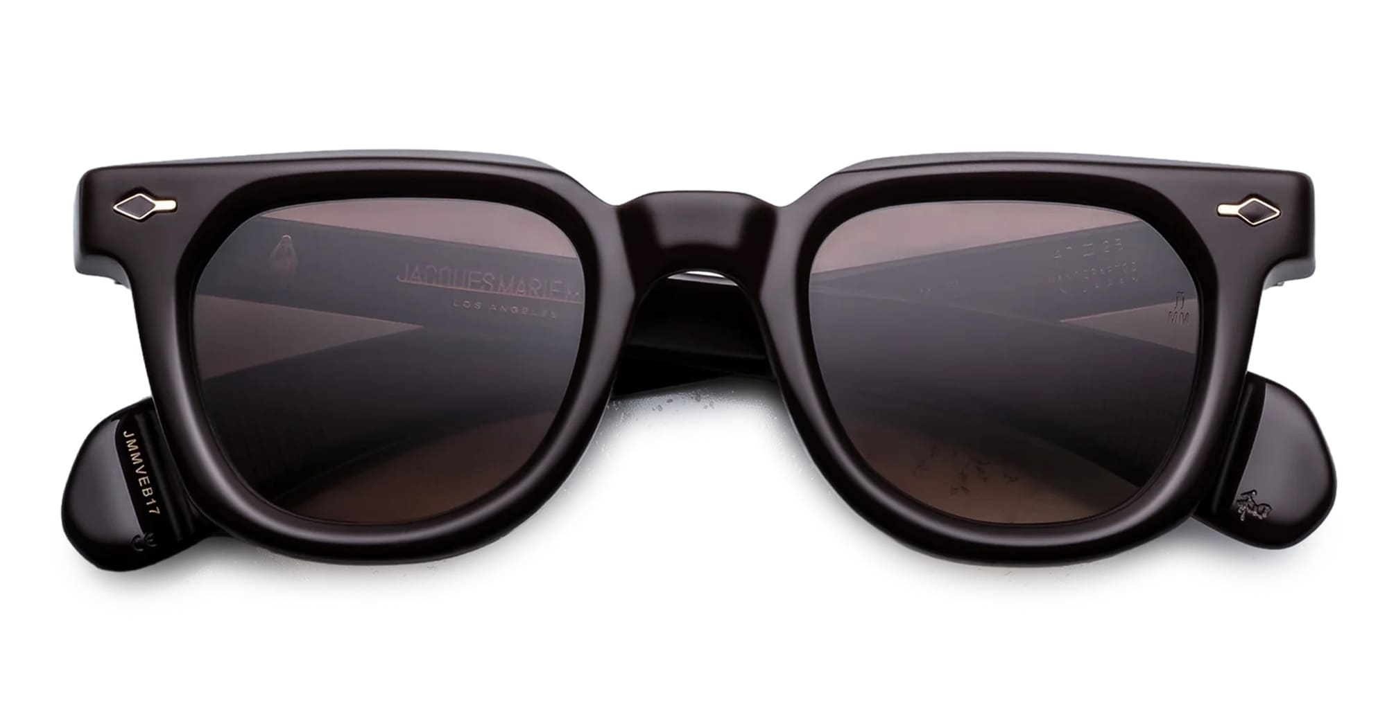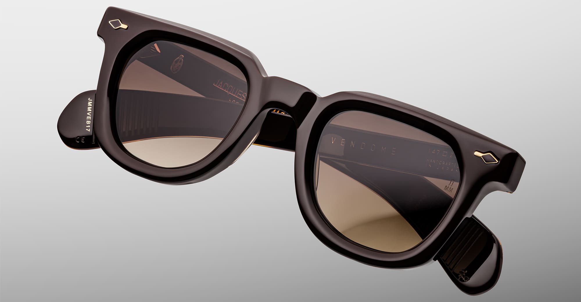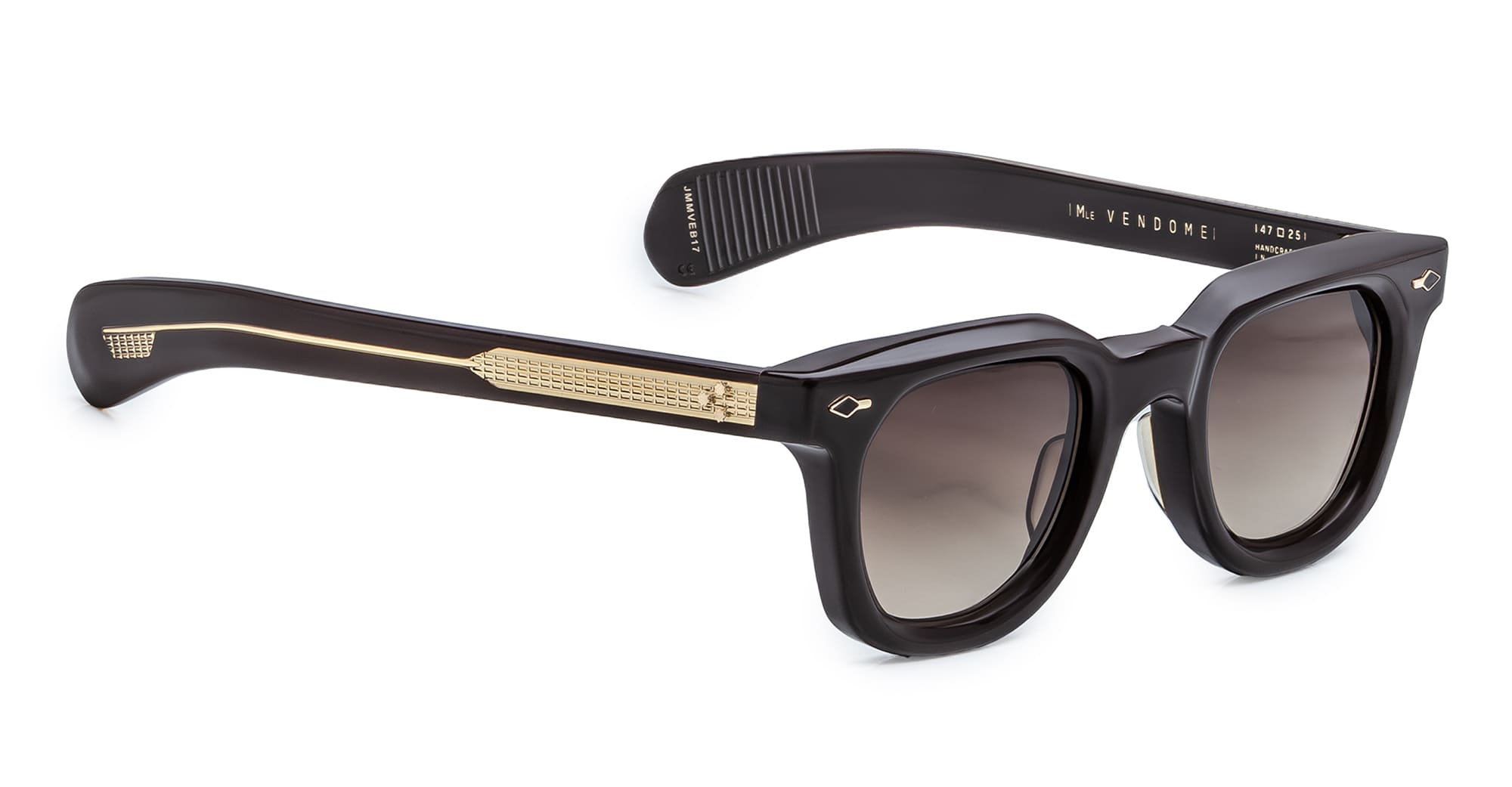 Jacques Marie Mage VENDOME EPOXY II - GANACHE (JMMVE-B17) are classic Wellington-shaped sunglasses with bevel cuts and paddle temples, inspired by the late French classicism of Place Vendôme. A reimagined version for the exclusive JMM Epoxy II Collection. They feature 10mm brown cured cellulose acetate frame, custom double laminated acetate temples, 18k gold-plated arrowhead front pins with dark brown epoxy inlay, exposed wirecore with 'baguette' pattern, tension-secured custom 7 barrel hinge, choco gradient gradient 2 base CR39 lens with backside anti-reflective treatment, and 100% UV protection.