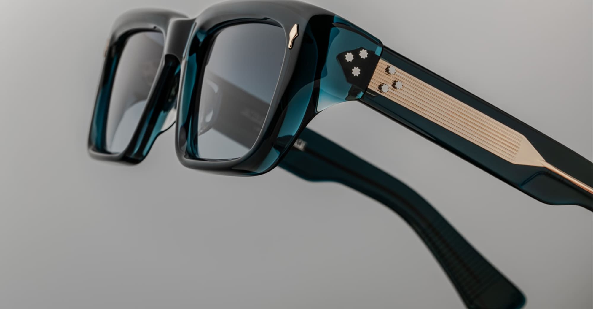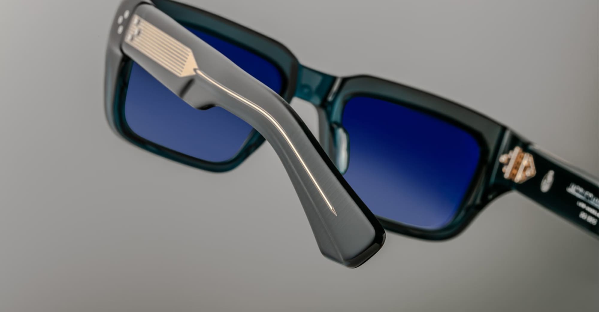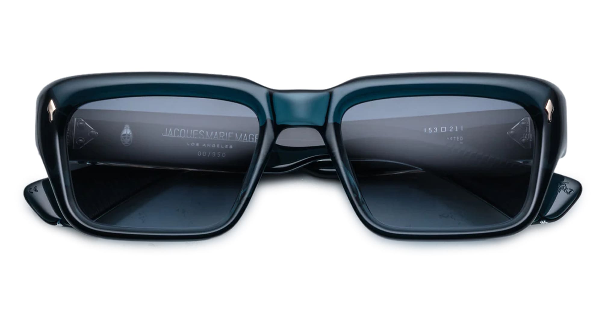 Jacques Marie Mage WALKER - INDIGO (JMMWK-9F) are bold rectangular sunglasses, named after experimental singer Scott Walker. They feature blue 10mm cured cellulose acetate frame with soft angles, custom double laminated temples, light gold arrowhead front pin, exposed wirecore, tension-secured custom 9 barrel hinge with spur-shaped rivets, denim gradient 4 base CR39 lens with back-side anti-reflective treatment, and 100% UV protection.