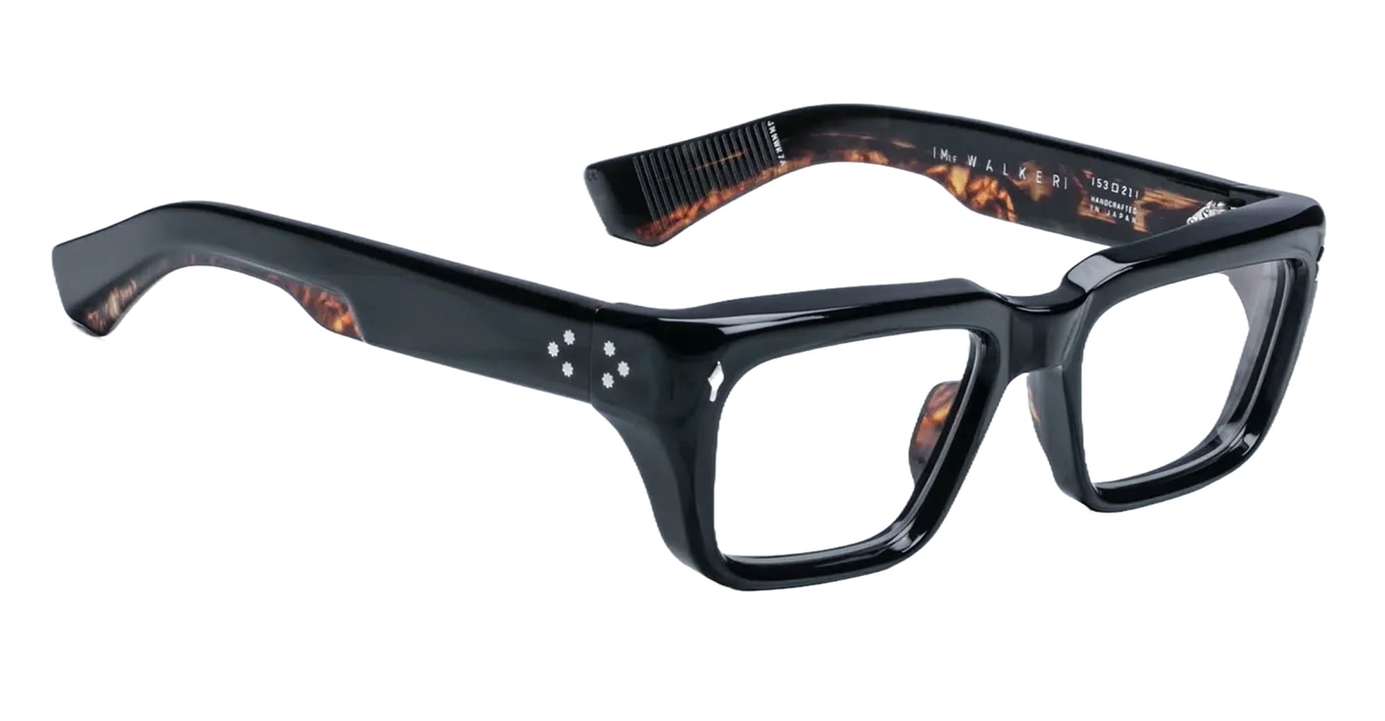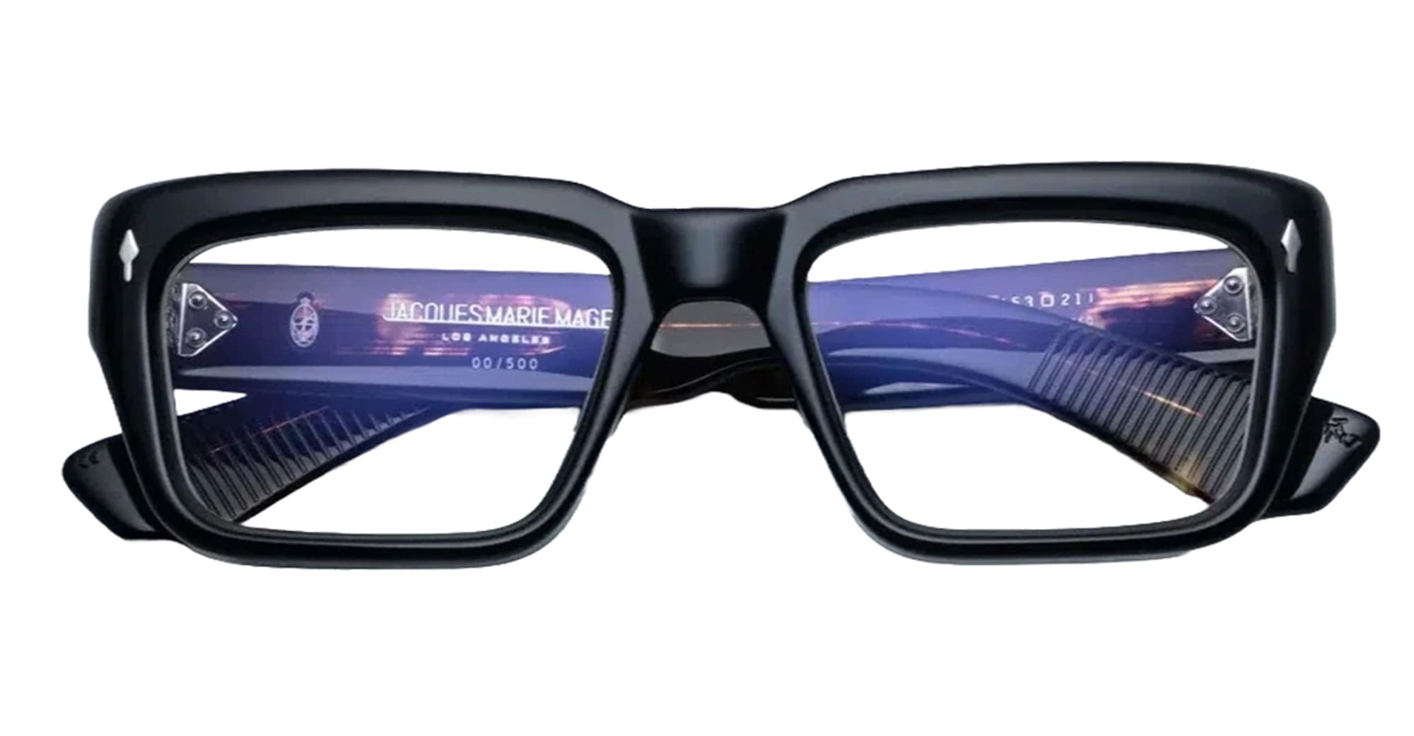Jacques Marie Mage WALKER - NOIR 7 RX (JMMWKRX-7A) are bold rectangular eyeglasses, named after experimental singer Scott Walker. They feature 10mm cured cellulose acetate frame with soft angles, custom double laminated temples, silver signature arrowhead front pin, hidden wirecore decoration, silver tension-secured custom 9 barrel hinge with spur-shaped rivets.