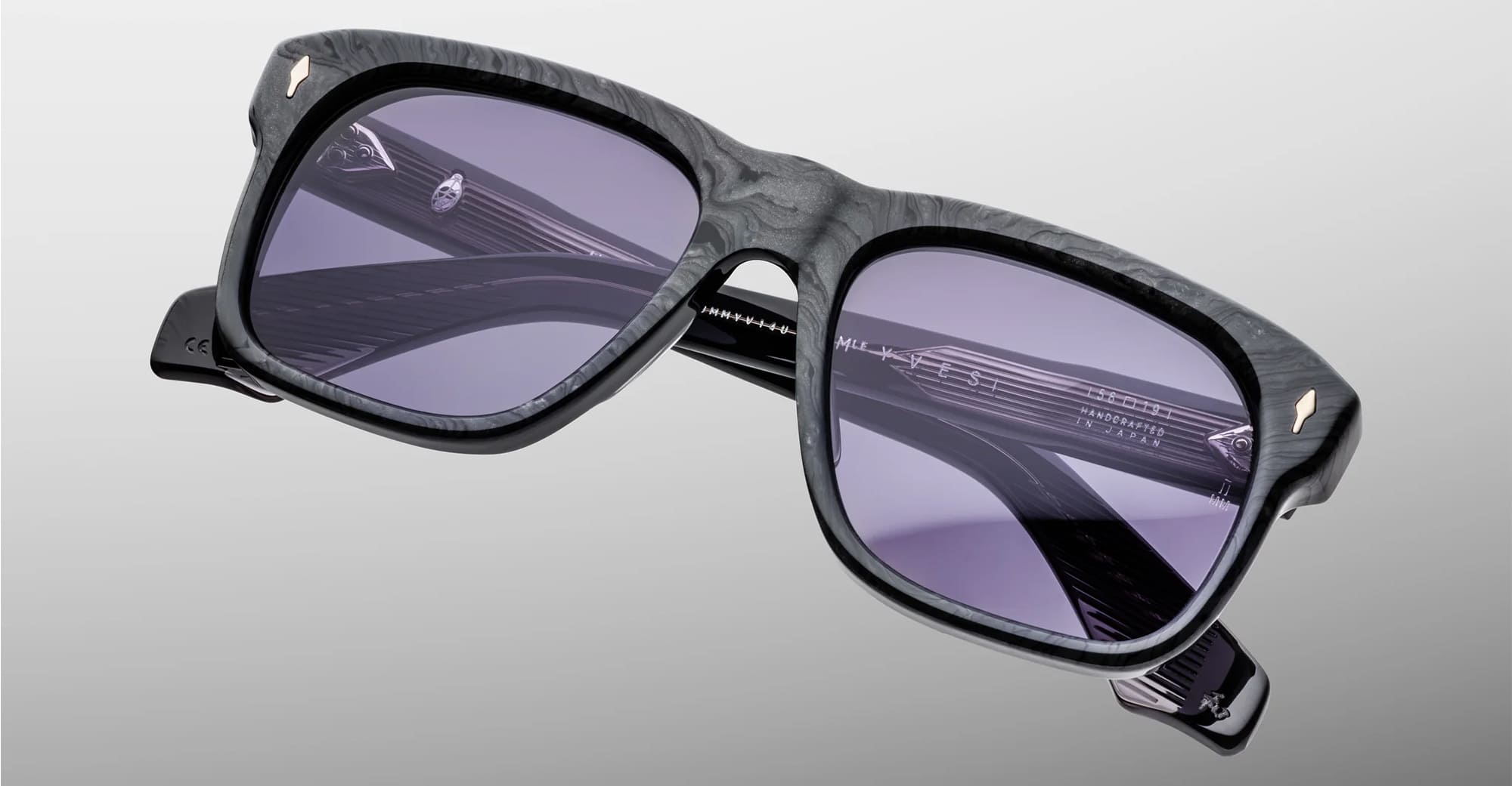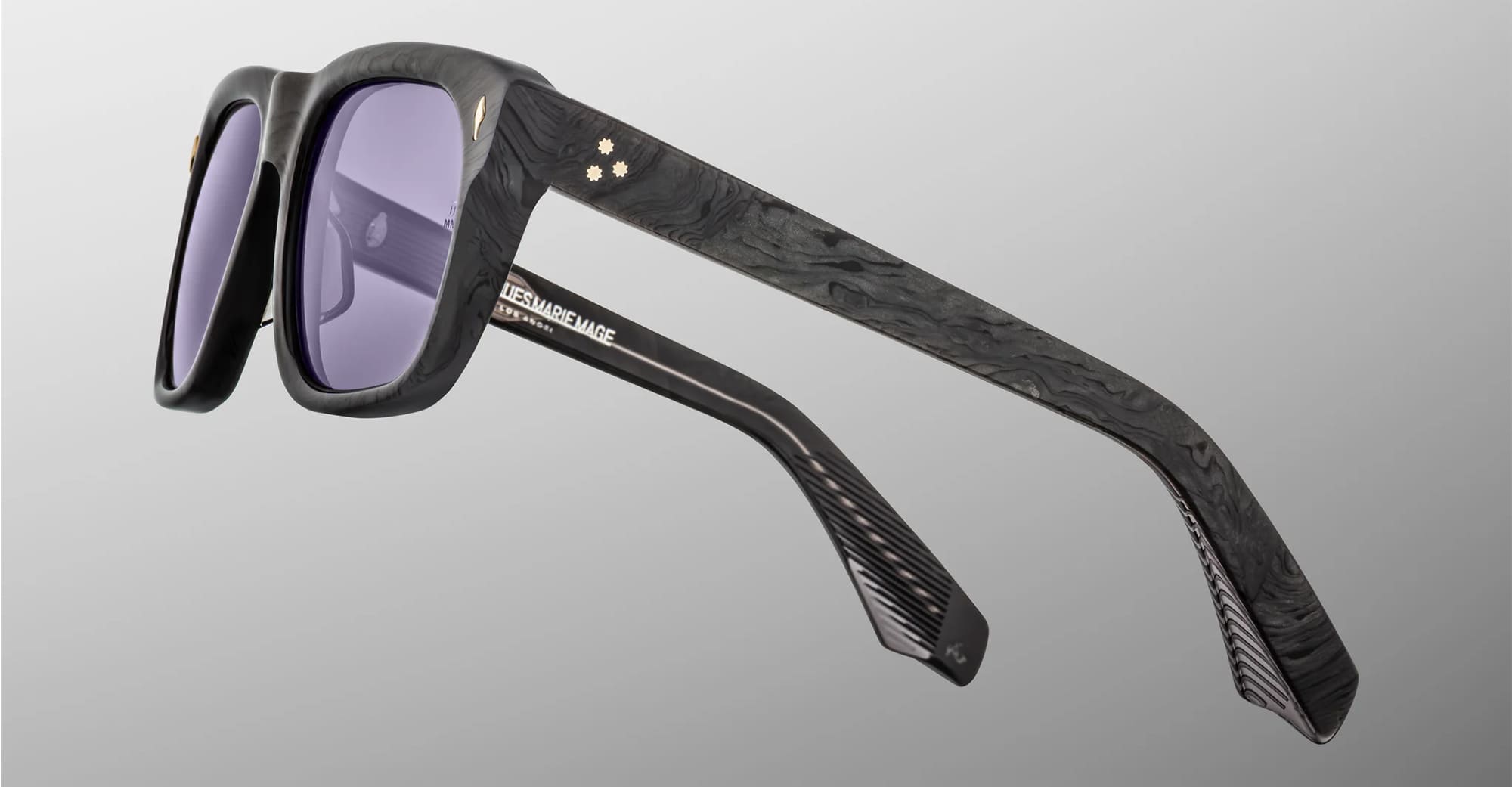 Jacques Marie Mage YVES - EBONY (JMMYV-14U) are squared sunglasses with soft lens shape, inspired by the iconic frames worn worn by Yves Saint Laurent during the '70s. They feature charcoal burlwood 10mm cured cellulose acetate frame, custom double laminated temples, signature silver arrowhead front pins, tension-secured custom 7 barrel hinge with spur-shaped rivets, inner wirecore, domed 3D metal cameo logo, nimbus grey 4 base CR39 lens with backside anti-reflective treatment and 100% UV protection.