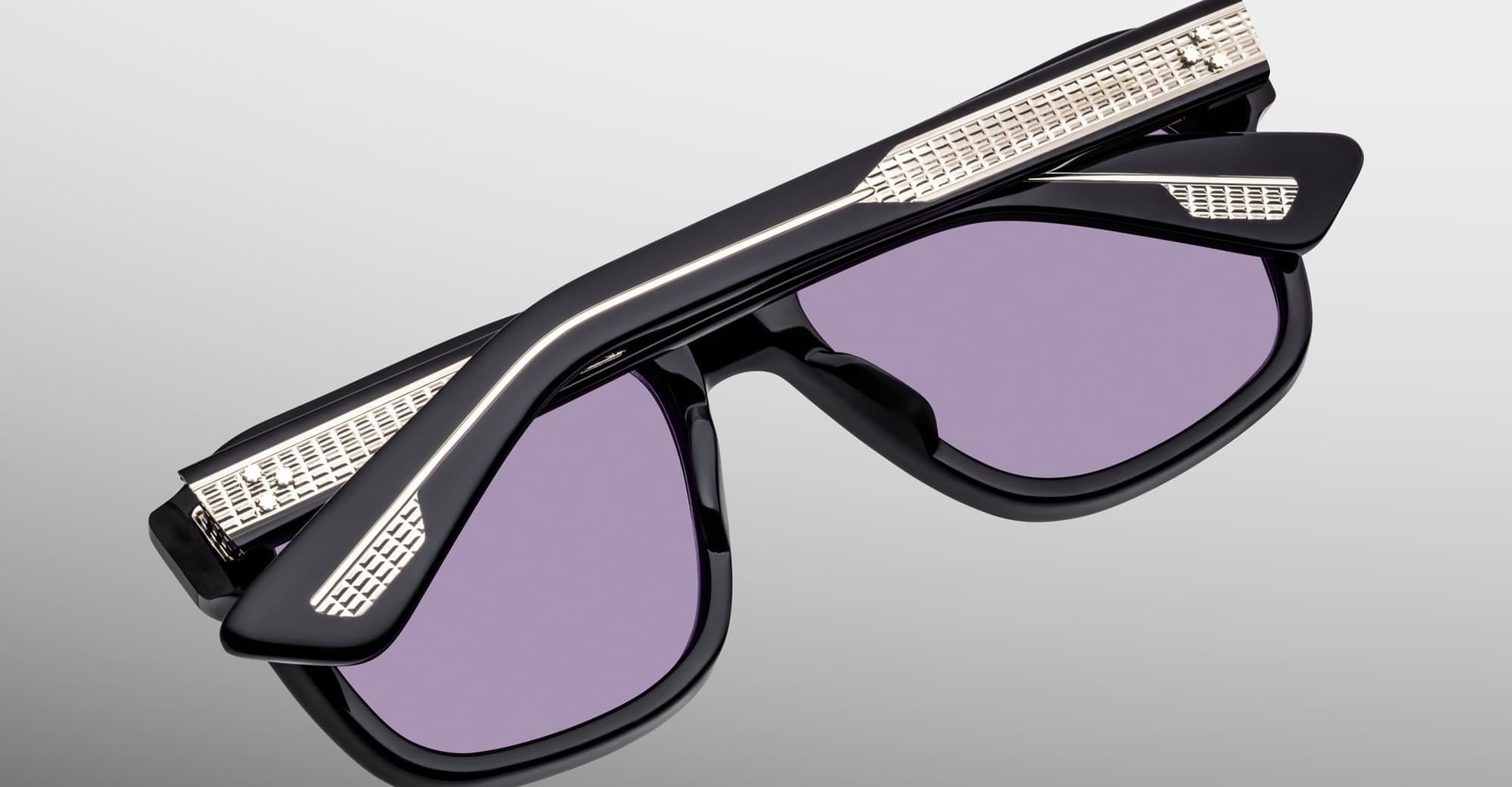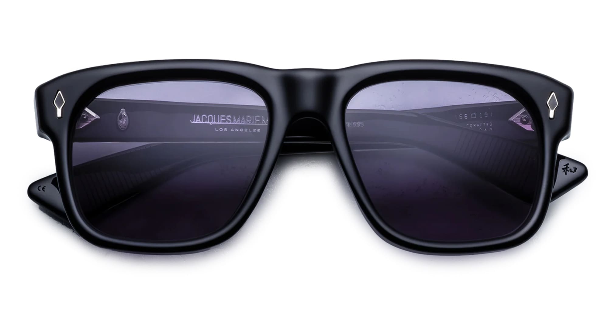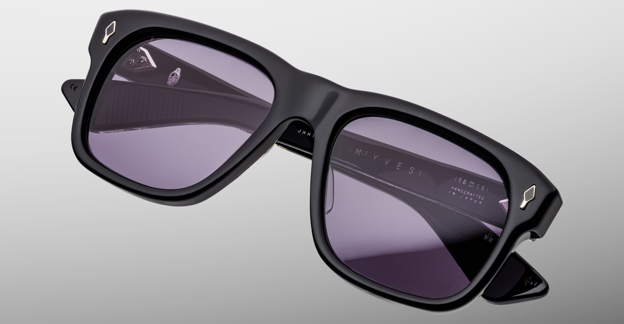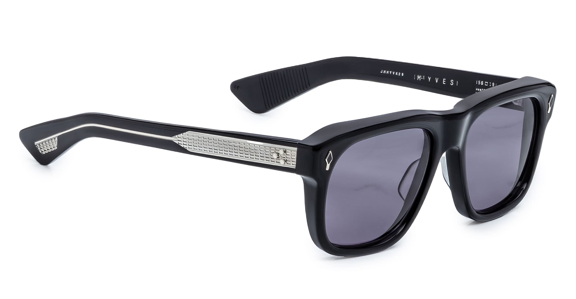Jacques Marie Mage YVES EPOXY II - FUMÉE (JMMYV-K28) are squared sunglasses with soft lens shape, inspired by the iconic frames worn worn by Yves Saint Laurent during the '70s - reimagined for the Epoxy II Collection. They feature polished black 10mm cured cellulose acetate frame, custom double laminated temples, signature silver arrowhead front pins with black epoxy embellishment, tension-secured custom 7 barrel hinge with spur-shaped rivets, exposed wirecore, domed 3D metal cameo logo, nimbus 4 base CR39 lens with backside anti-reflective treatment and 100% UV protection.
