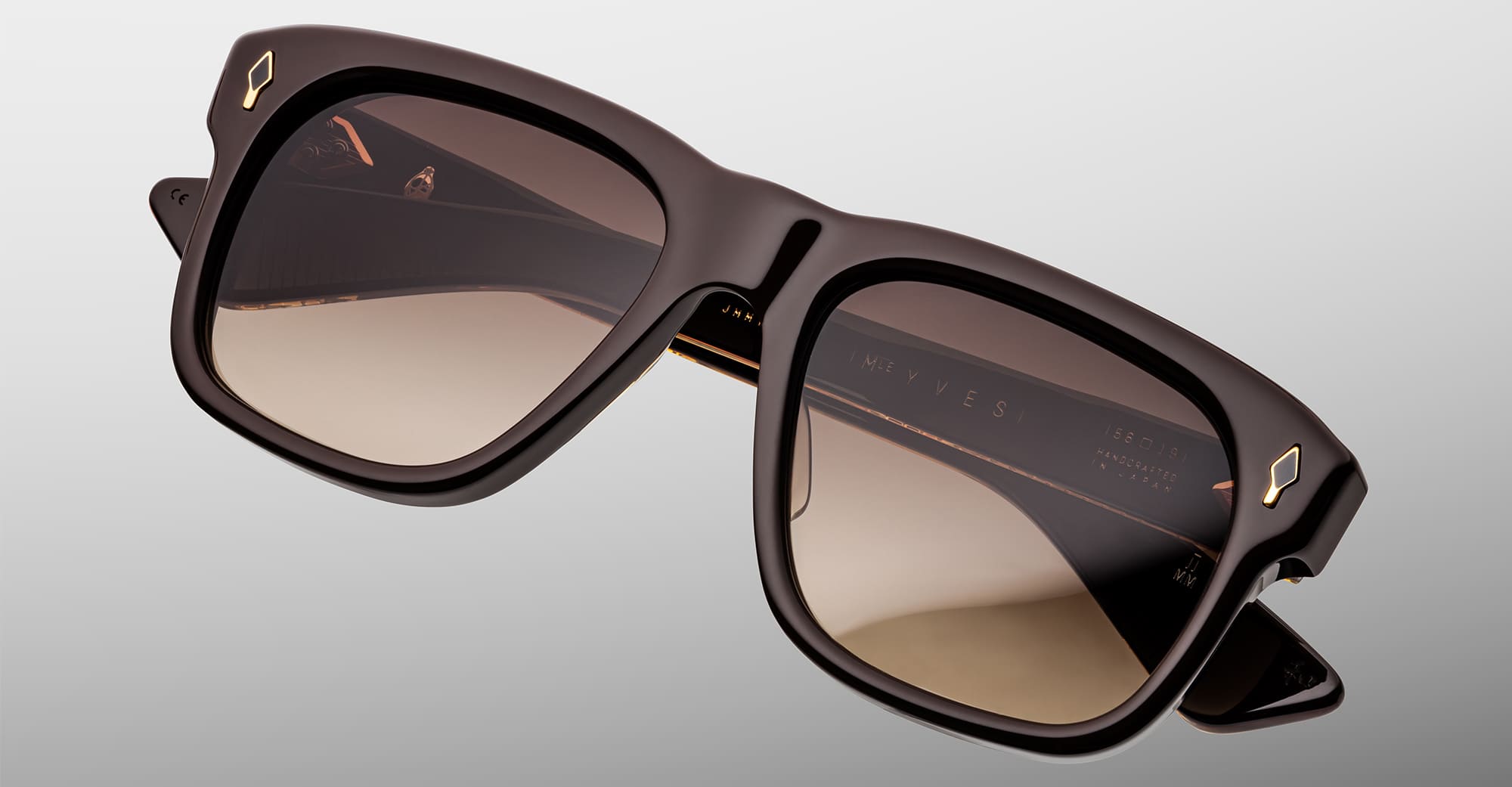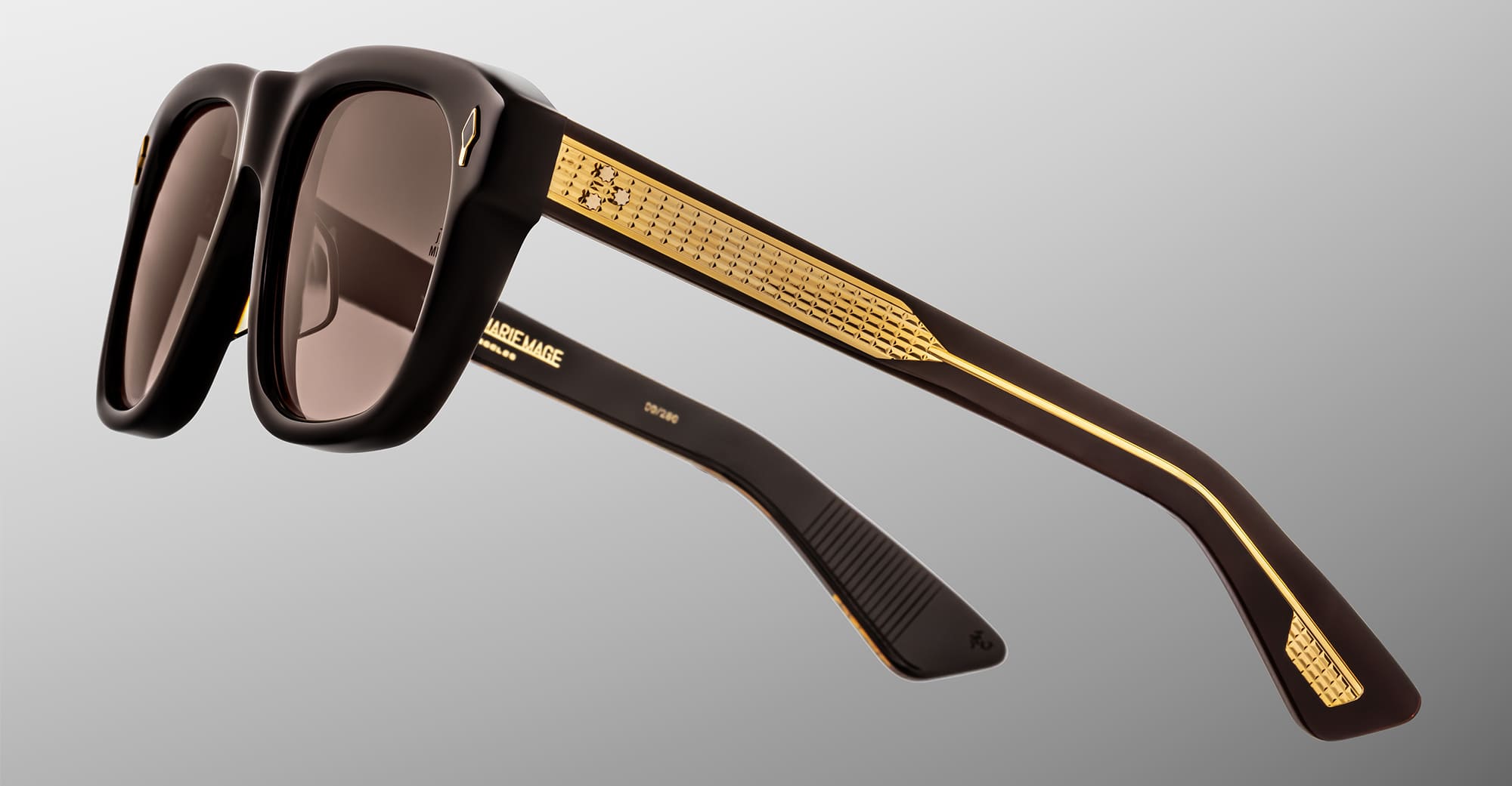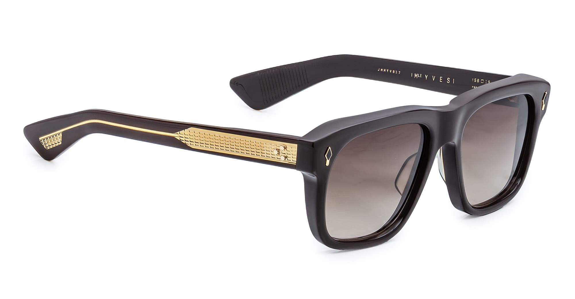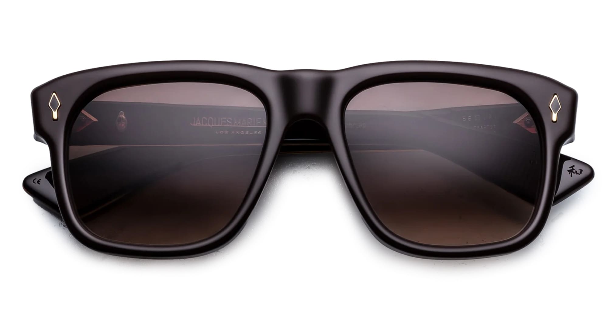 Jacques Marie Mage YVES EPOXY II - GANACHE (JMMYV-B17) are squared sunglasses with soft lens shape, inspired by the iconic frames worn worn by Yves Saint Laurent during the '70s - reimagined for the Epoxy II Collection. They feature brown 10mm cured cellulose acetate frame, custom double laminated temples, signature 18k gold-plated arrowhead front pins with dark brown epoxy embellishment, tension-secured custom 7 barrel hinge with spur-shaped rivets, exposed wirecore, domed 3D metal cameo logo, choco gradient 4 base CR39 lens with backside anti-reflective treatment and 100% UV protection.