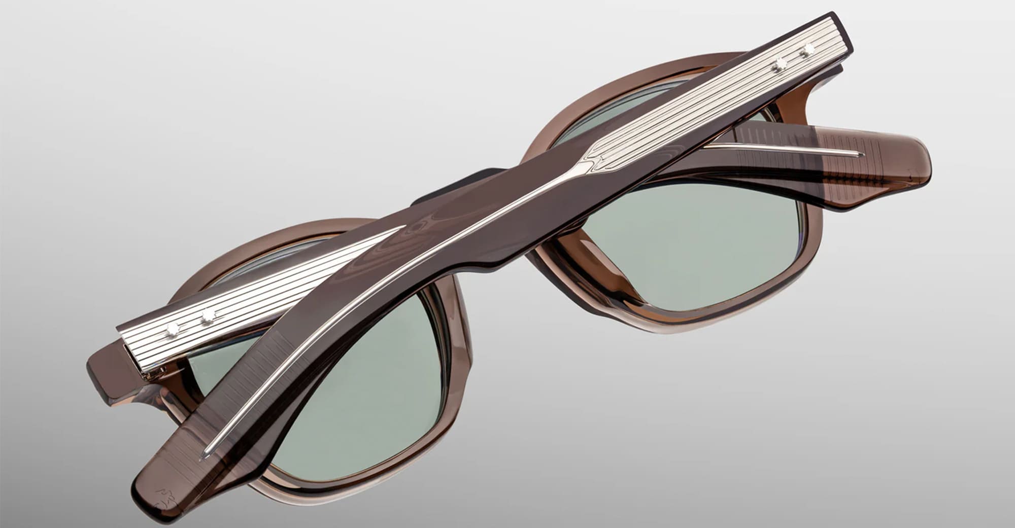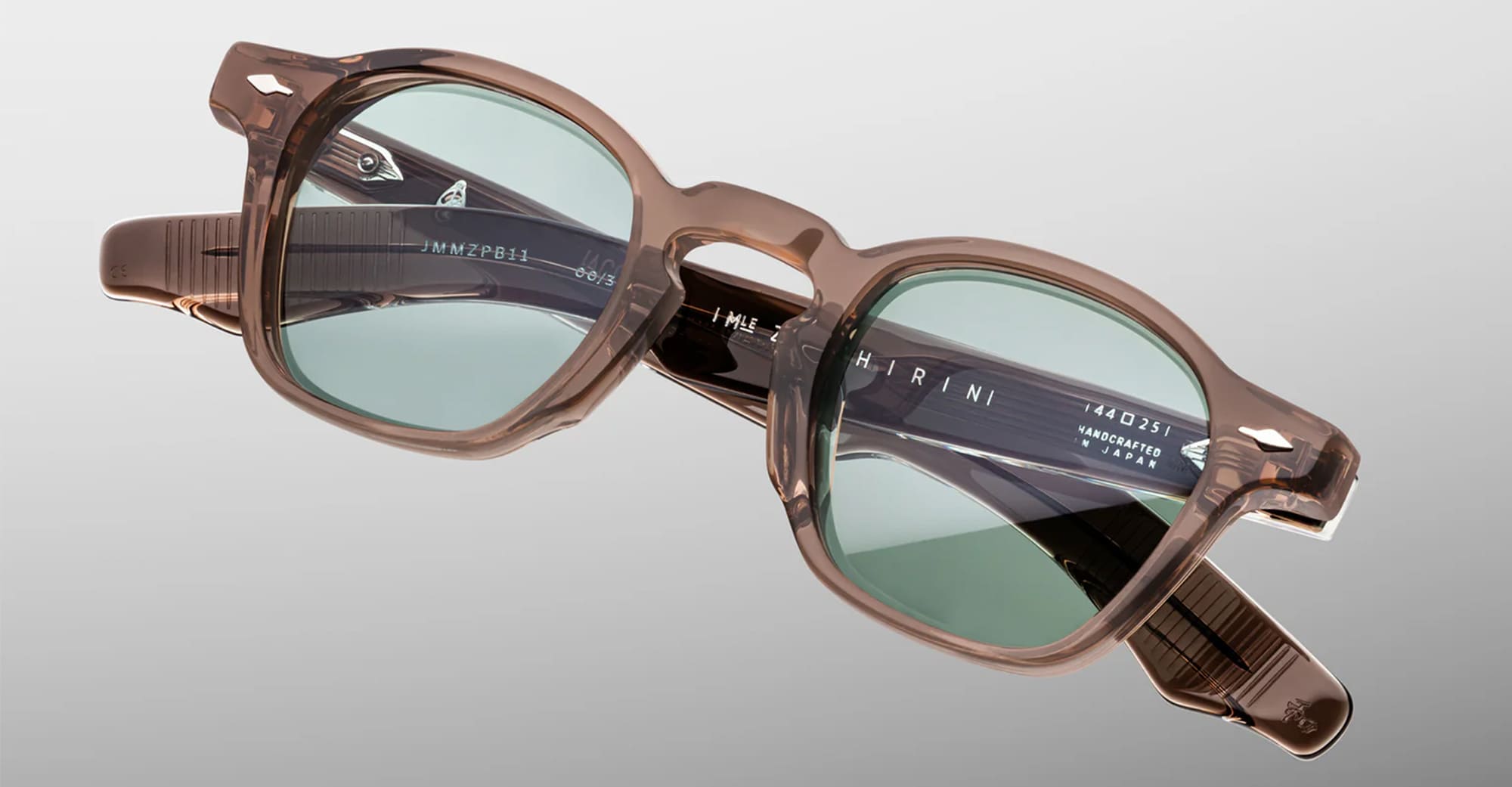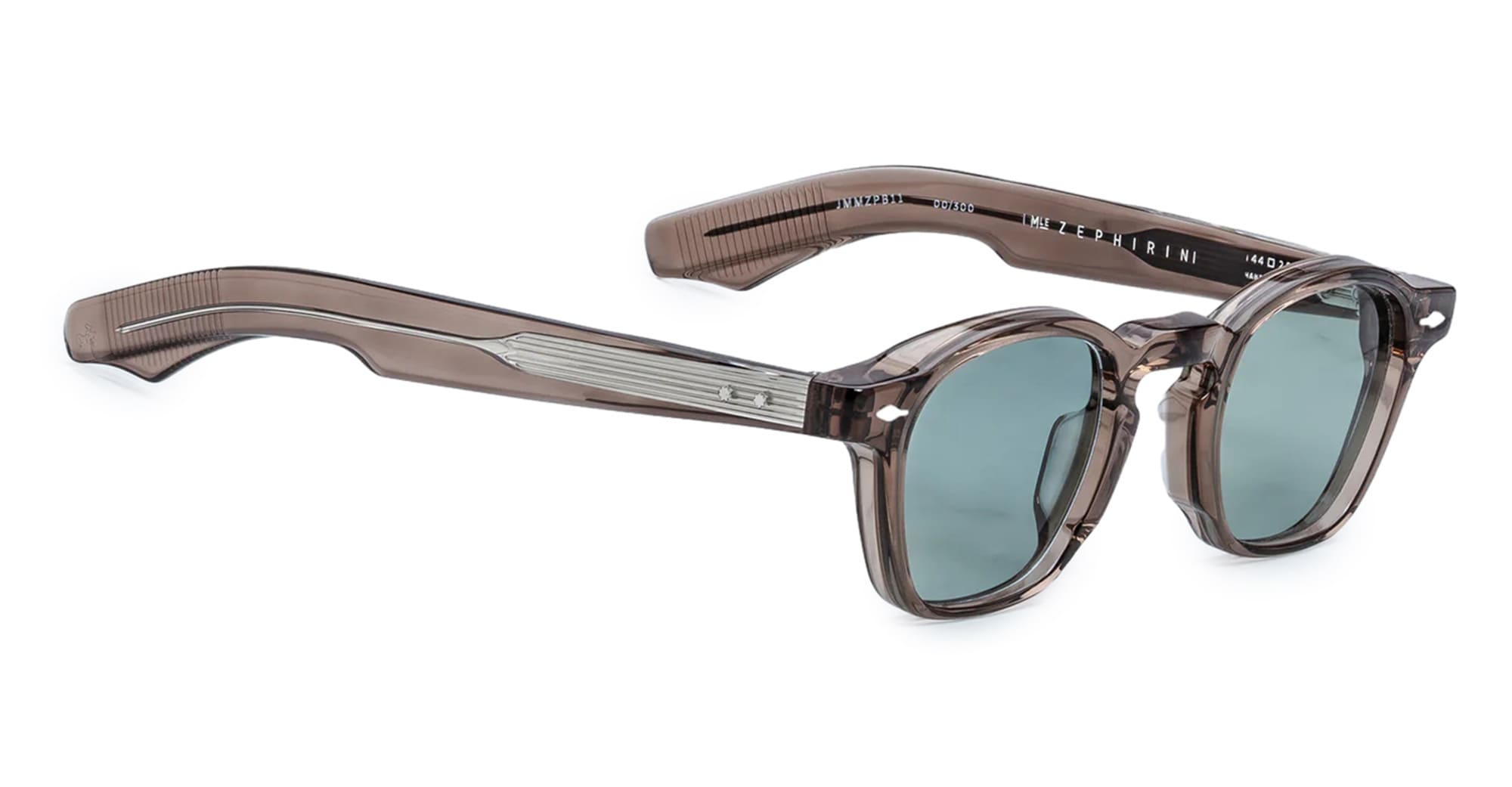 Jacques Marie Mage ZEPHIRIN 47 - DUSTY JADE (JMMZPX-B11) are squared sunglasses made in Japan, inspired by big thinkers and ambitious outcasts, like Pope Zephyrinus - a bigger version of the classic Zephirin. They feature a distinctive pre-WWII sizing, 10mm transparent brown cured cellulose acetate frame, custom double laminated sculpted acetate temples, silver arrowhead front pins, exposed wirecore, tension-secured custom 5 barrel hinge with spur-shaped rivets, jade green CR39 6 base lens with backside anti-reflective treatment and 100% UV protection.
