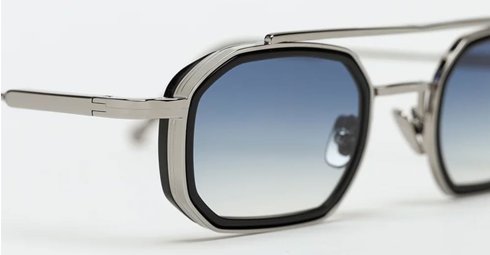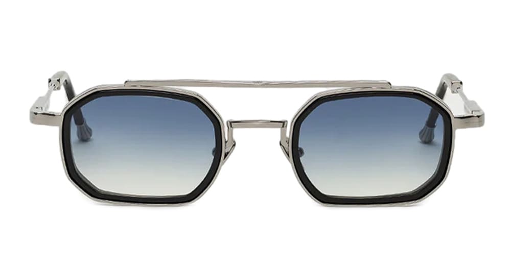 John Dalia ANTHONY - C107 - SHINY BLACK / RUTHENIUM PLATED (ANTHONY-C107) are rectangular masculine aviator shape sunglasses, made in France. They feature 4mm alloy engraved frame with ruthenium plating, brow bar, black acetate eyerim inserts and side shields, signature temples with John Dalia's engraved end pieces, custom nose pads, and gradient blue lens with anti-reflective treatment and 100% UV protection.