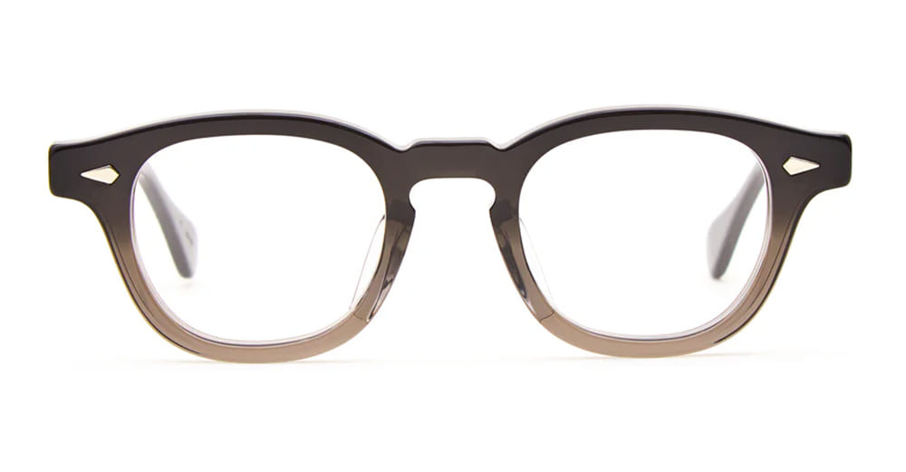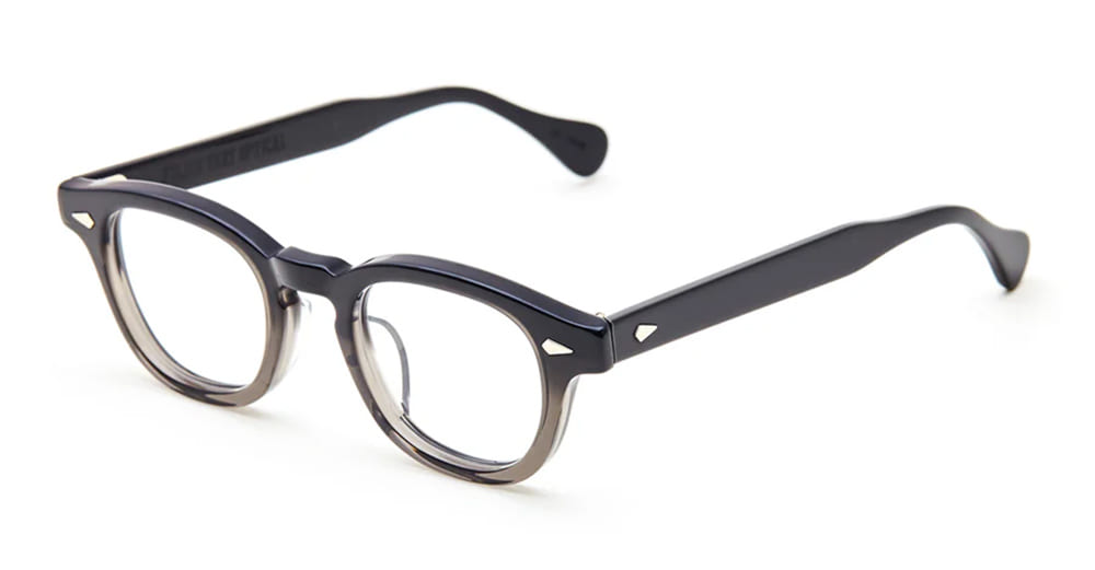 Julius Tart AR 44X24 - DARK BLACK FADE RX (JTPL-101Bb) are vintage-inspired pantos eyeglasses made in Japan. They feature black fade acetate structure with distinctive keyhole bridge, horizontal diamond-shaped front pins on front and temples.