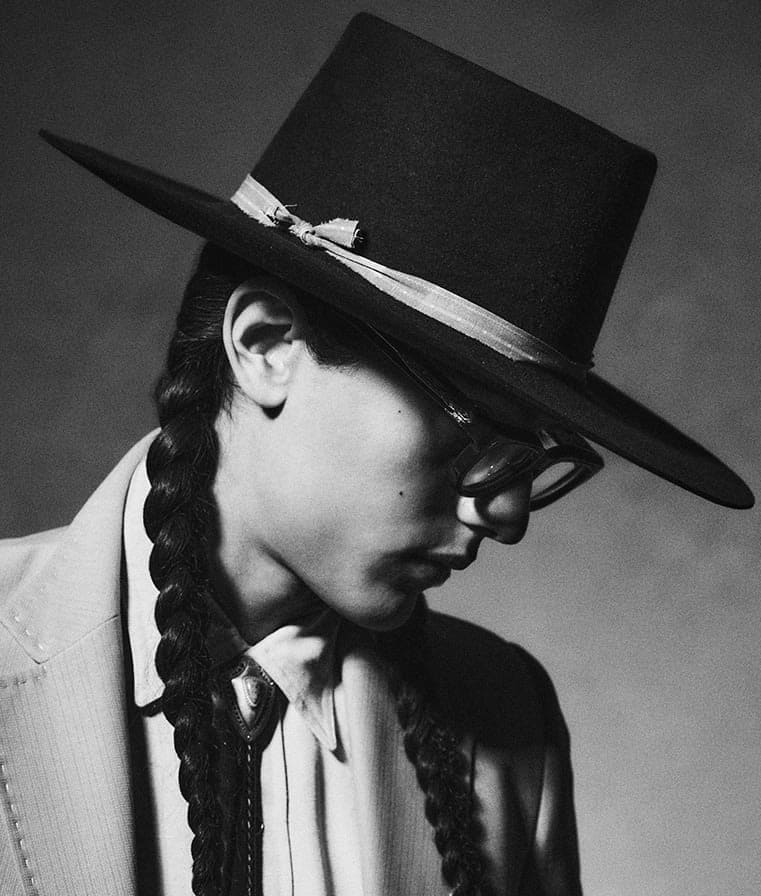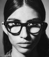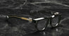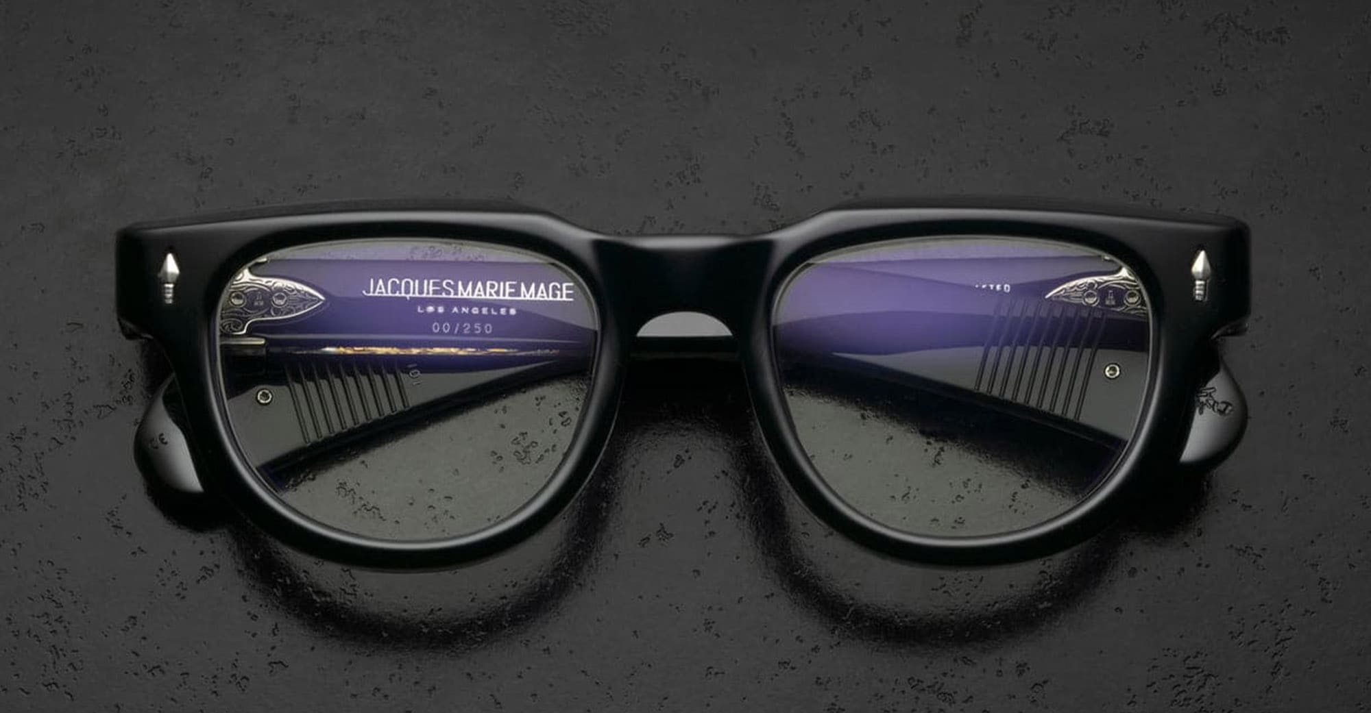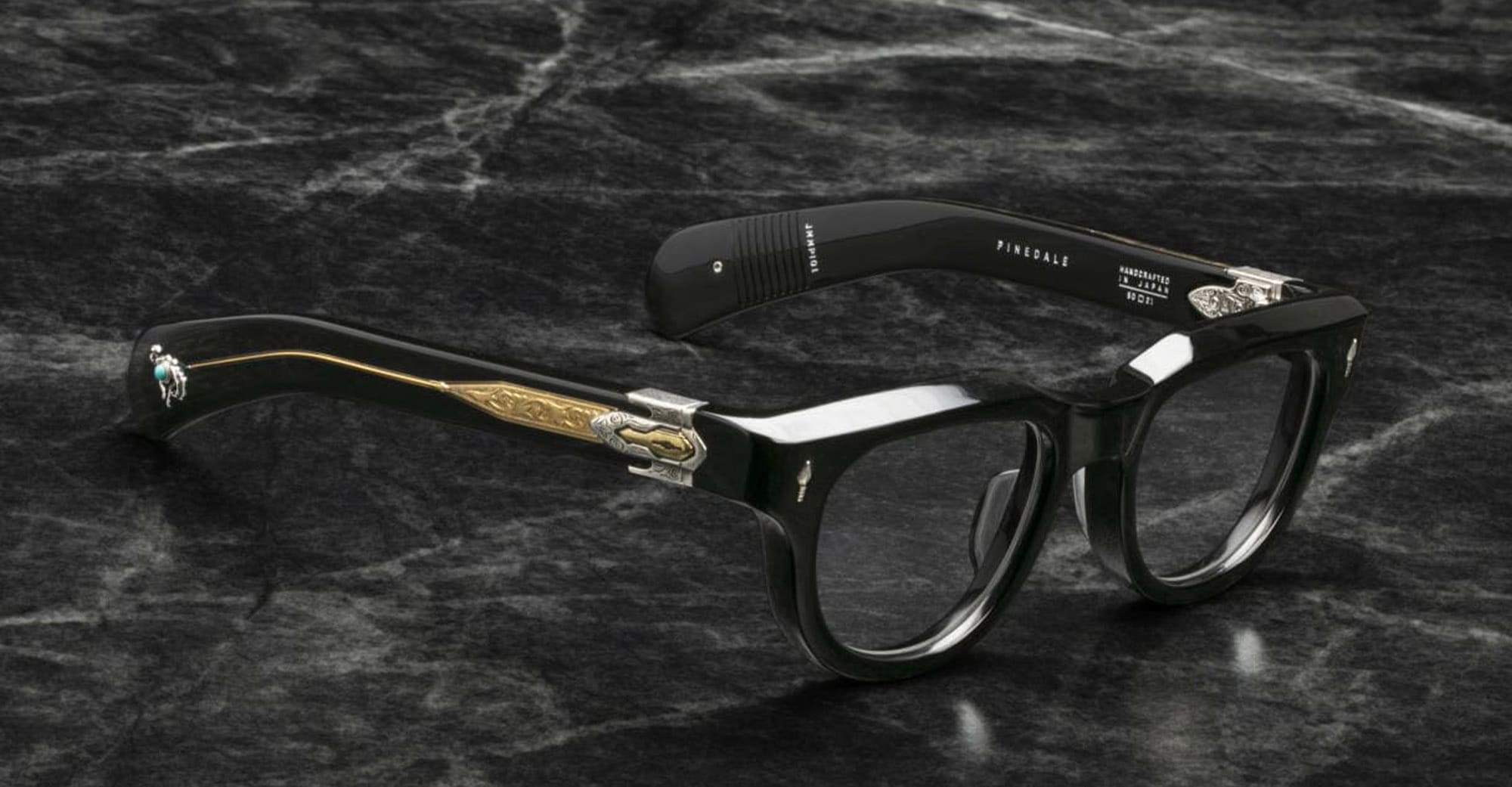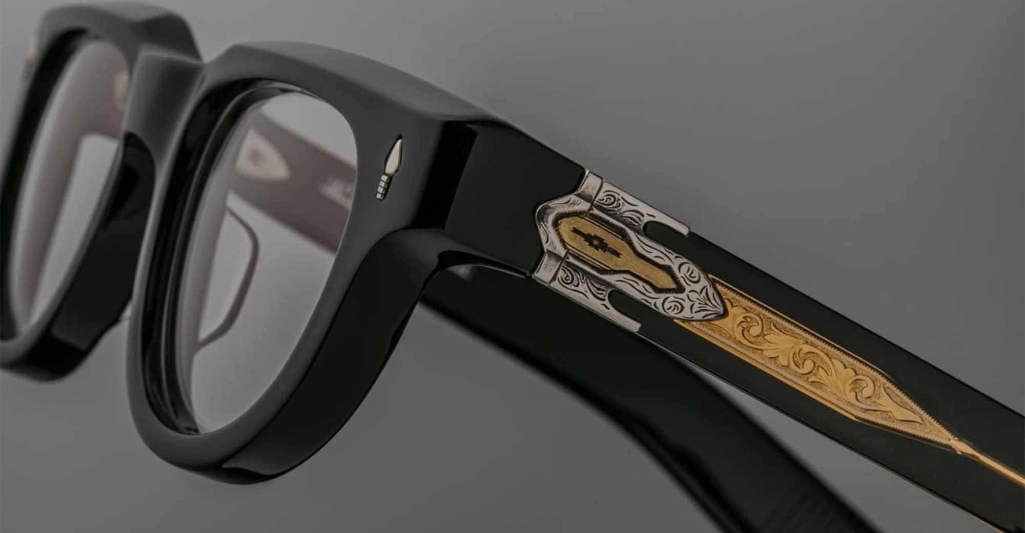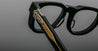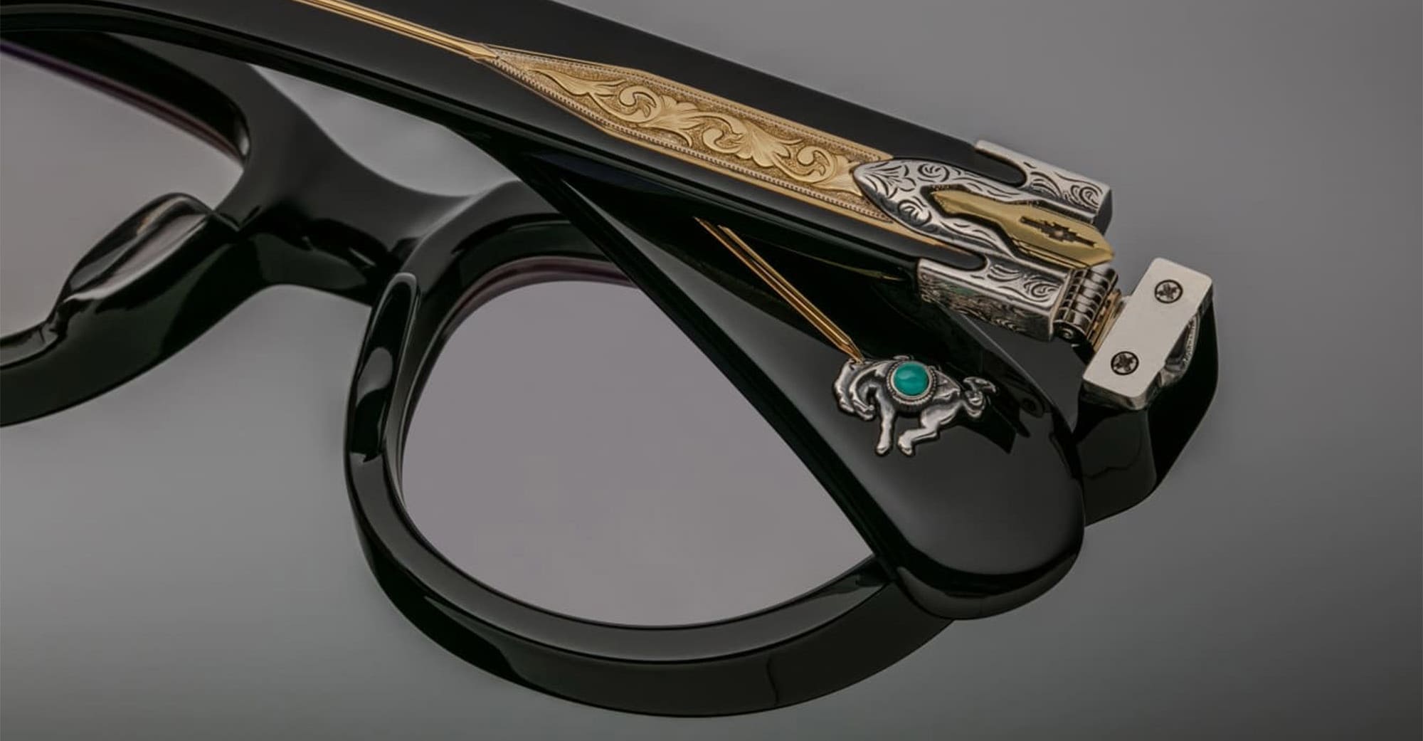 Jacques Marie Mage LAST FRONTIER IV - PINEDALE - NOIR RX (JMMPIRX-01) are exclusive optical glasses from the Last Frontier collection with 50s-inspired lens shape, unique paddle temples with elaborately engraved wirecore including new wild horse cameo with turquoise inlay at the temple tip. They feature brown 10mm cured cellulose acetate frame, two-tone precious metal hardware, sterling silver arrowhead front pin, dark gold exposed wirecore with custom Chimayo textile-inspired filigree engraving, sterling silver tension-secured custom 7 barrel hinge, and sterling silver temple tip bronco cameo with turquoise inlay.