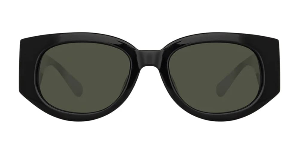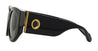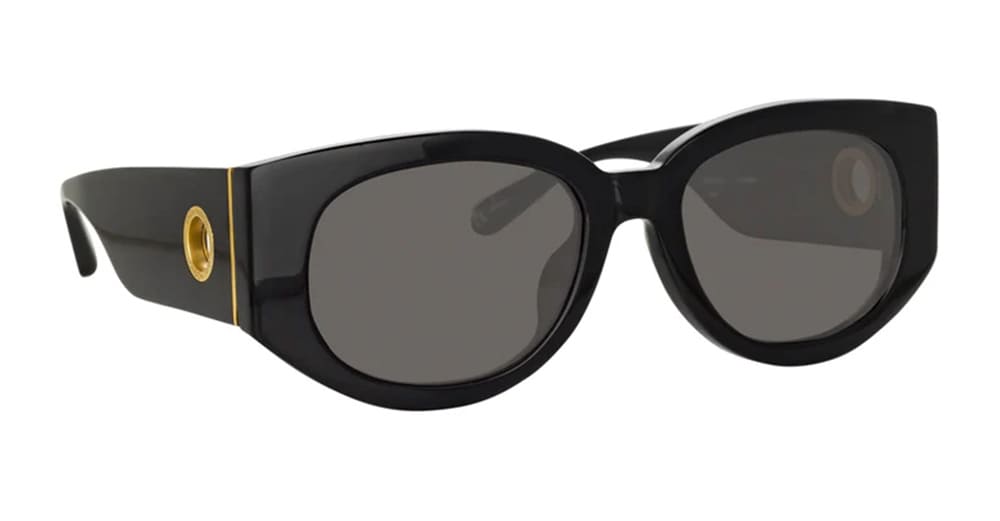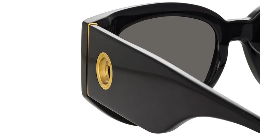LINDA FARROW DEBBIE - BLACK / YELLOW GOLD (LFL1059C1SUN) are chic, stylish squared sunglasses with a D-frame shape. They feature sculpted Italian black acetate frame, wide acetate temple with rounded temple tips for maximum comfort, Linda Farrow golden circular eyelet with logo on sides, and grey Zeiss lens with 100% UV protection.