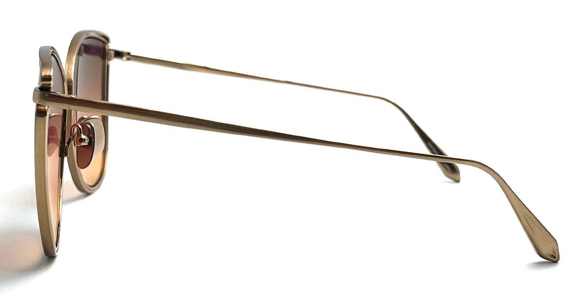 LINDA FARROW DINAH - MATT CHAMPAGNE (LFL1422C7SUN) are sophisticated oversize cat-eye sunglasses made in Japan. They feature a black matte champagne titanium structure, custom nose pads, and gradient pink Zeiss lens with 100% UV protection.