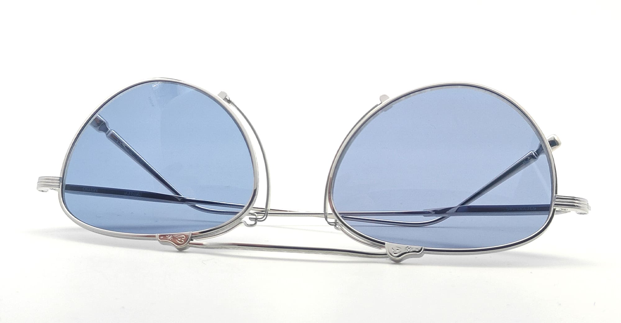 Matsuda M3130 - PALLADIUM WHITE (M3130.SG.PW.53) are round sunglasses made in Japan, inspired by the gothic architecture of Paris. They feature lightweight palladium white titanium frame, titanium brow bar and temples, hand applied lacquer, blue lens with 100% UV protection.