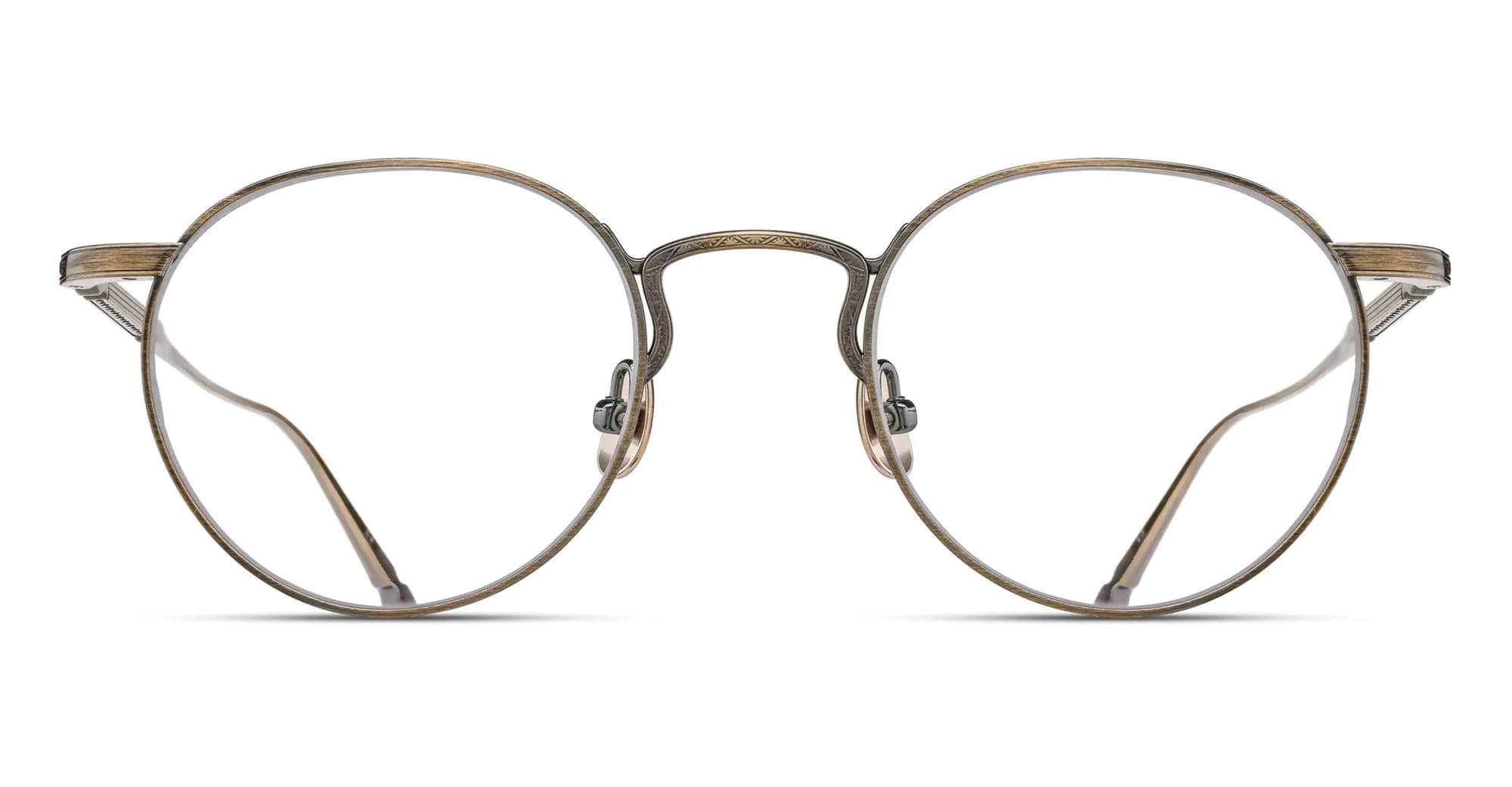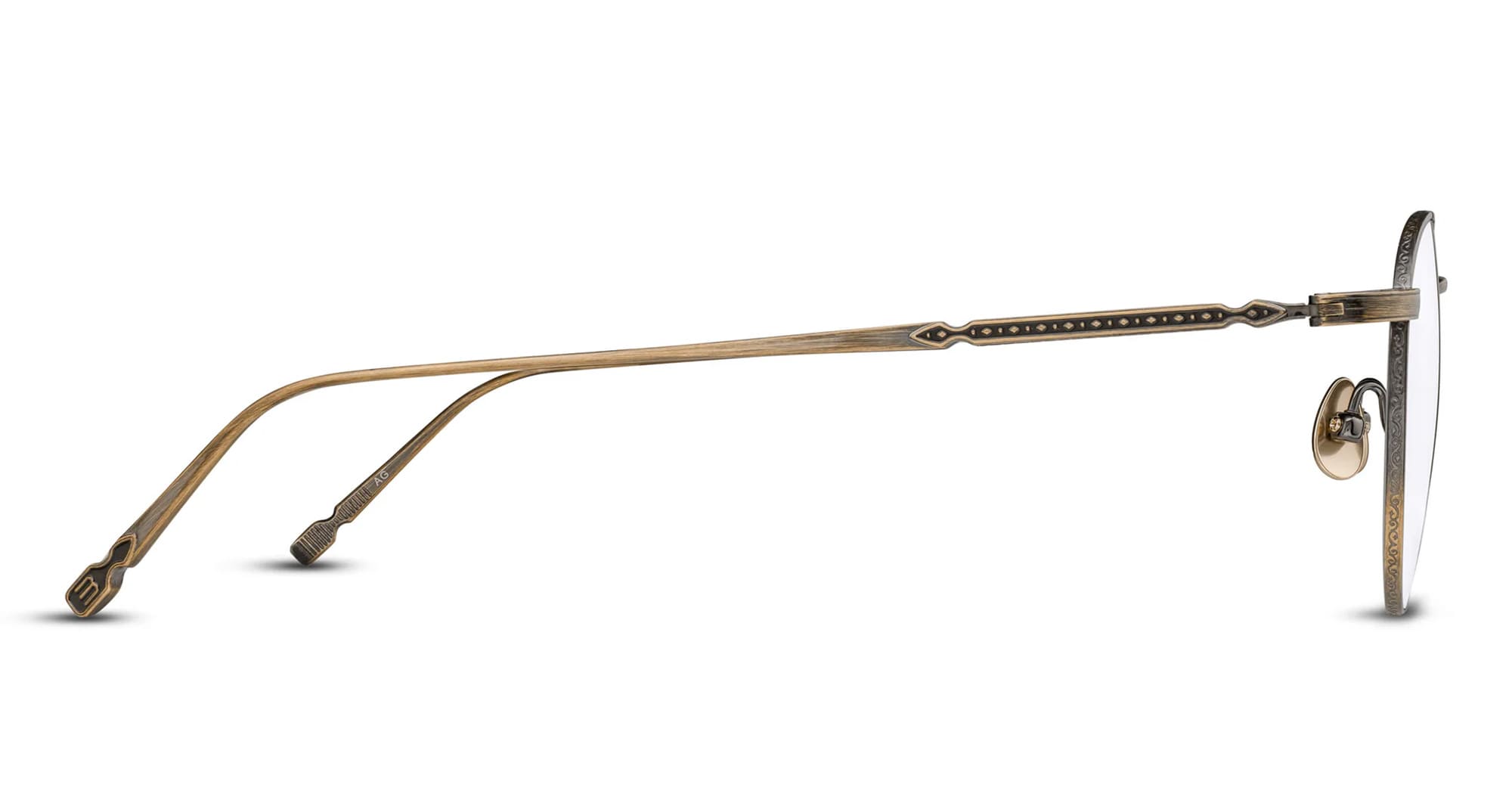 Matsuda M3140 - BRUSHED GOLD RX (M3140.RX.BG.50) are pantos eyeglasses made in Japan, a reinterpretation of a classic pantos style. They feature brushed gold lightweight titanium construction with Matsuda signature engraving design, titanium art-deco inspired temples with hand applied lacquer.