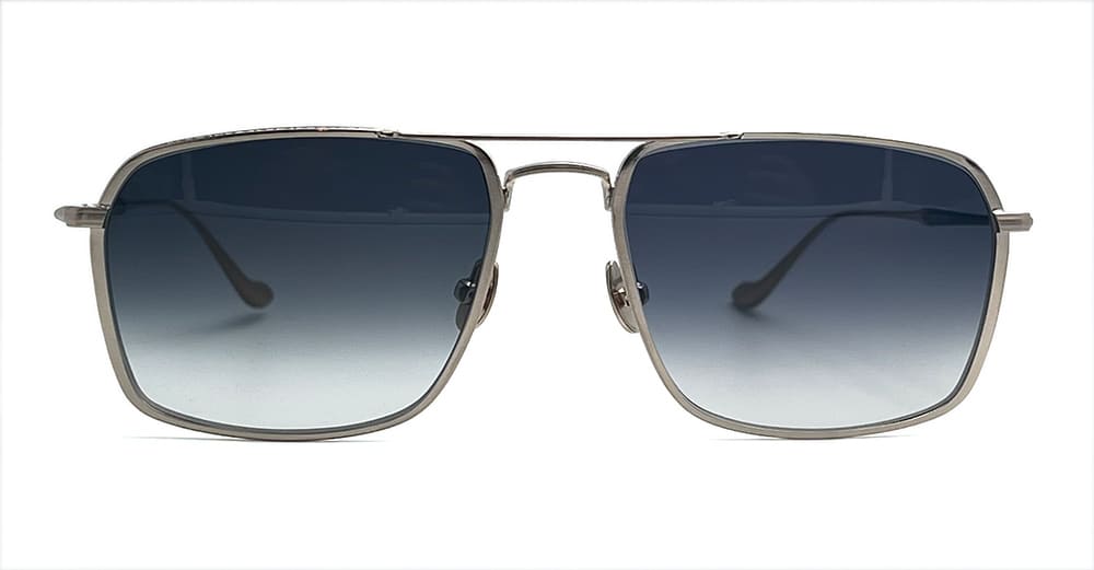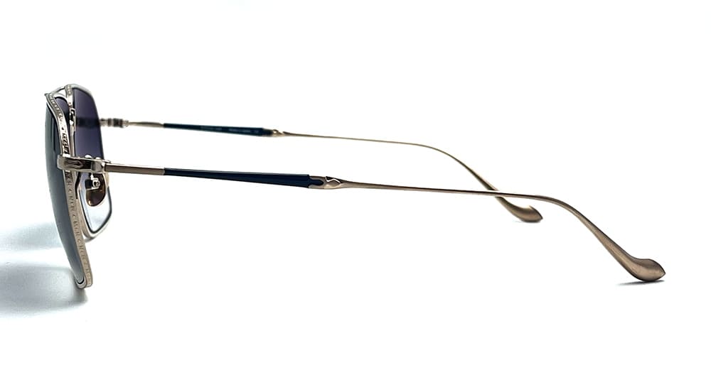 Matsuda M3146 - BRUSHED GOLD (M3146.SG.BG.57) are large classic navigator sunglasses, made in Japan. They feature brushed gold lightweight structure, double nose bridge, elegant titanium temples with blue accent, custom nose pads, and blue lens with 100% UV protection.