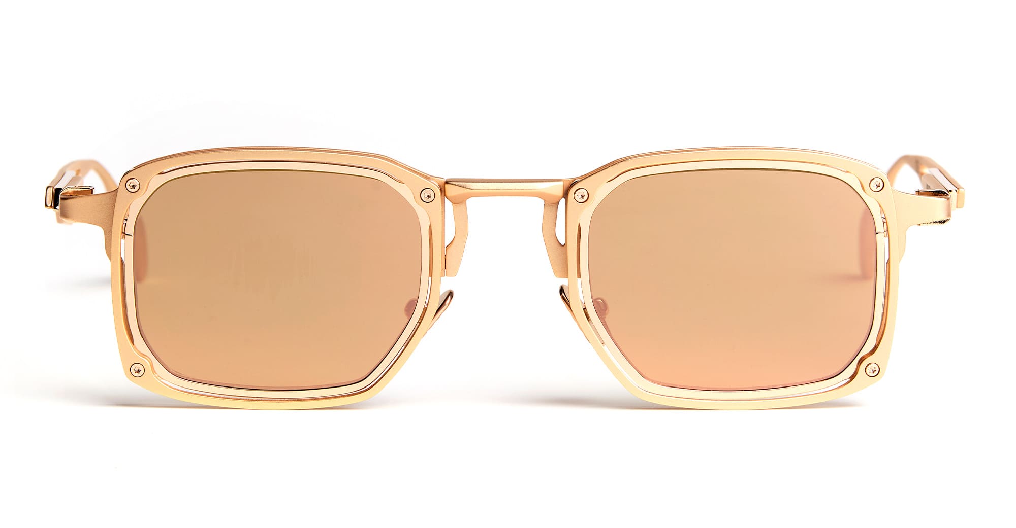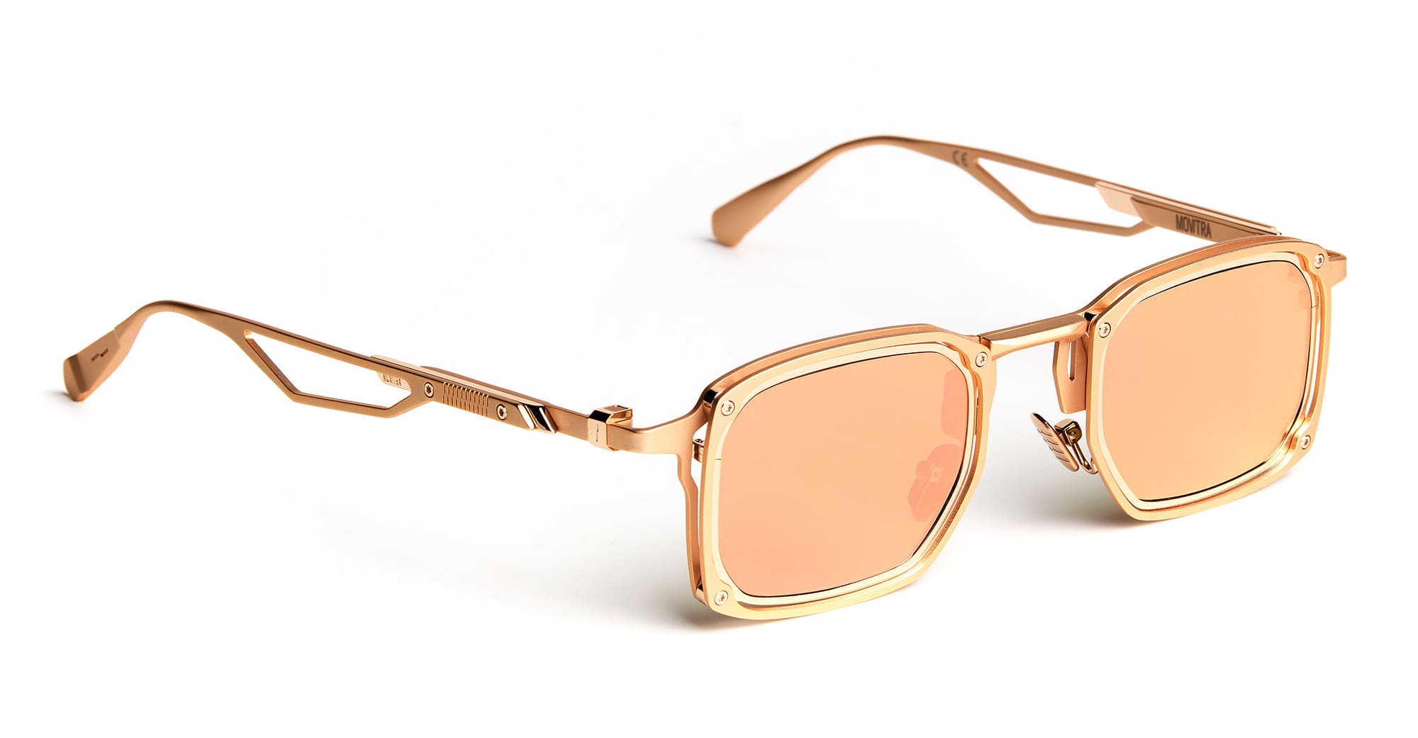Movitra TRINITAS 02 - C3 ROSE GOLD / ROSE GOLD LENS (TRINITAS 02-C3) are modern rectangular sunglasses handcrafted in Italy, part of the innovative Movitra collection. They feature rose gold titanium structure with brushed rose gold galvanic inserts, integrated MOTUS rotation mechanism behind the lens, custom nose pads, anti-unscrewing hinge, external bumper insert with brushed finish, stamped-cut temples, exposed screws and bushings with Torx heads, and rose gold mirror Zeiss lens with 100% UV protection.