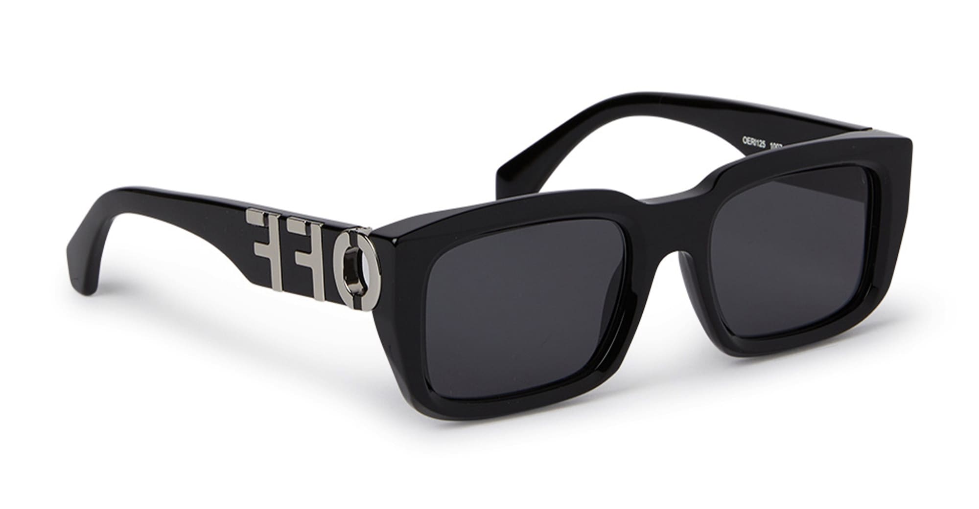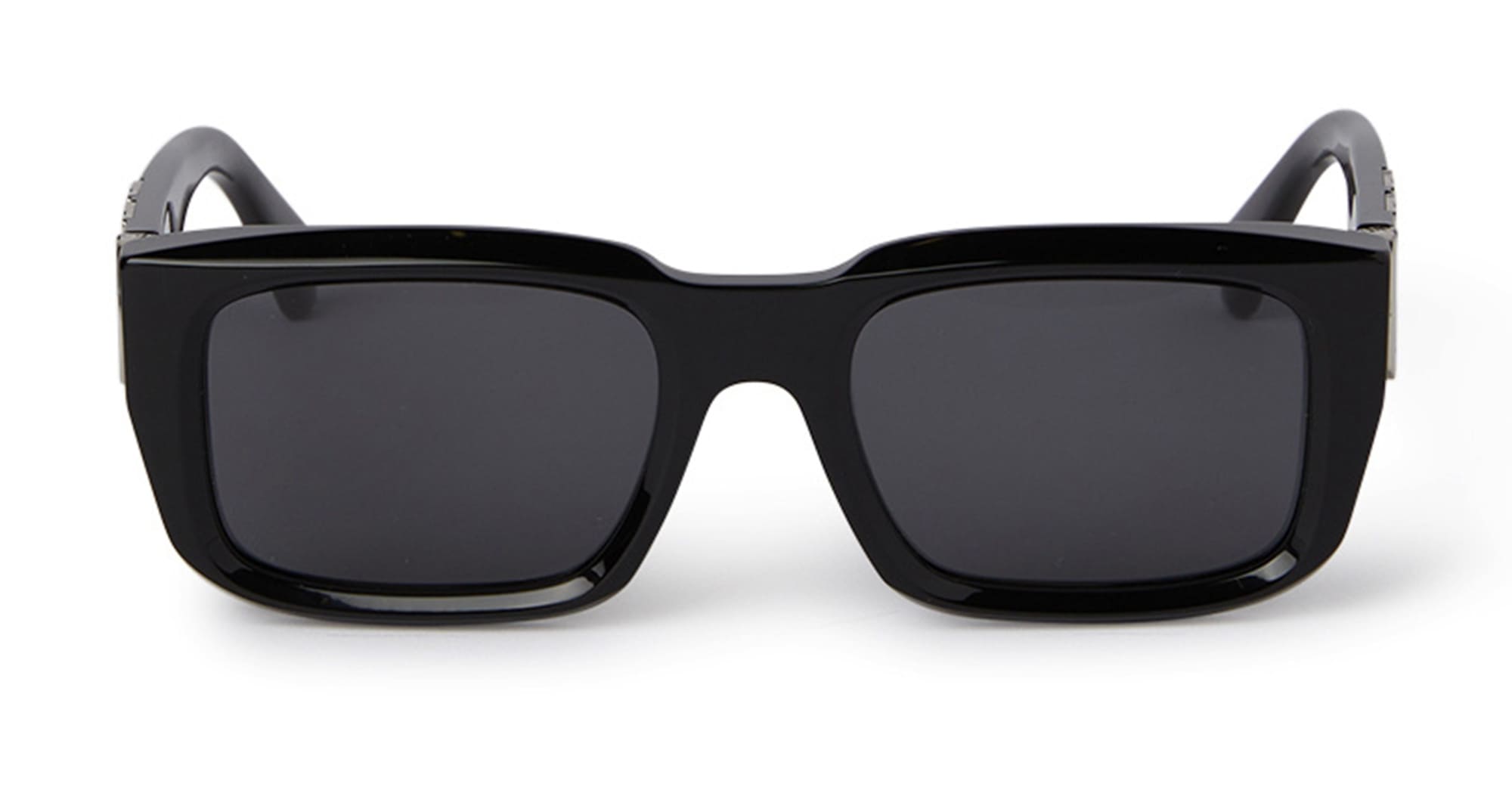 OFF-WHITE HAYS - BLACK / DARK GREY (OERI125S24PLA0011007) are oversize squared sunglasses with a diamond-like finish. They feature black acetate frame with deeply carved lens, avetate temples with oversize semi-gloss metal logo, and dark grey lens with 100% UV protection.