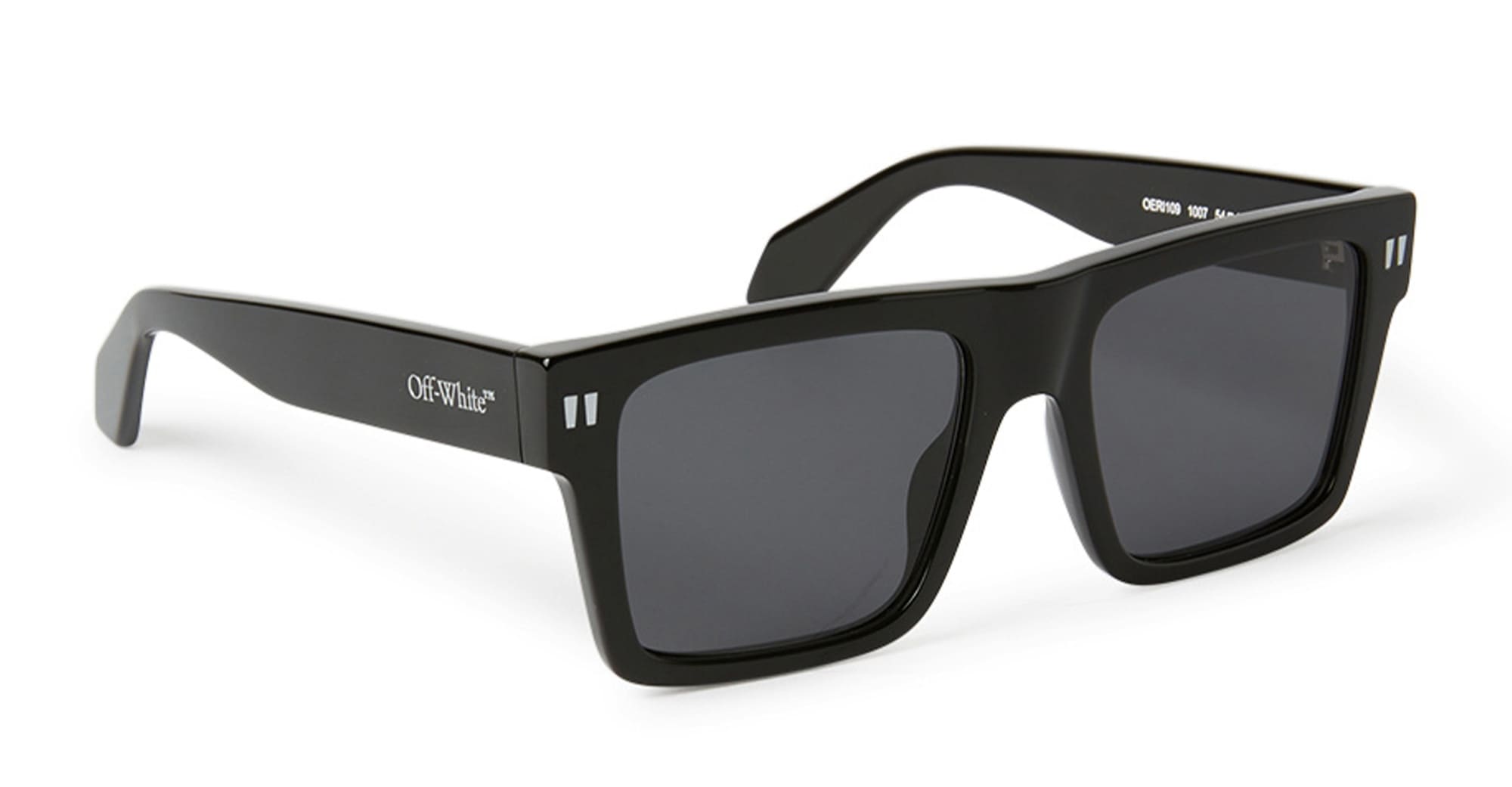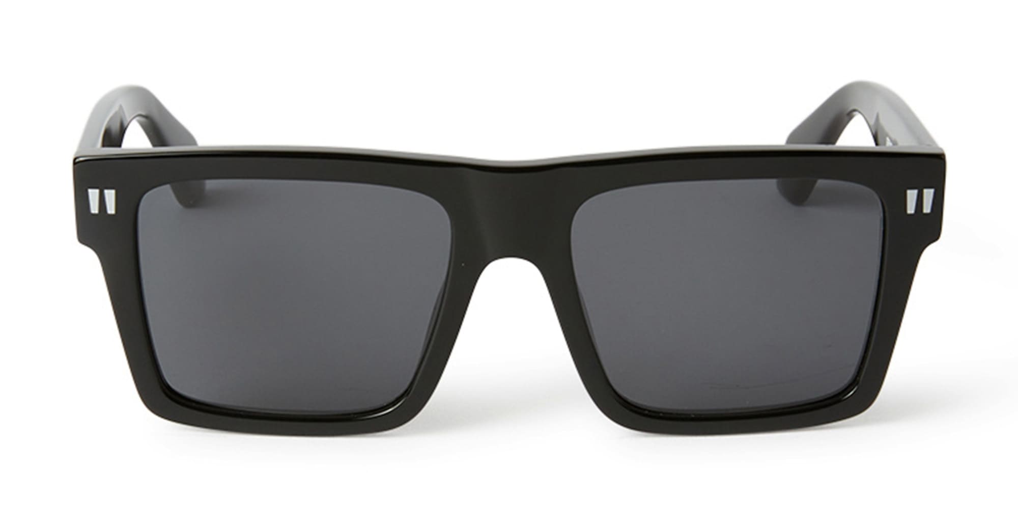 Off-White LAWTON - BLACK / DARK GREY (OERI109S24PLA001007) are squared sunglasses with an oversize geometric silhouette. They feature white acetate frame, flattened top edge and elongated side tips, signature quotation mark front pins, metal logo on temples, and dark grey lens with 100% UV protection.