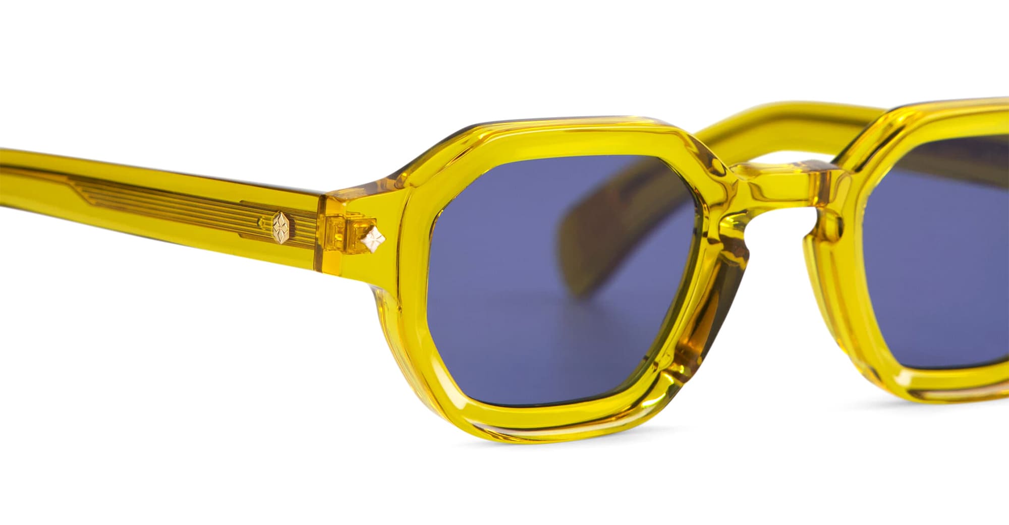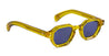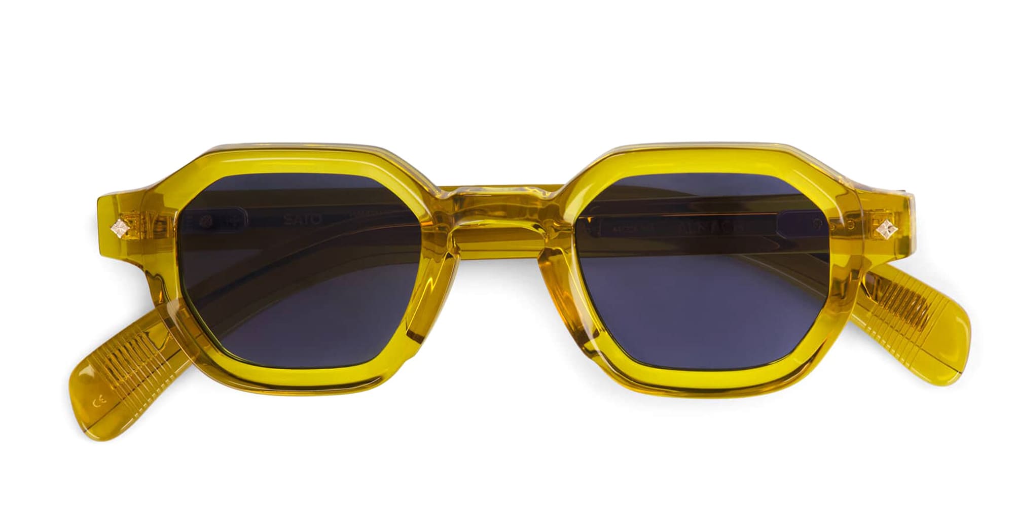 Sato ALMACH - BLONDE (ALMACH-BL-1) are exclusive hexagonal sunglasses made in Japan, part of the Sato Acetate Collection. They feature a transparent yellow Japanese takiron acetate frame, key-hole nose bridge, diamond-shaped front pins, engraved exposed metal wirecore, and 2 base blue lens with 100% UV protection.