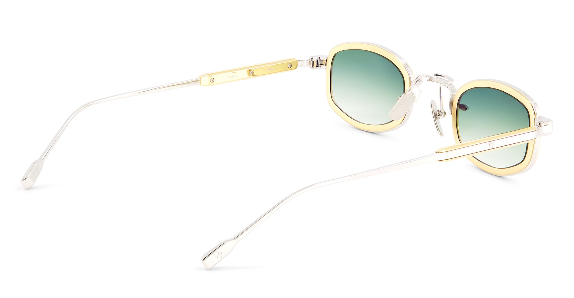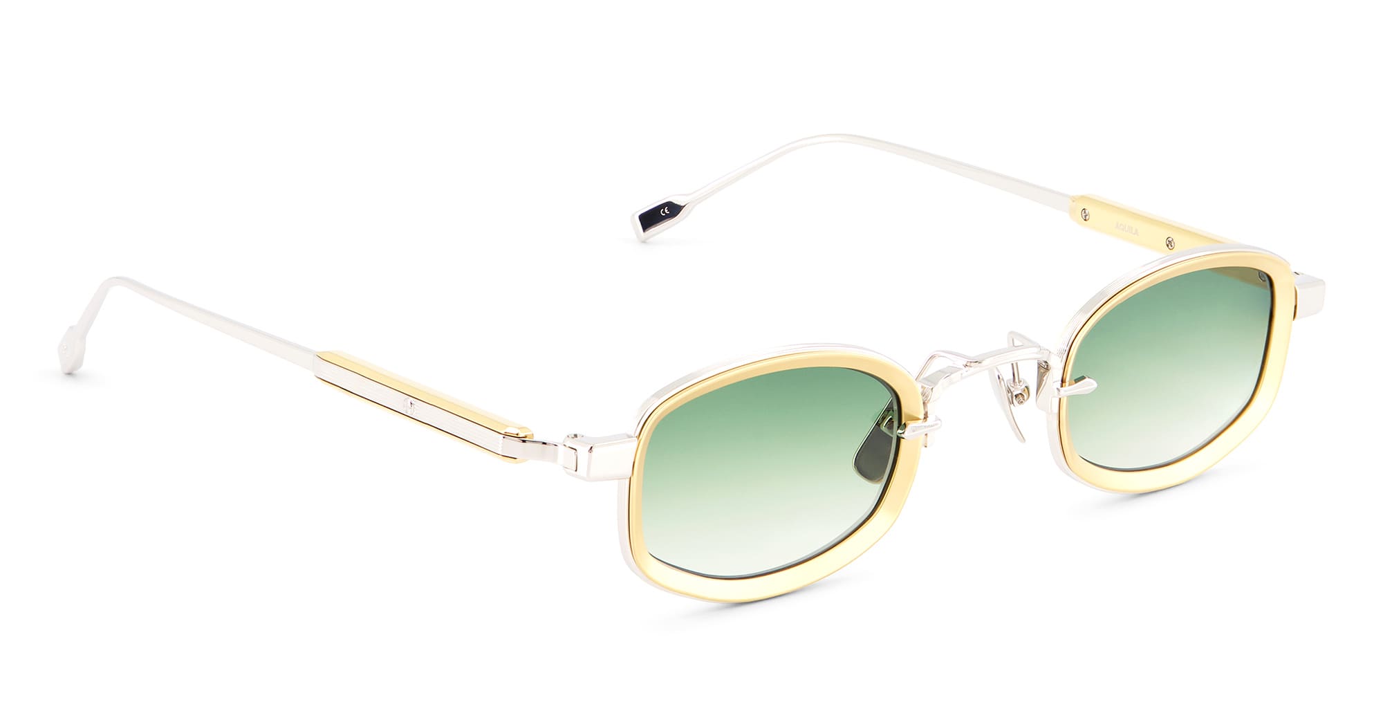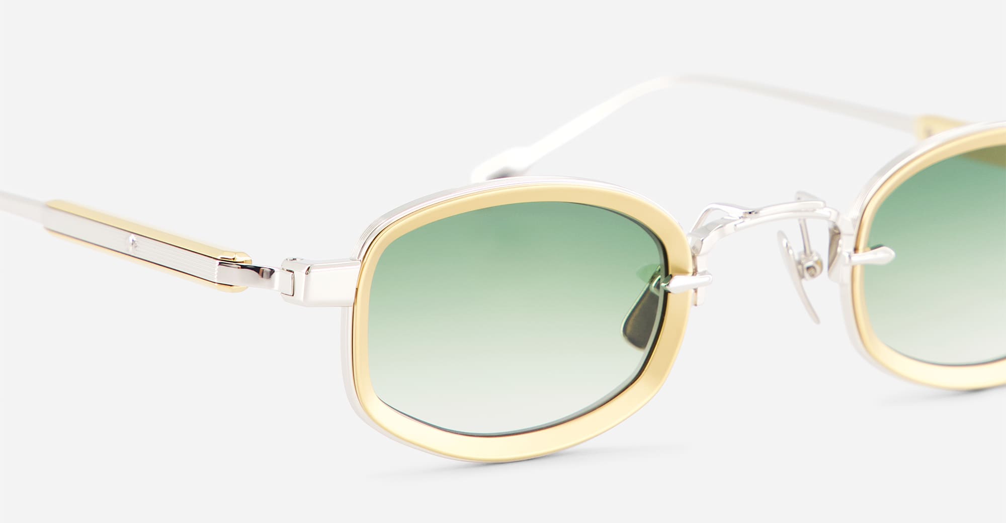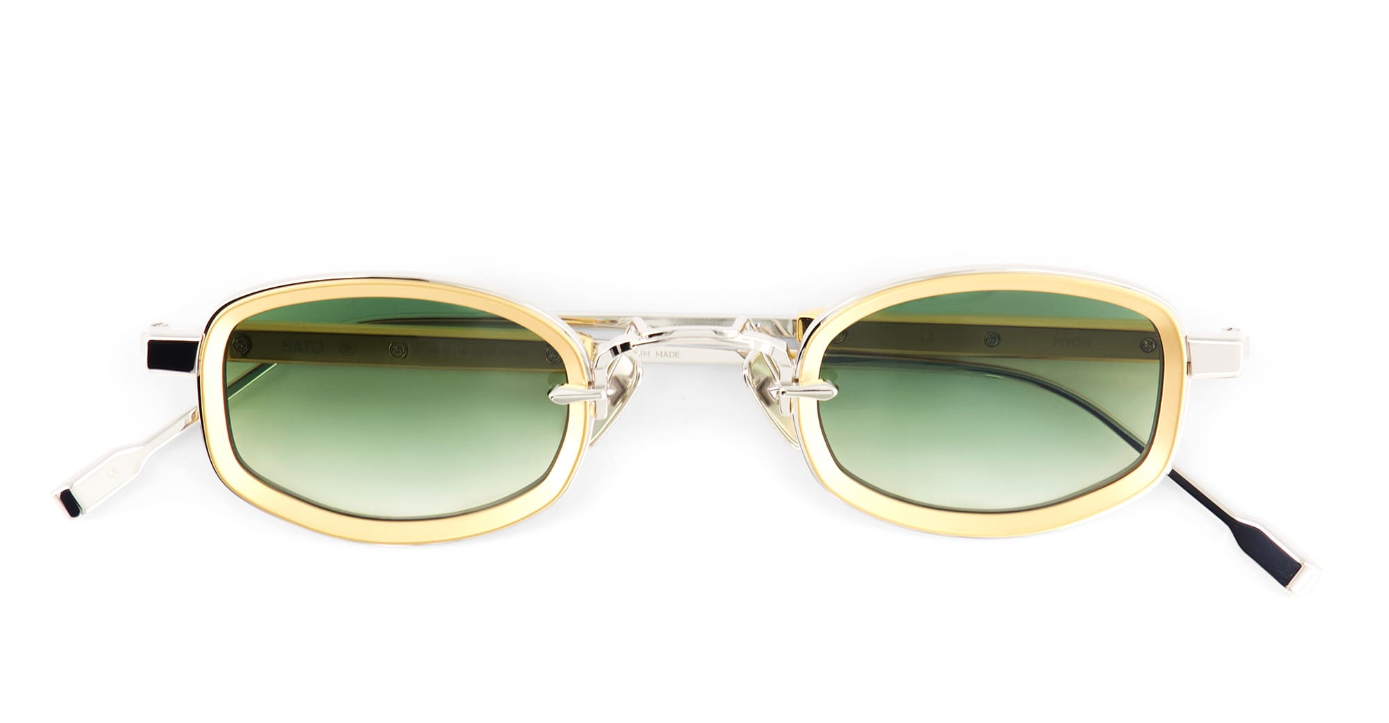 Sato AQUILA - PLATINUM / YELLOW GOLD (Aquila-P-YG-1) are oval sunglasses made in Japan, part ot the Sato Kyodai collection - inspired by the golden era of Japanese pop culture. They feature dual-tone yellow gold and platinum titanium structure, titanium temples with engraved decoration, custom titanium nose pads, and gradient green lens with 100% UV protection.