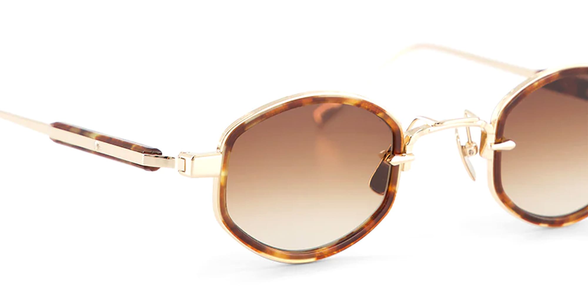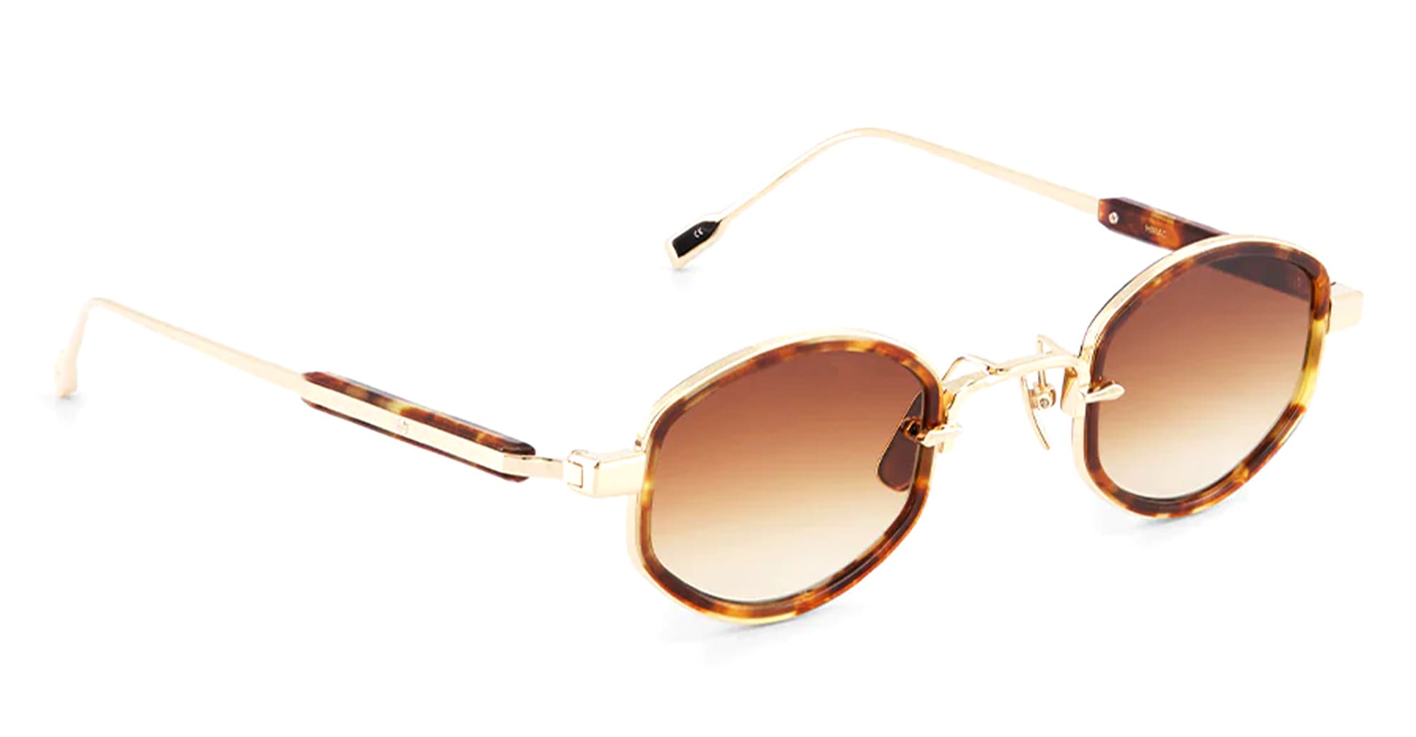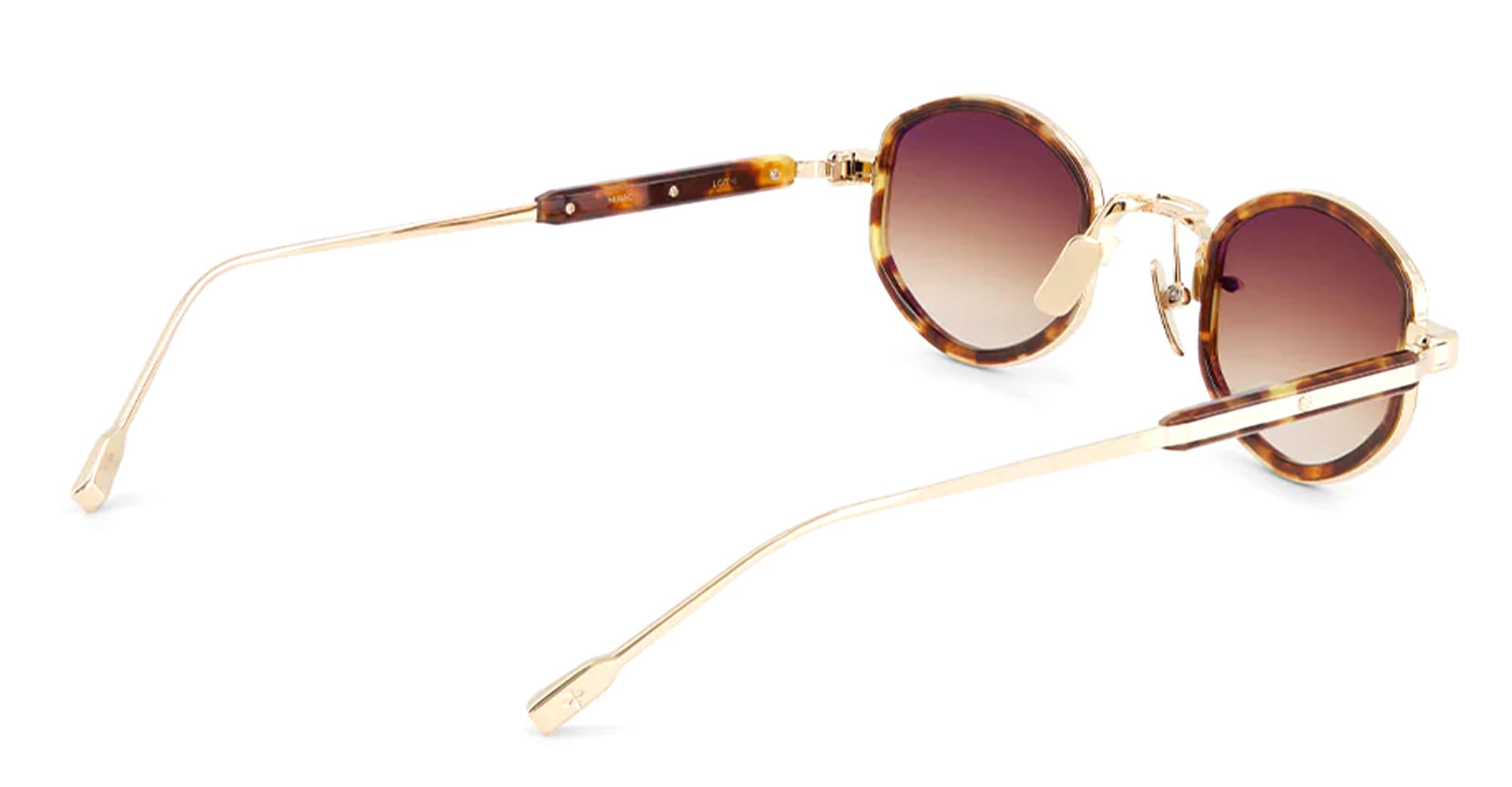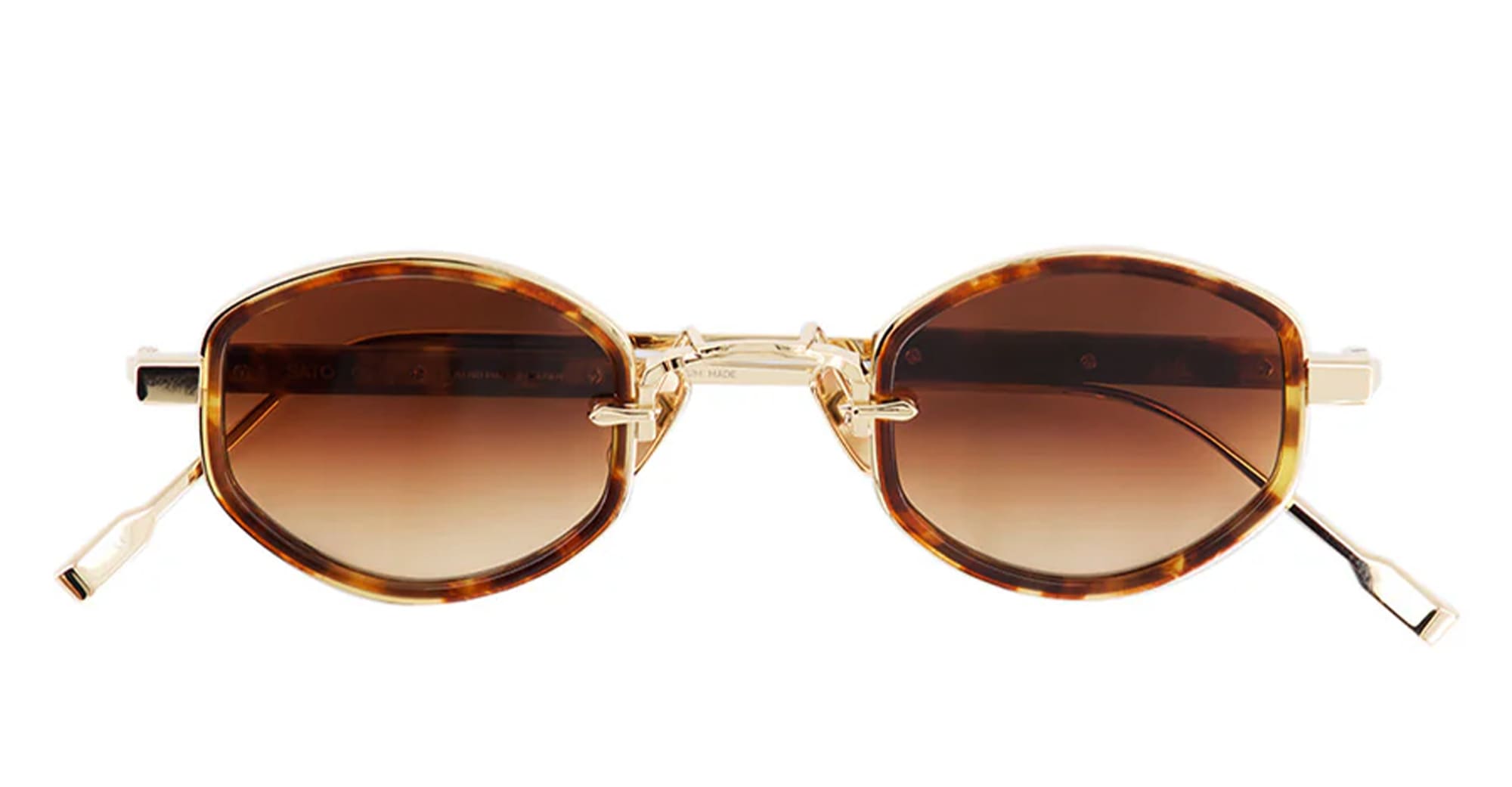 Sato MIRAC - LUNAR GOLD / TORTOISE (Mirac-LG-T-1) are oval sunglasses made in Japan. They feature lunar gold titanium structure, tortoise eyerim insert, titanium temples with engraved decoration, custom titanium nose pads, and gradient brown lens with 100% UV protection.