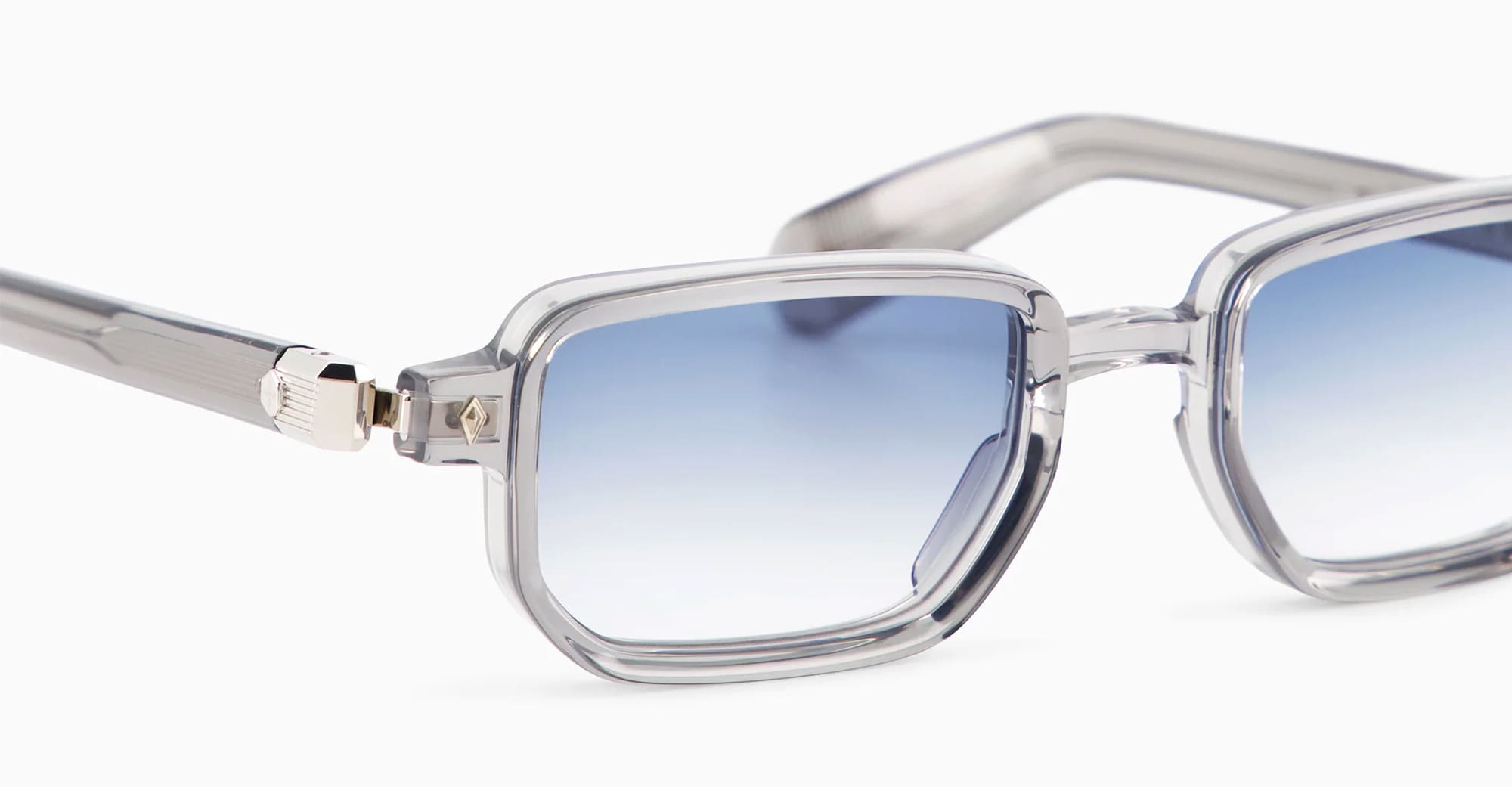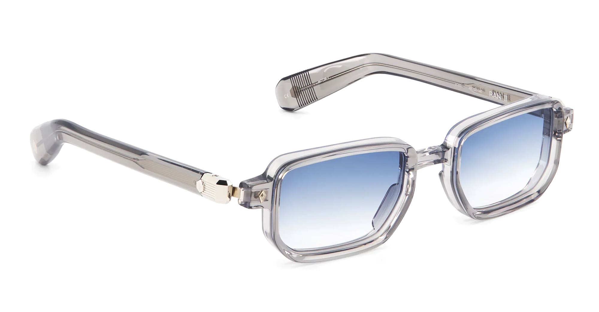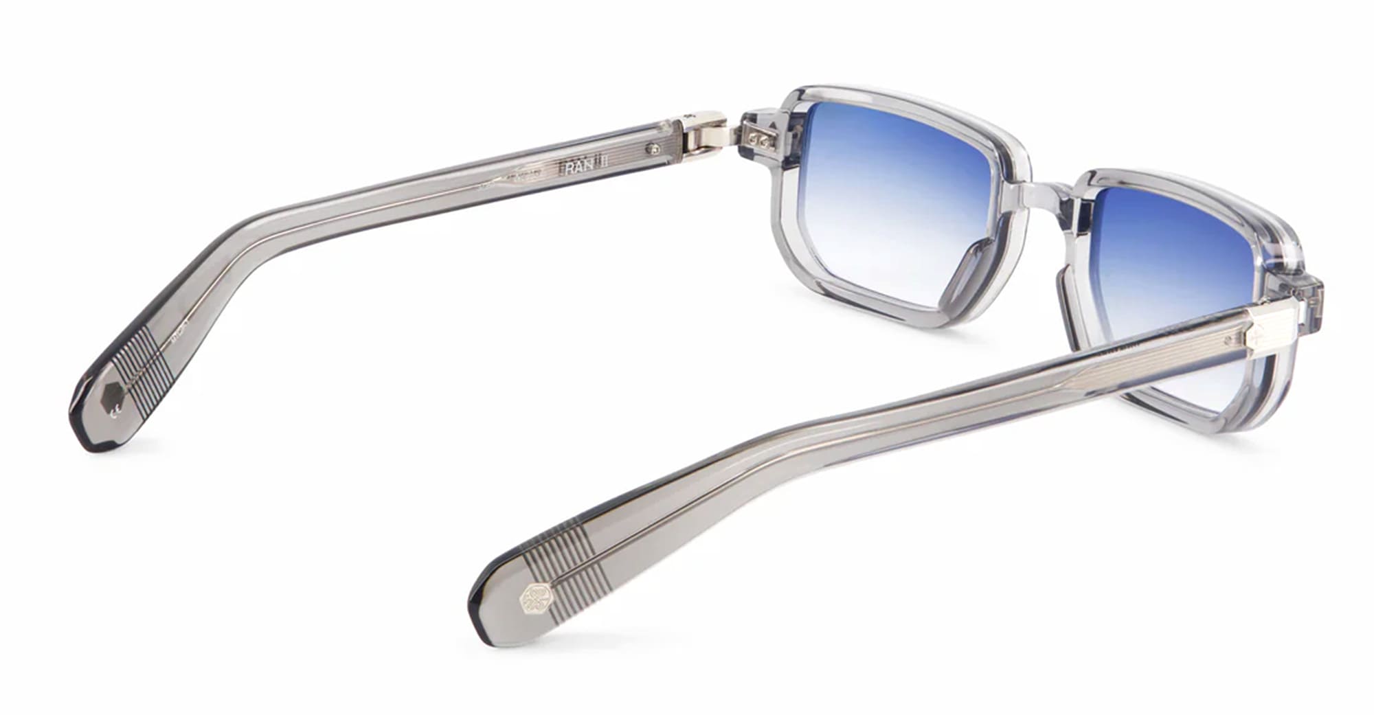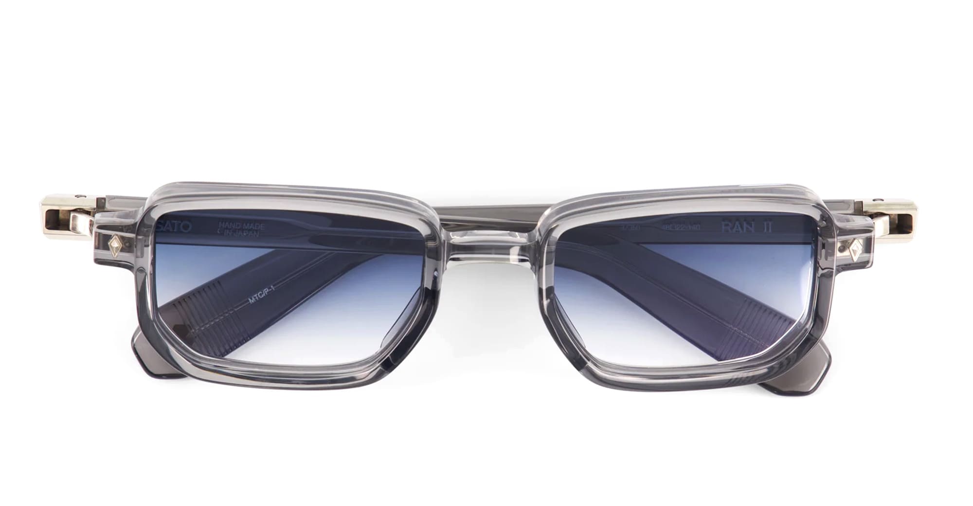 Sato RAN II - METEOR GREY / PLATINUM (Ran-II-MTC-P-1) are rectangular sunglasses made in Japan, part of the exclusive Sato eyewear collection. They feature transparent grey Japanese acetate frame with platinum coating hardware, diamond-shaped front pins, acetate temples, and gradient blue lens with 100% UV protection.