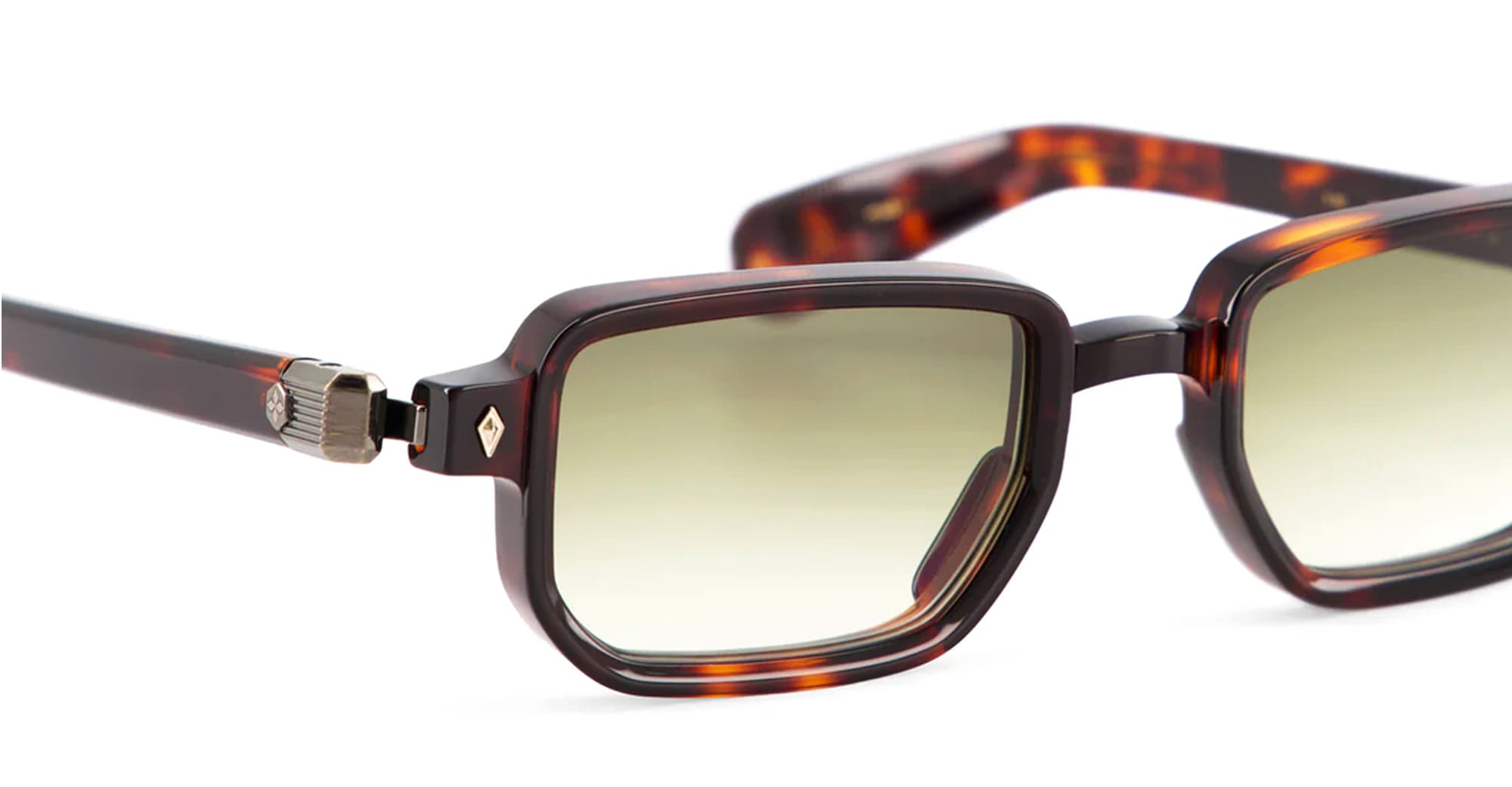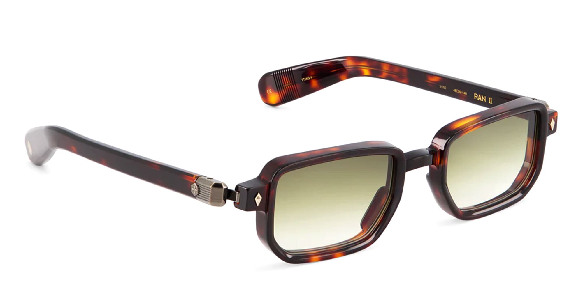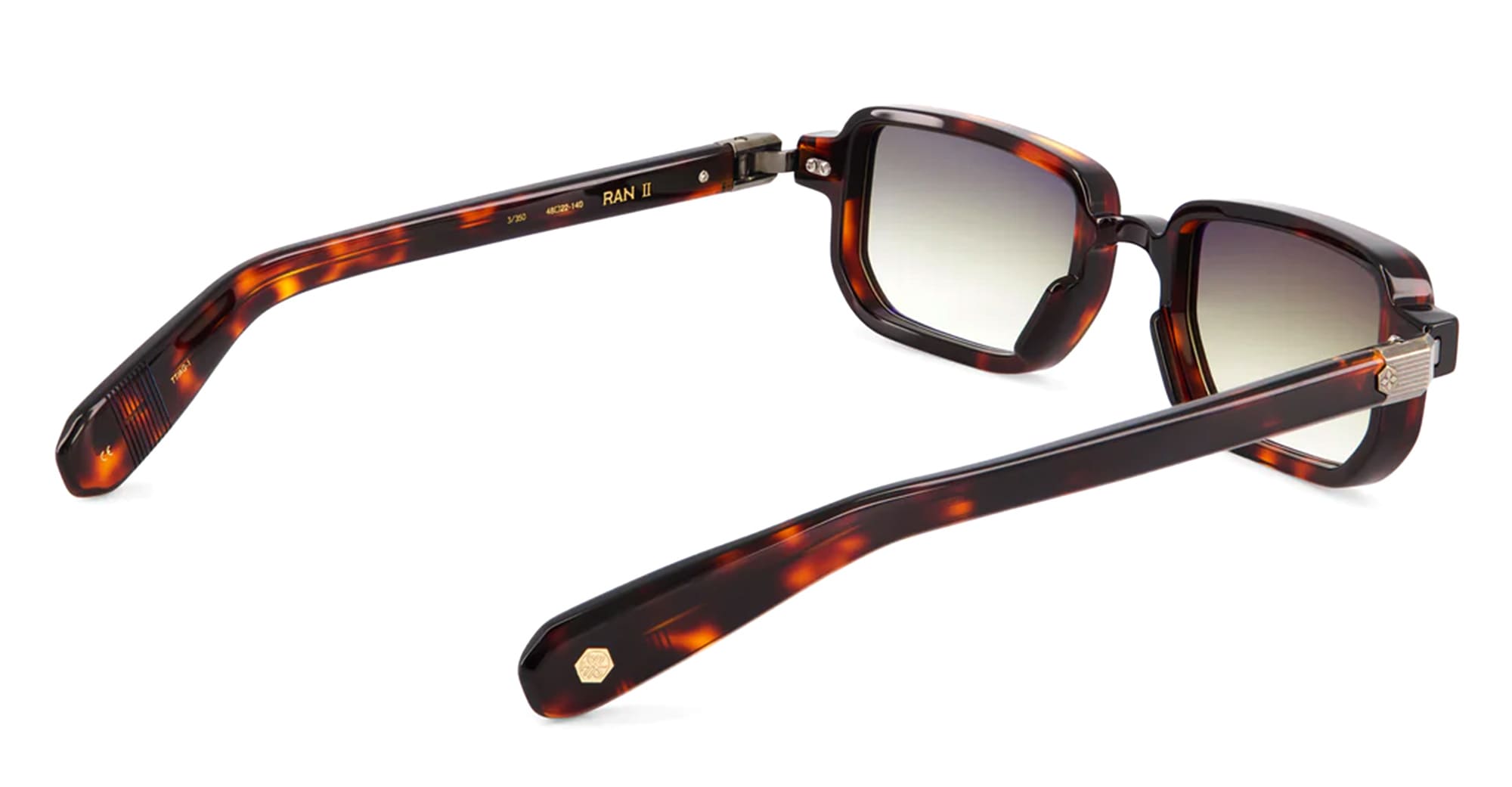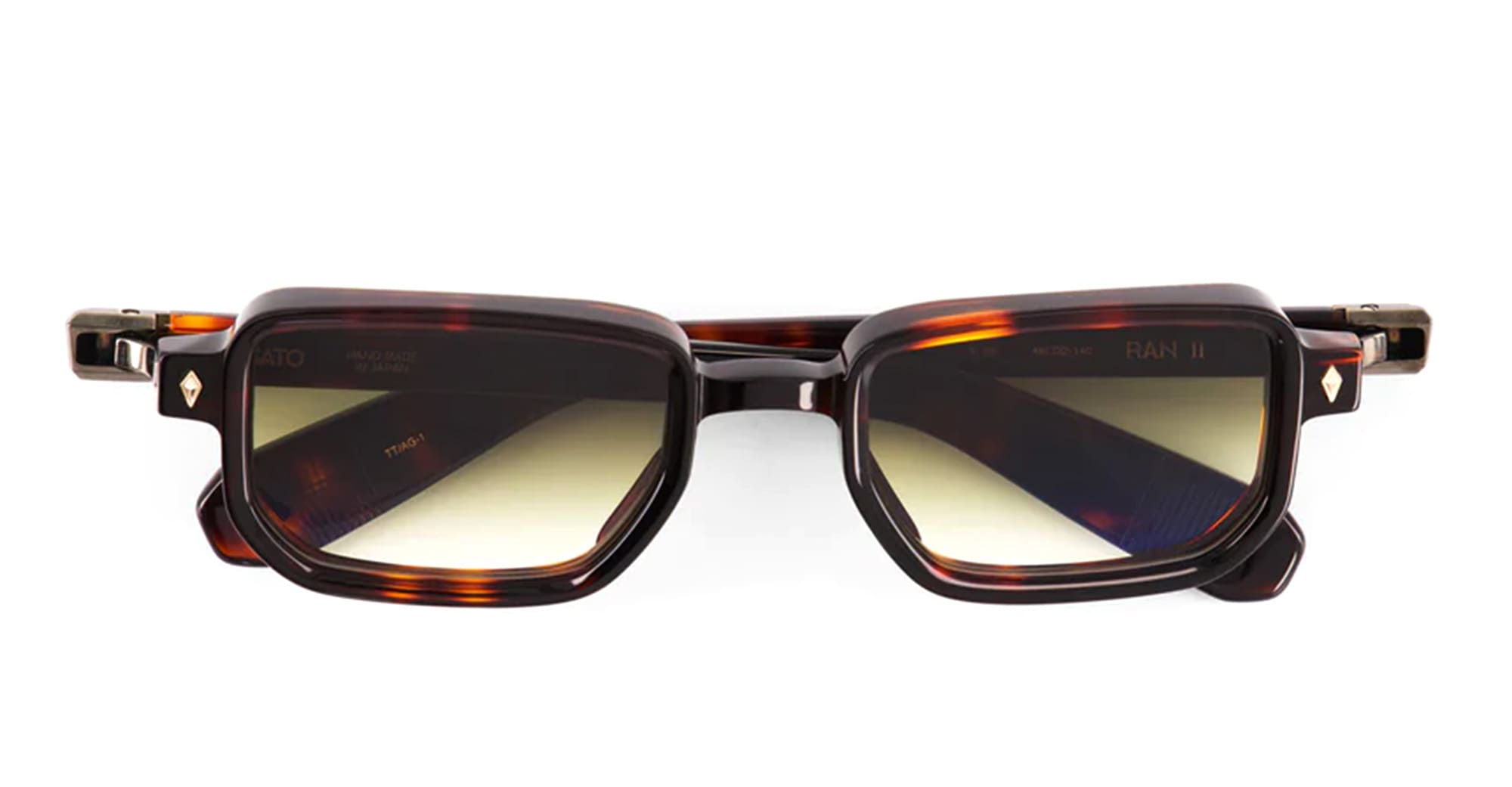 Sato RAN II - TOKYO TORTOISE / ANTIQUE GOLD (Ran-II-TT-AG-1) are rectangular sunglasses made in Japan, part of the exclusive Sato eyewear collection. They feature tortoise Japanese acetate frame with antique gold coating hardware, diamond-shaped front pins, acetate temples, and gradient green lens with 100% UV protection.