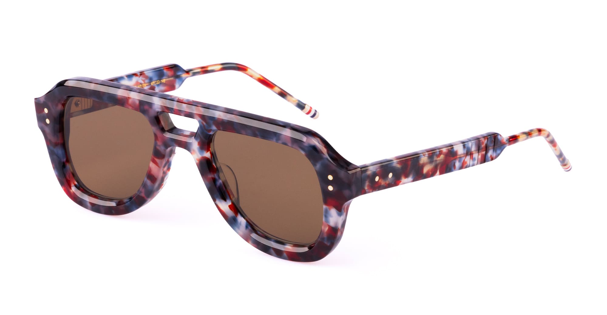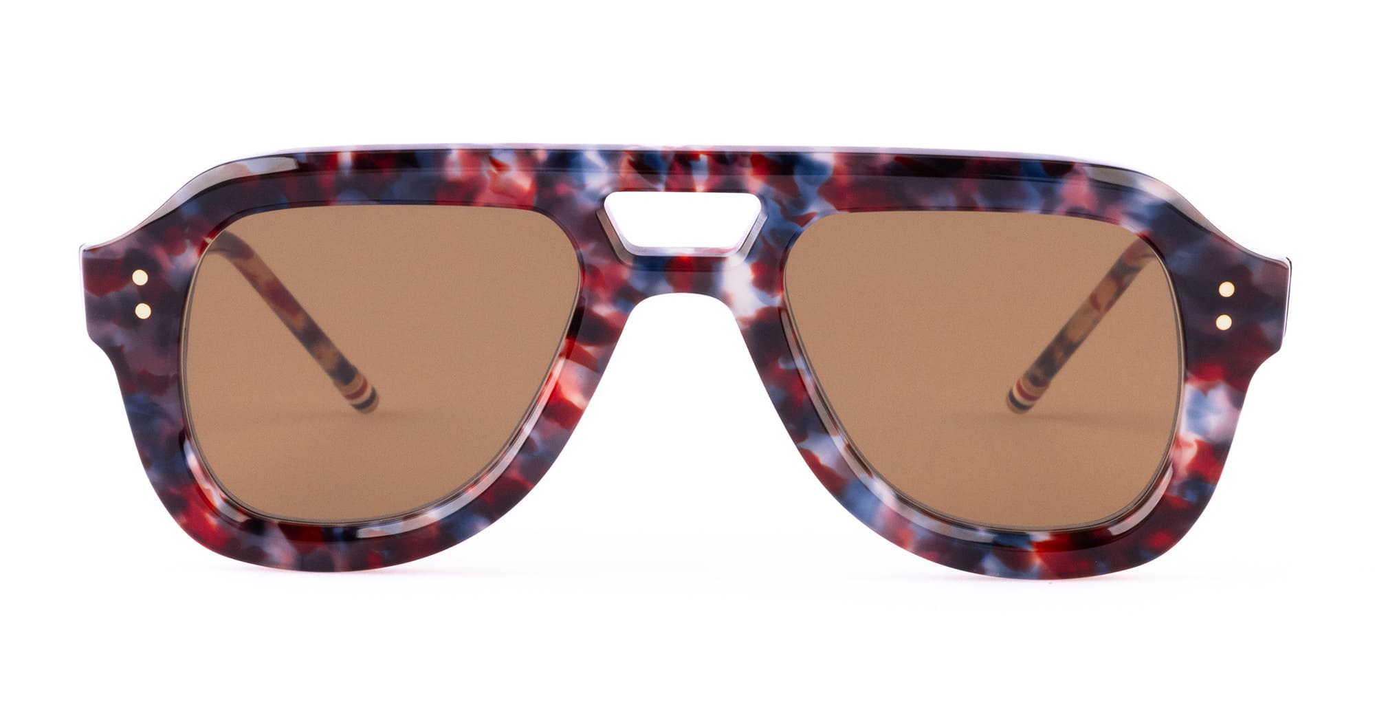Thom Browne RECTANGULAR AVIATOR SUNGLASSES - RWB TORTOISE (UES933A-G0002-960) are rectangular aviator sunglasses made in Japan. They feature red, white and blue tortoise acetate frame, 12k gold-plated harware, signature 4-bars, iconic Thom Browne striped enamel temple tips, and dark brown lens with 100% UV protection.