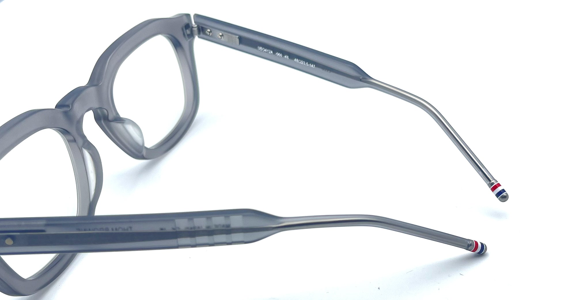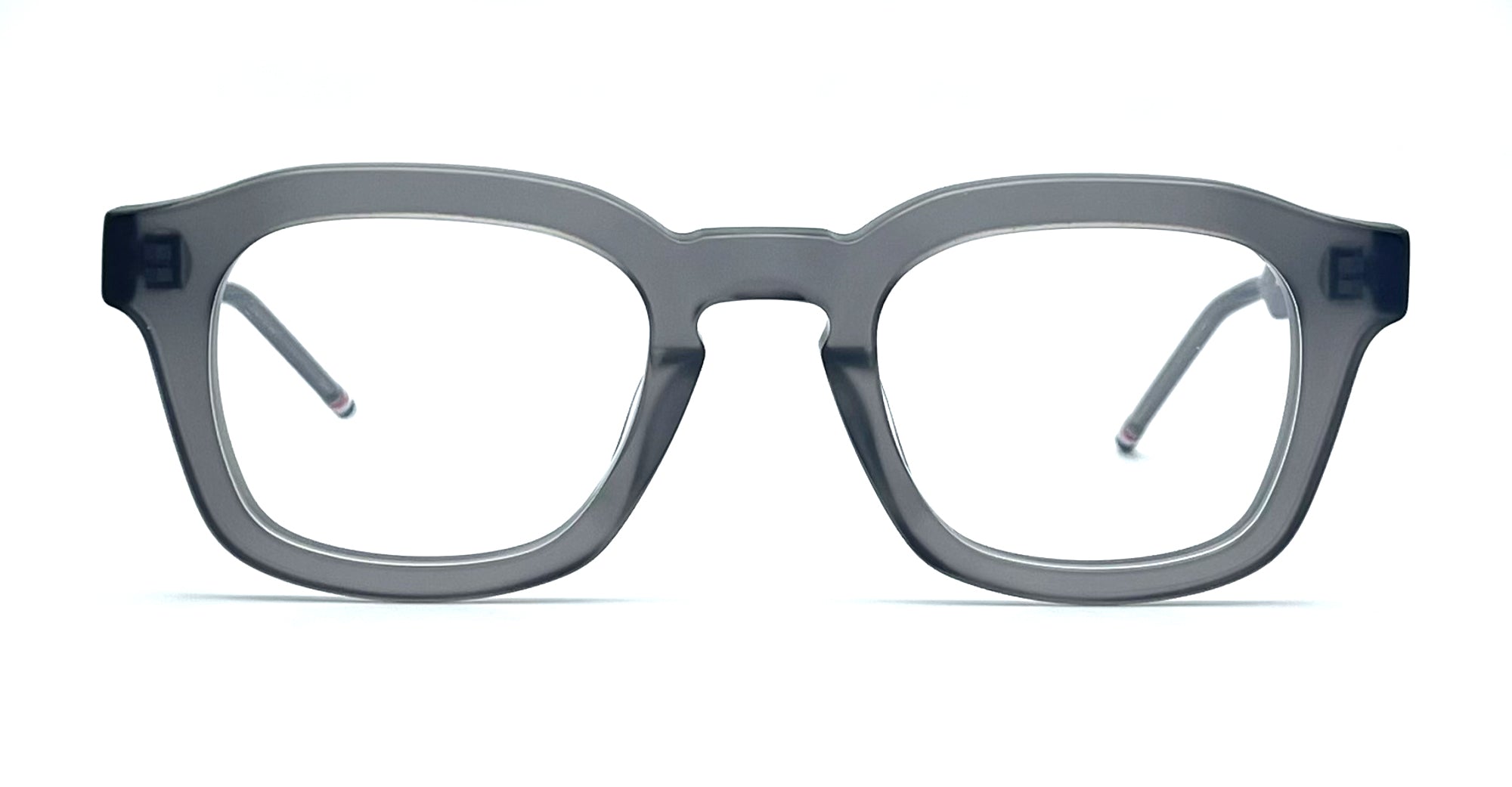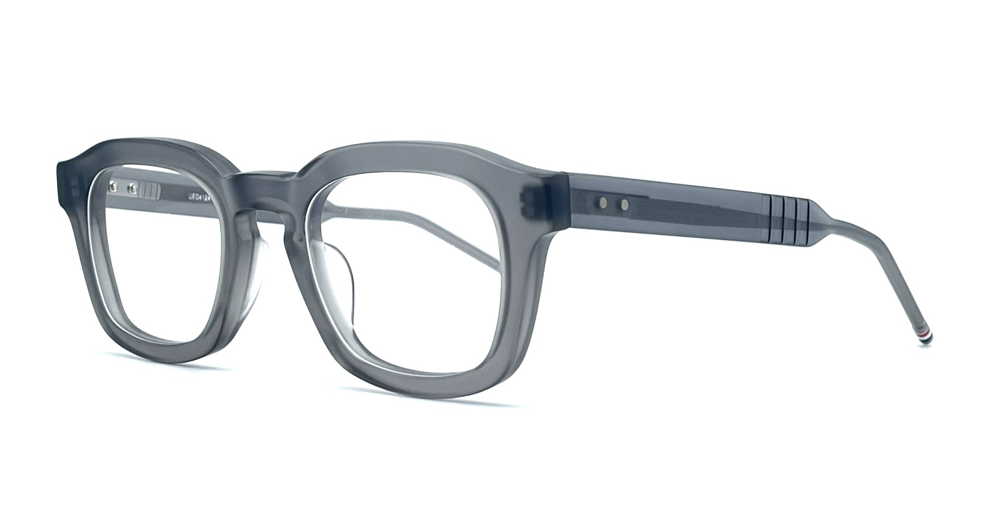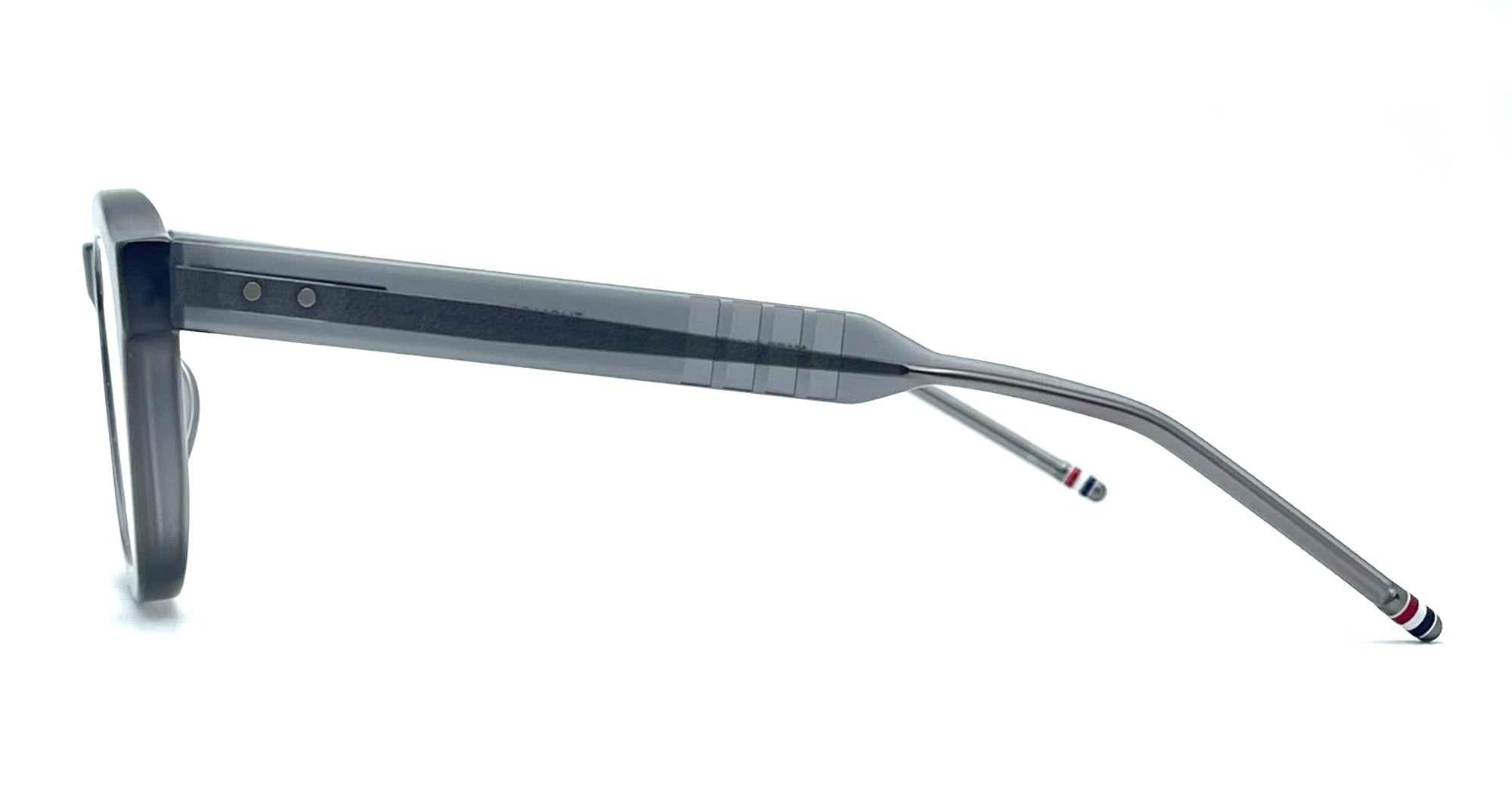 Thom Browne RECTANGULAR - LIGHT GREY RX (UEO412A-G0002-060-48) are rectangular eyeglasses made in Japan. They feature transparent grey acetate frame, signature 4-bar, iconic Thom Browne striped enamel temple tips.