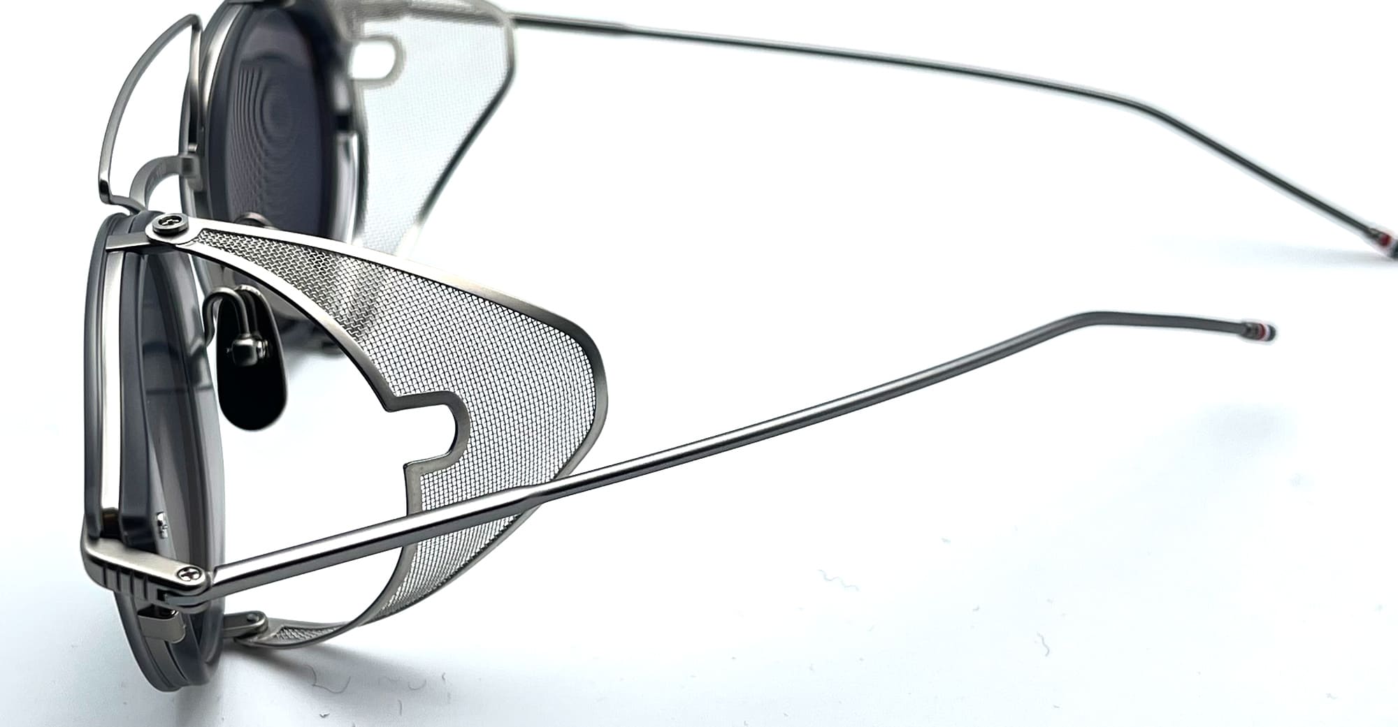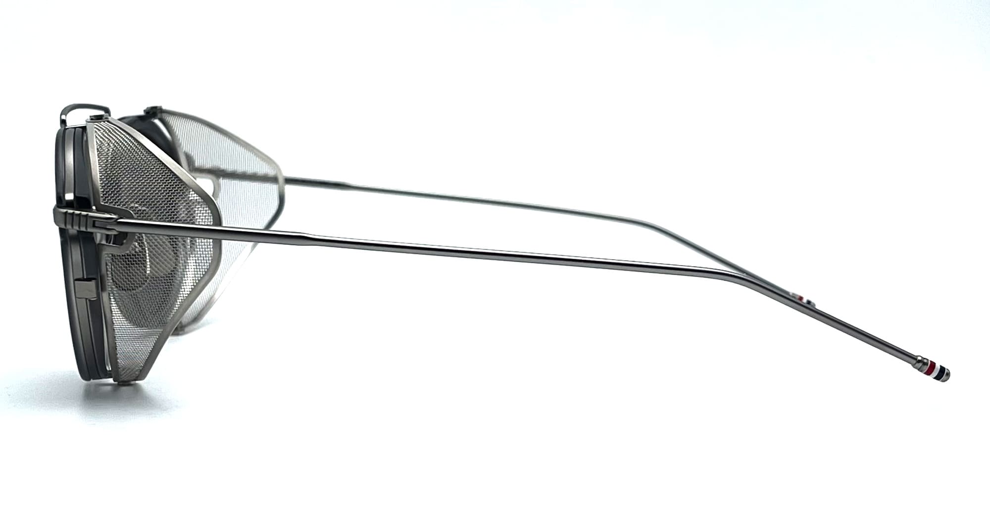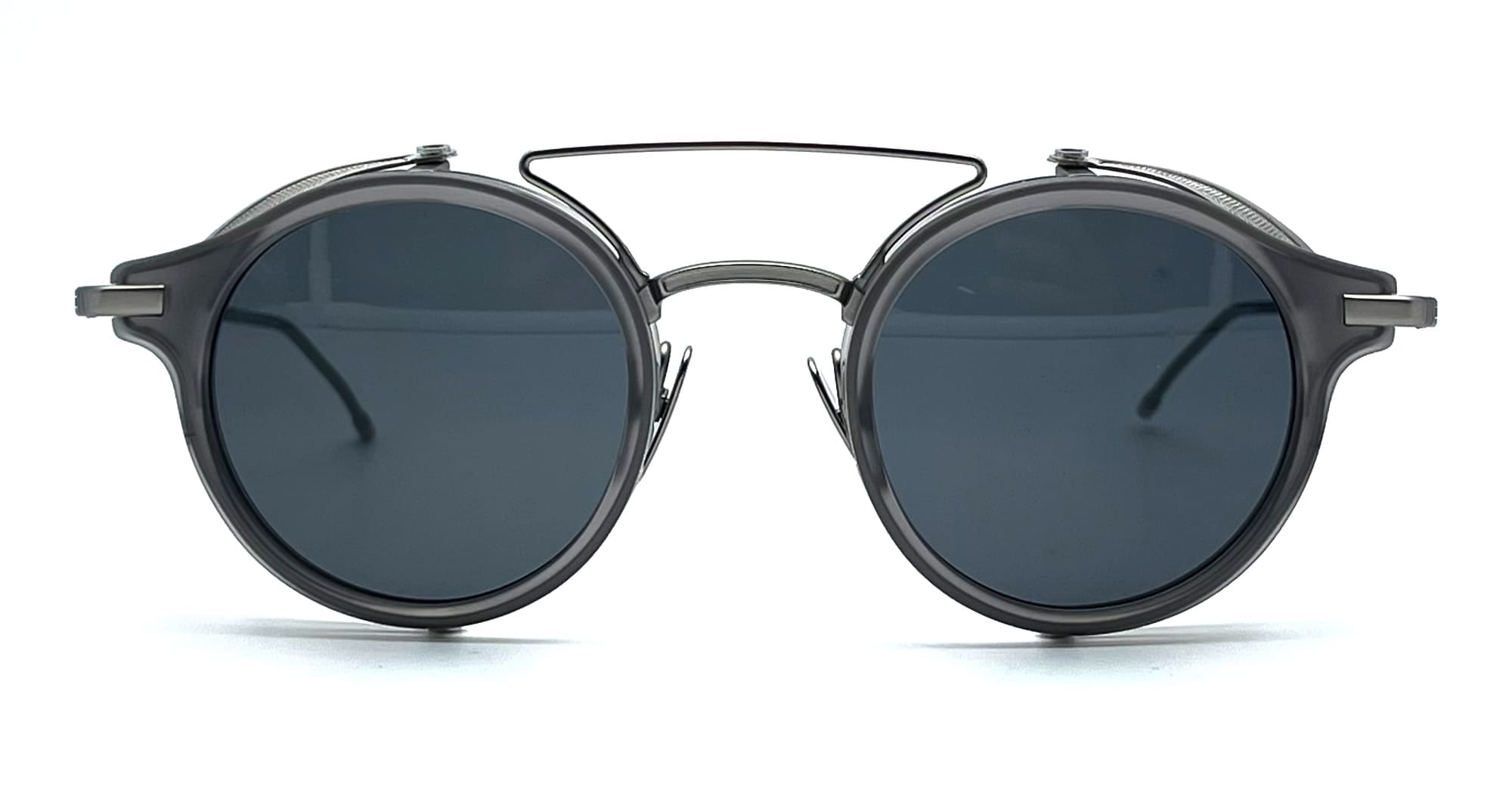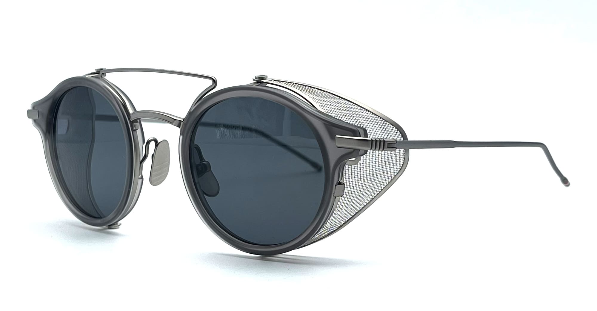 Thom Browne ROUND - LIGHT GREY (UES804A-G0003-068-45) are round aviator sunglasses made in Japan. They feature light grey acetate and titanium structure, titanium brow bar, elegant titanium mesh side shields, custom titanium nose pads, and grey lens with 100% UV protection.