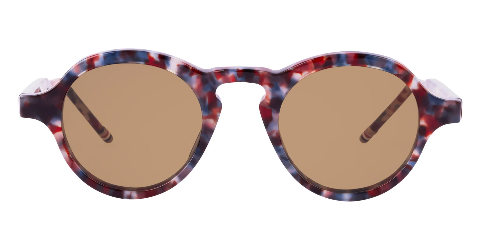 Thom Browne ROUND - RWB TORTOISE (UES926A-G0002-960-47) are elegant round sunglasses, part of the Thom Brown eyewear collection. They feature red tortoise Japanese acetate frame, signature 4-bars, iconic Thom Browne striped enamel temple tips, and brown lens with 100% UV protection.