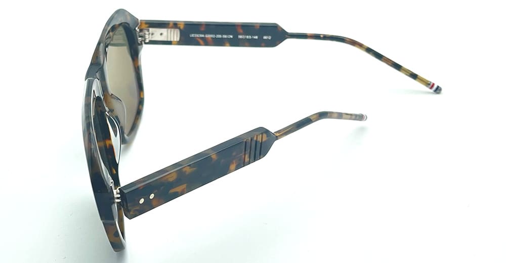 Thom Browne SQUARE - DARK BROWN (UES928A-G0002-205-56-2N) are elegant squared sunglasses made in Japan, part of the exclusive Thom Brown Eyewear Collection. They feature dark brown acetate frame, wide acetate temples with signature 4-bars, iconic Thom Browne striped enamel temple tips, and green lens with 100% UV protection.